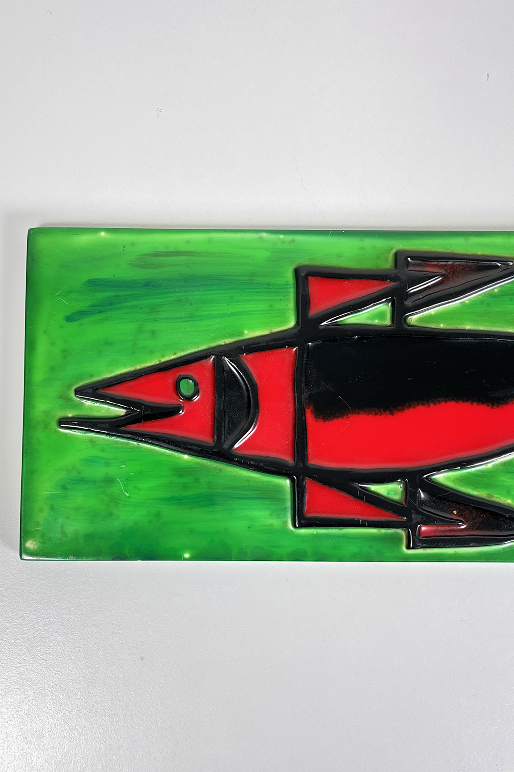 Handmade tiles with fish made by Atelier Boillat from Basel. This colourful wall decoration is in a good vintage condition.