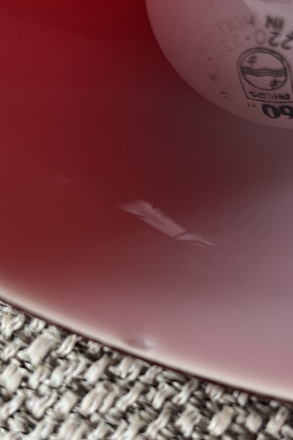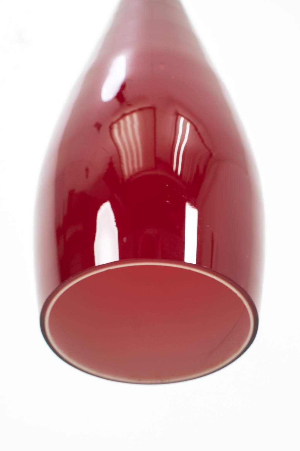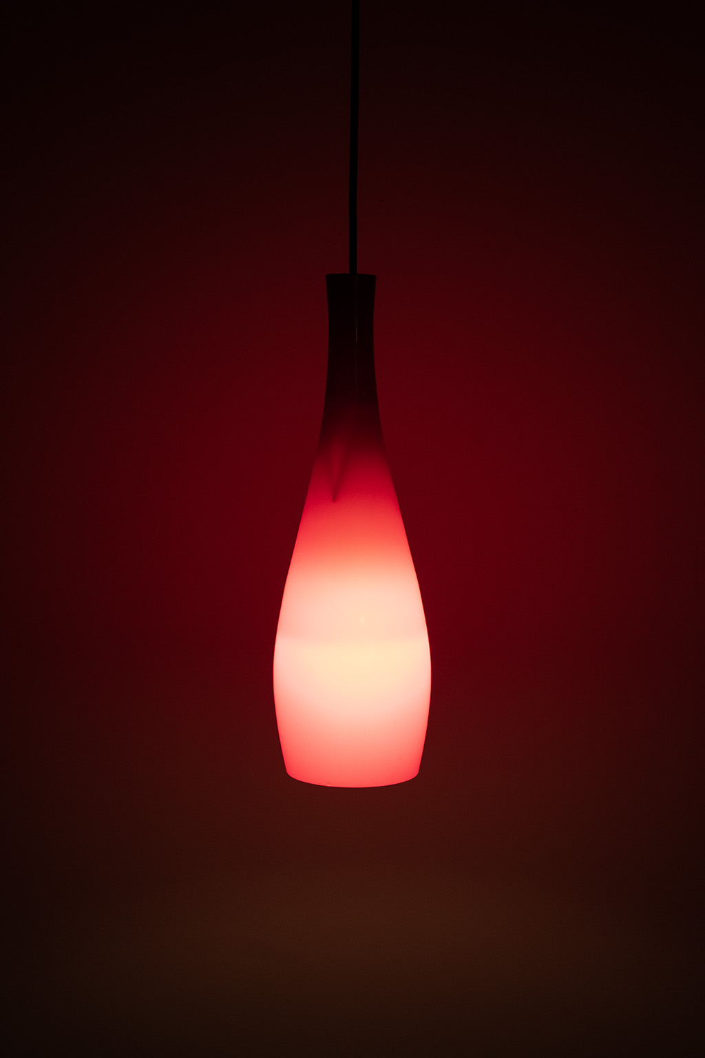 Hanging lamp by Jacob E. Bang; designed for Danish brand Fog & Mørup in the 60/70’s. The lamp with its sophisticated shape is made from white glass with transparent red glass on the outside. There are two small chips in the white glass but furthermore the lamp is in good vintage condition.