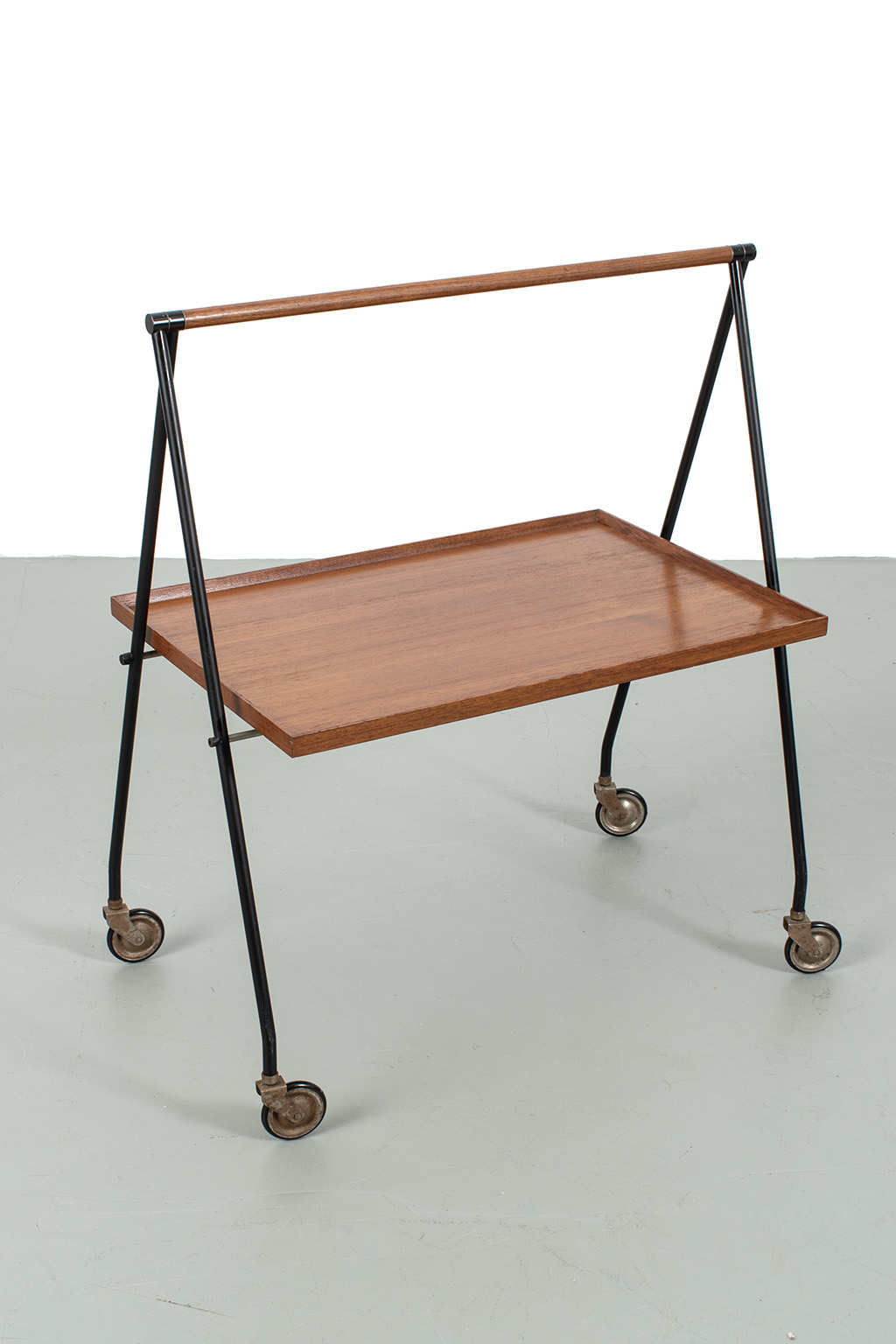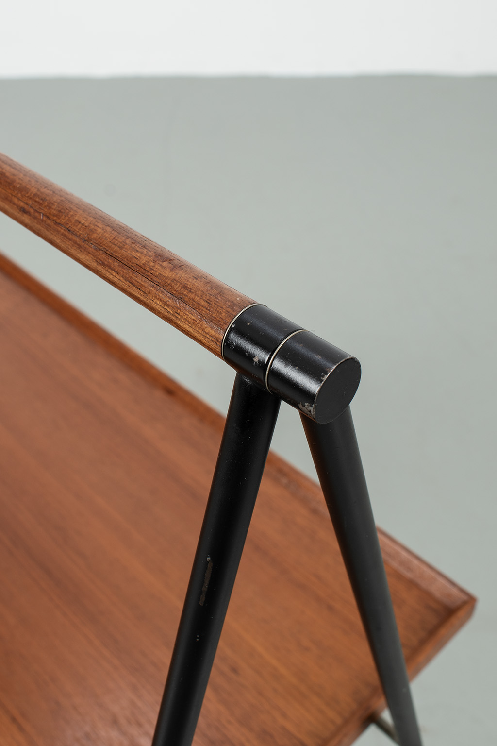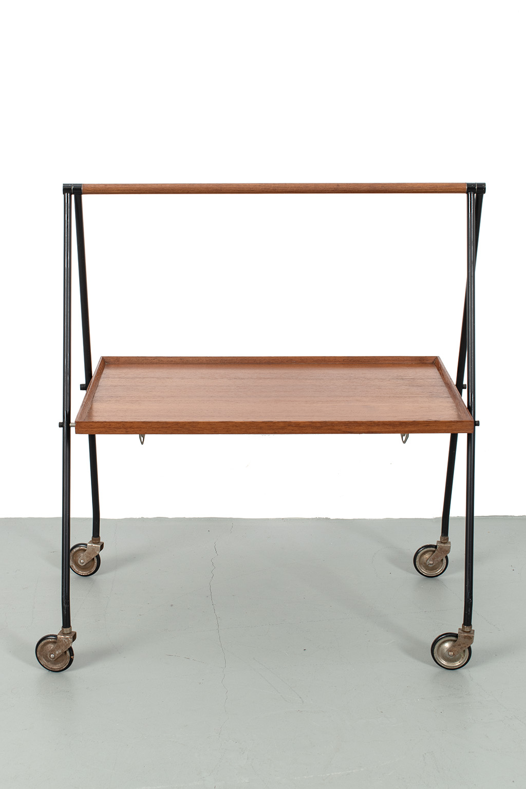 Minimalistic serving tray or trolley from the sixties. This stylish tray is foldable and has a teak top. The metal has charming patina. Furthermore this trolley is in good condition.