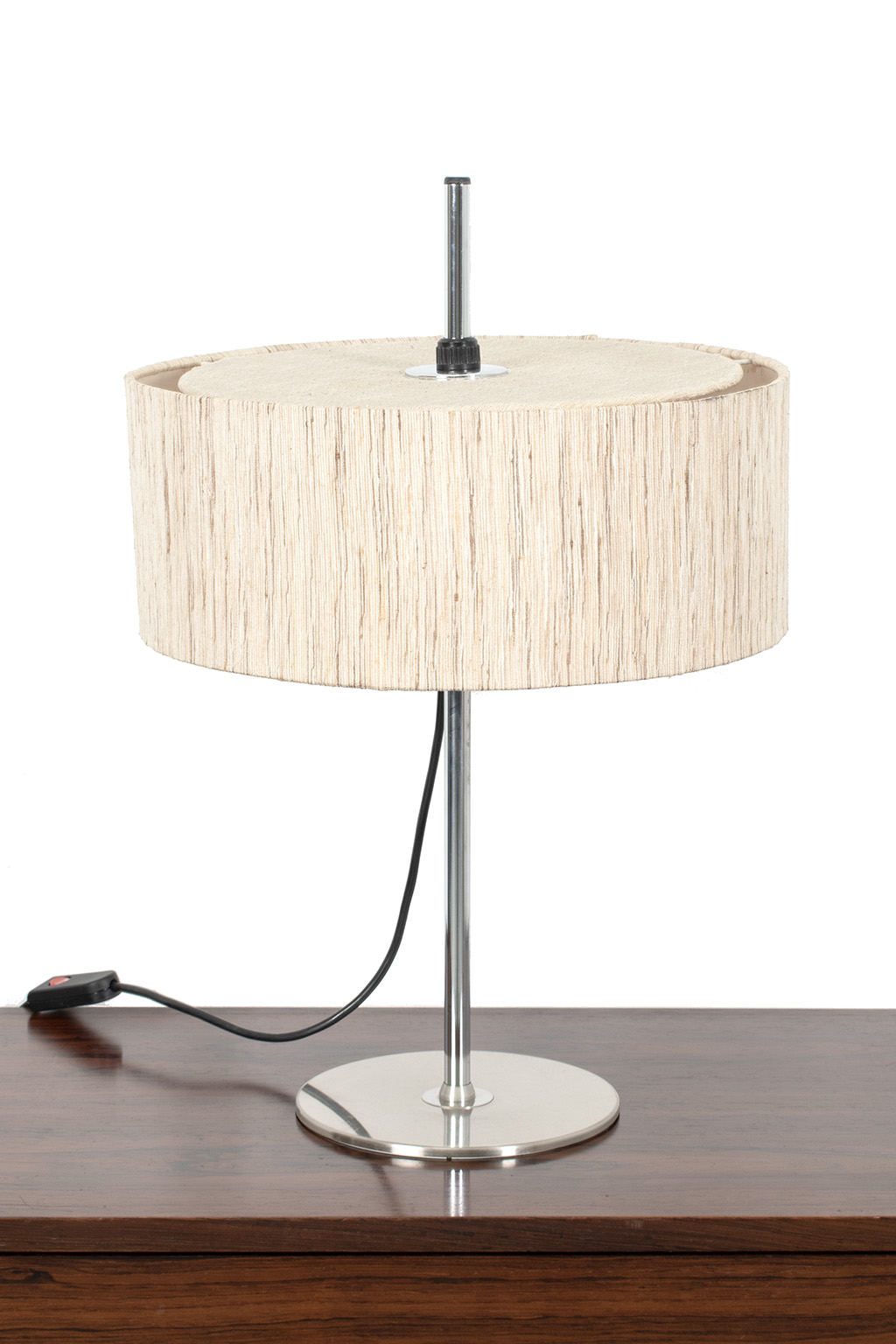 Staff height adjustable table lamp with chrome stand and a beautiful shade in natural textured fabric. The shade is covered at the top with a suitable but different fabric. Originally the cable was held by a clamp on the base but that is missing unfortunately. The lamp is in good vintage condition.