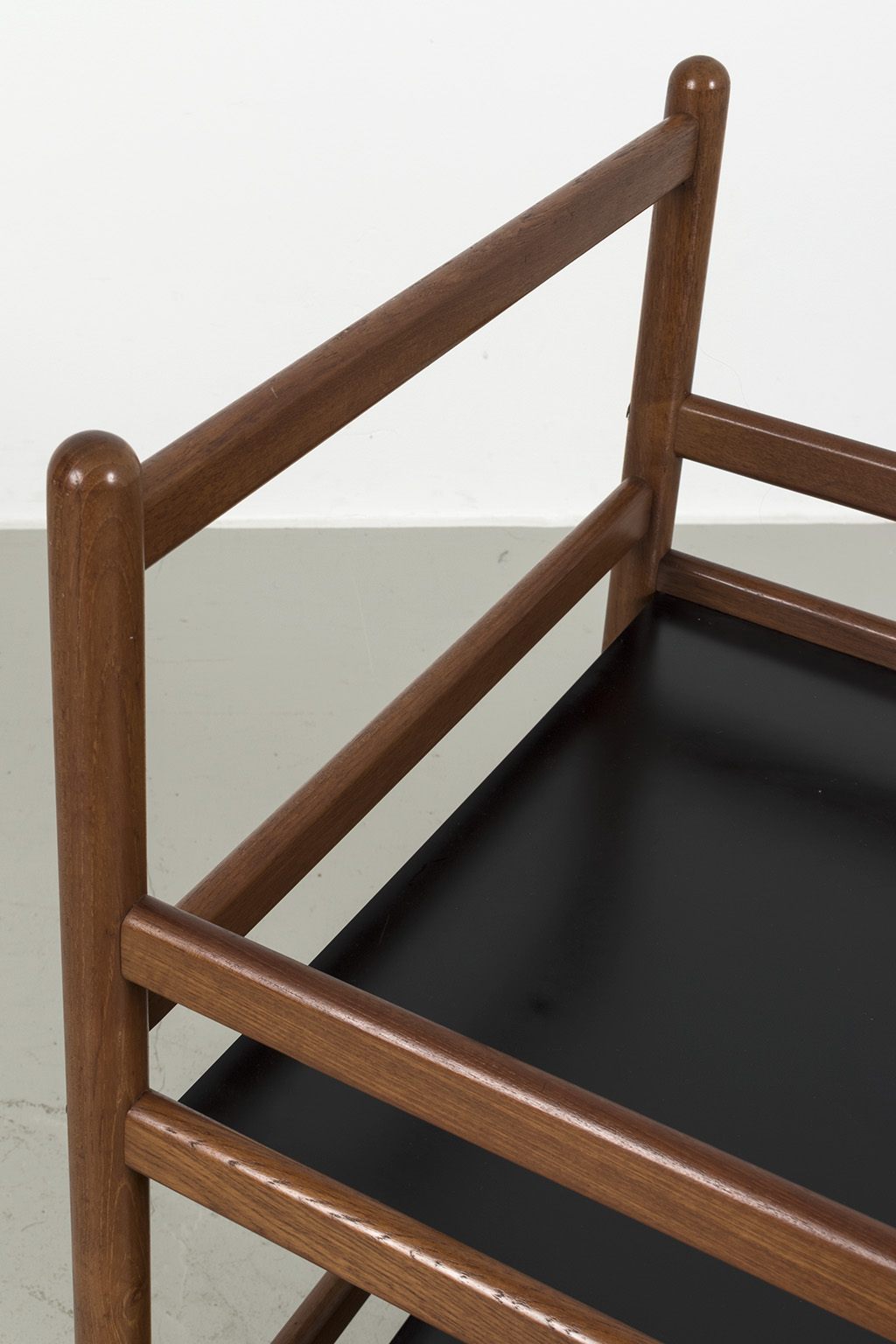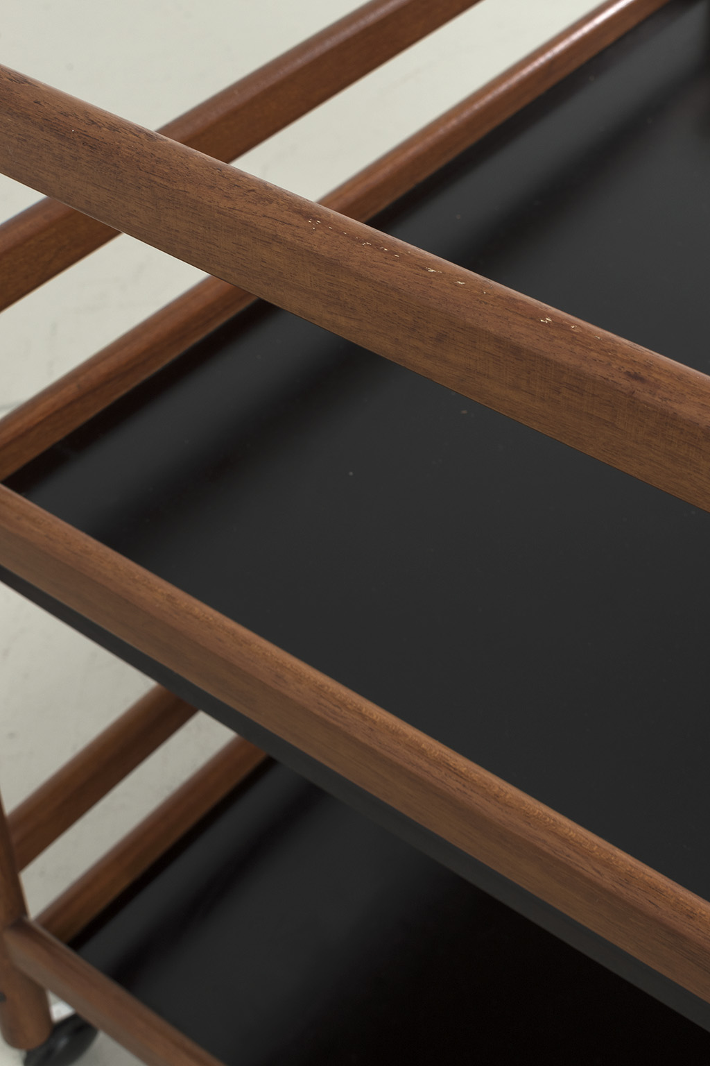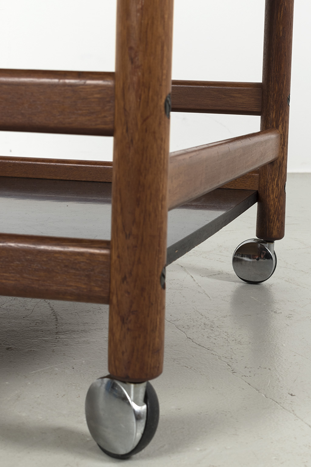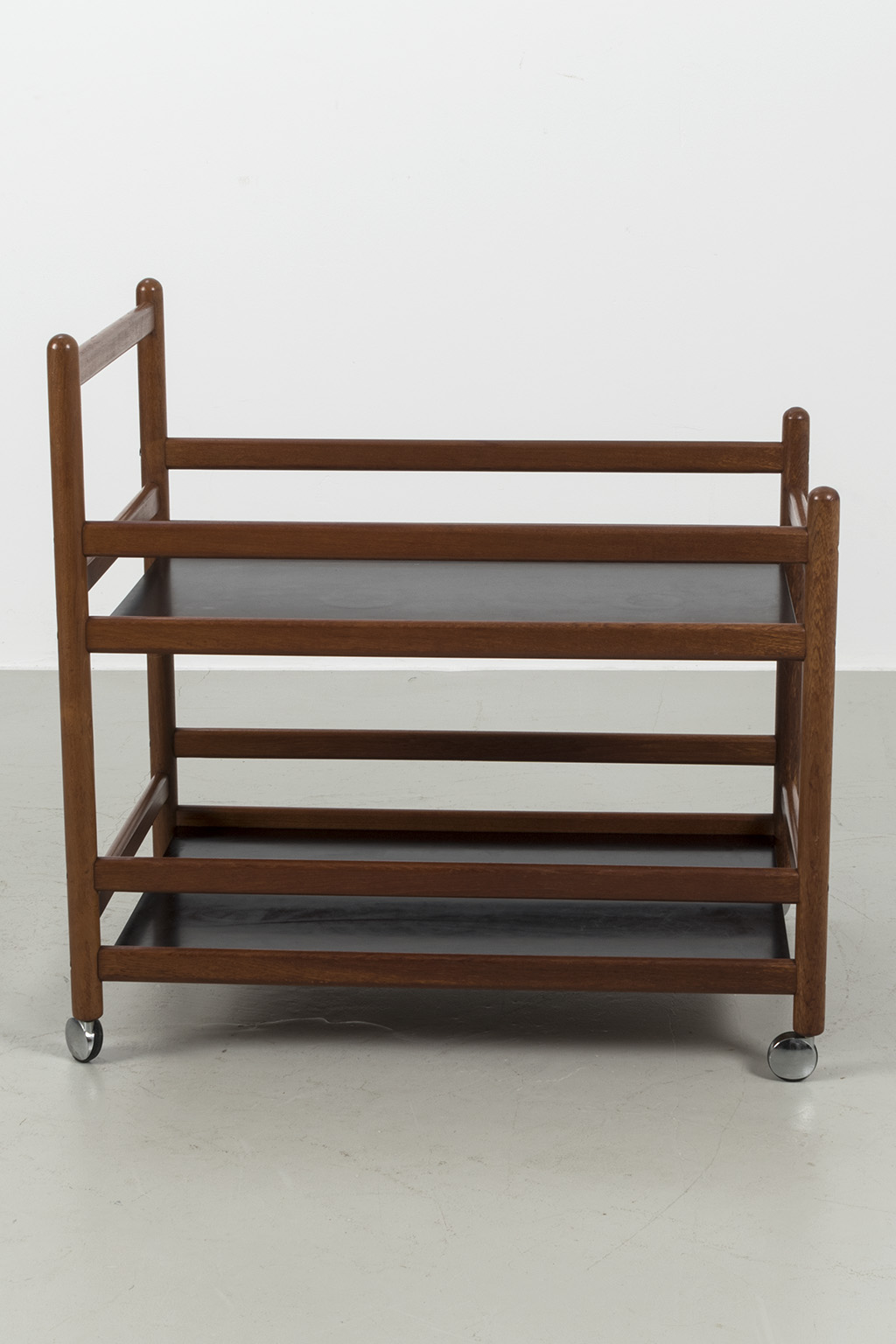 This wonderful trolley by Niels Erik & Glasdam Jensen has four chrome wheels. The trolley also has two black laminated shelves. This functional table can be used not only as a bar trolley but also as decoration or a side table. The trolley has some very small paint spots (see photo 7). Still in good vintage condition.