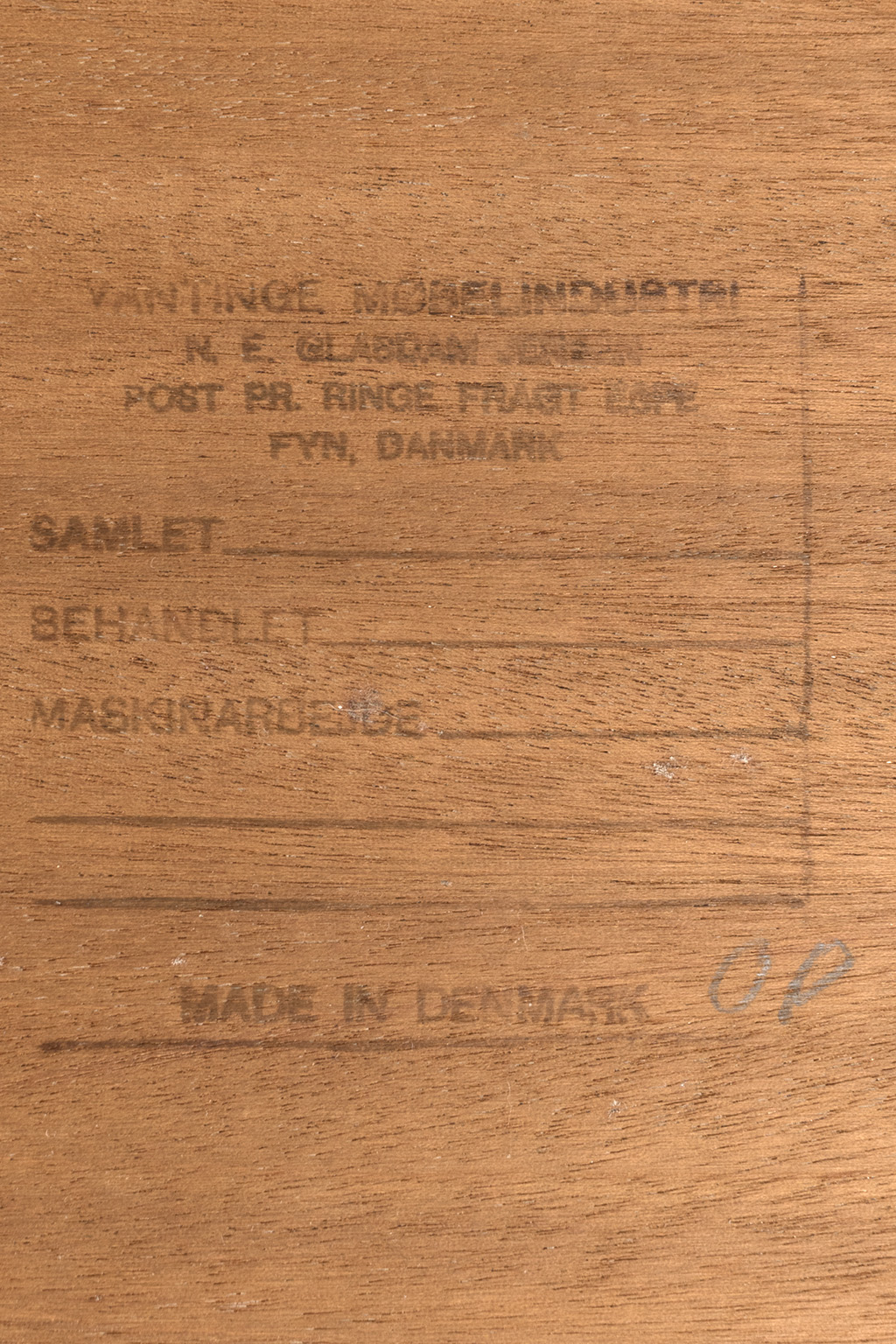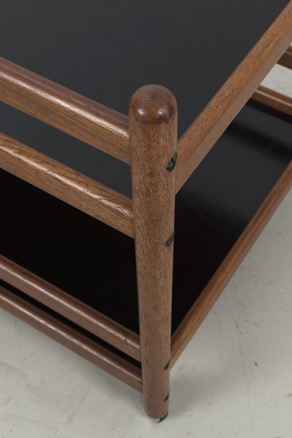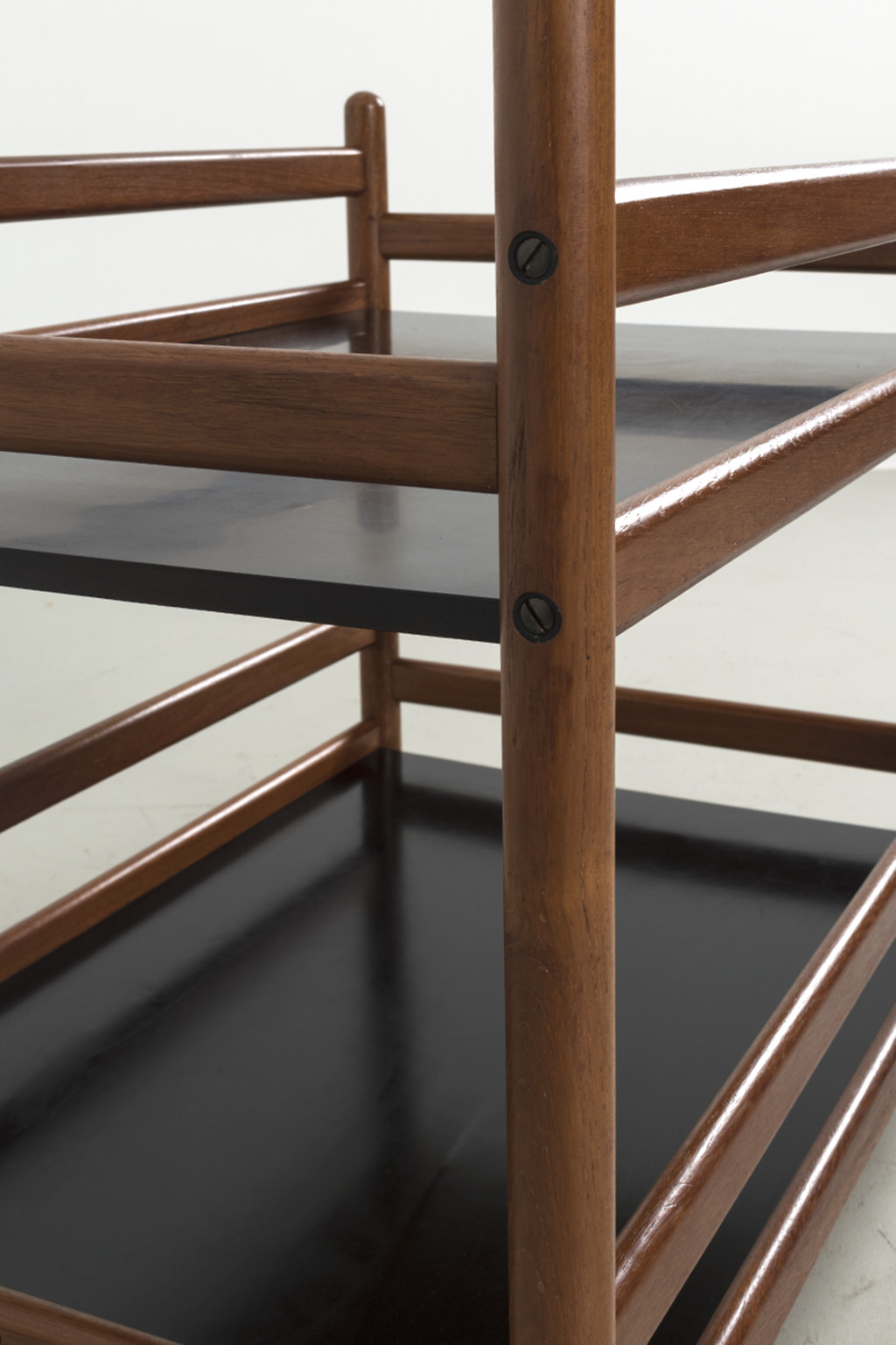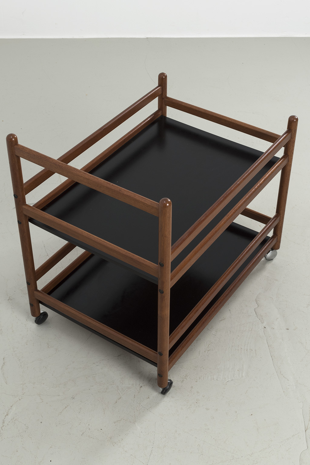 This wonderful trolley by Niels Erik & Glasdam Jensen has four chrome wheels. The trolley also has two black laminated shelves. This functional table can be used not only as a bar trolley but also as decoration or a side table. The trolley has some very small paint spots (see photo 7). Still in good vintage condition.