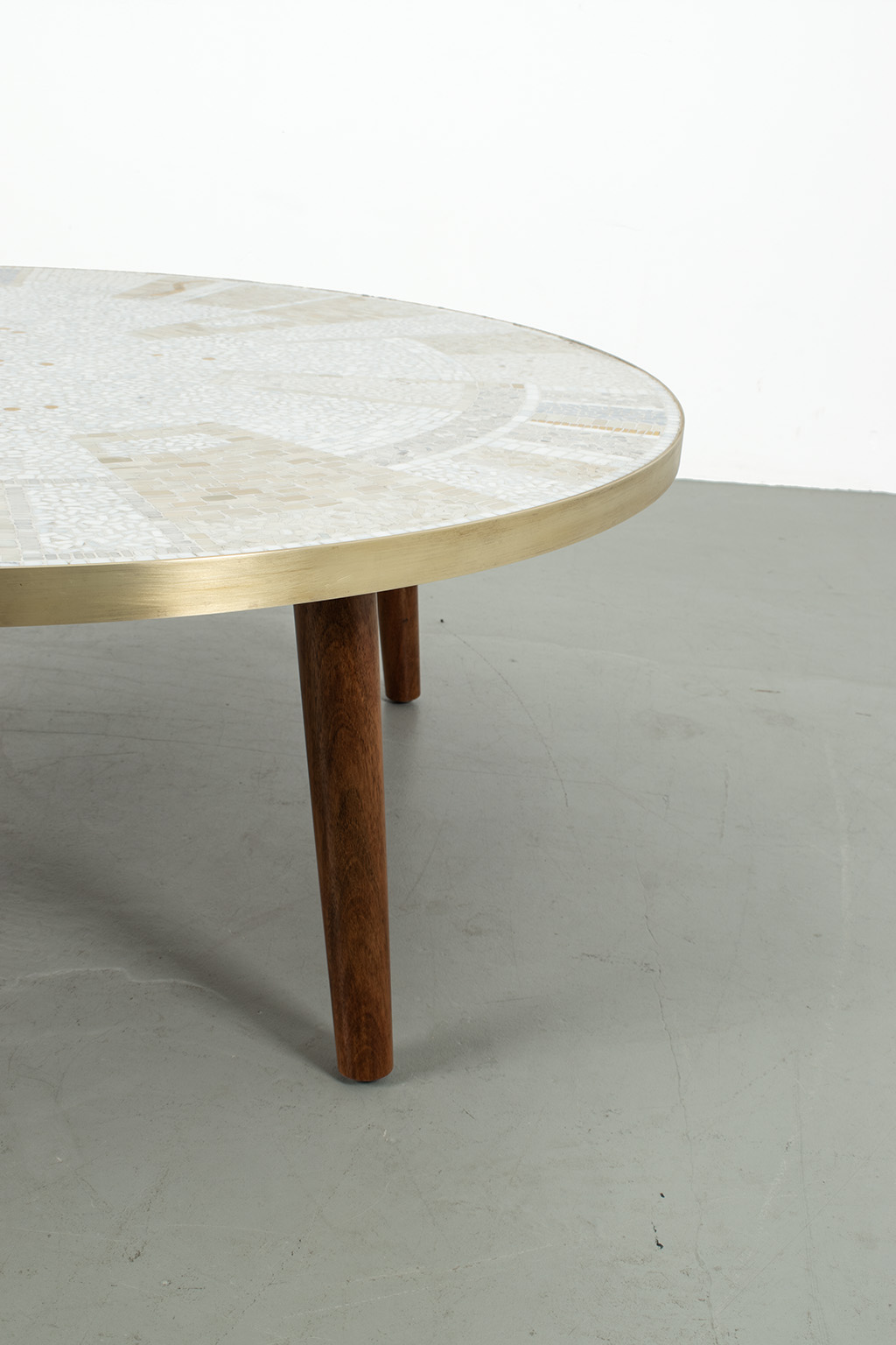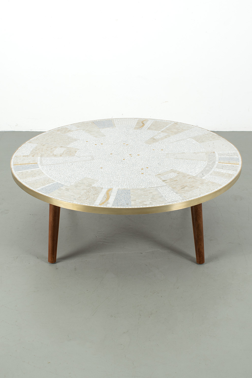 Prachtige vintage salontafel van Berthold Müller uit de jaren 50 gemaakt van beige/wit/grijs mozaïek met messing details. De tafel heeft wat gebruikssporen passend bij de leeftijd zoals wat patina op de messing rand, wat eigenlijk heel charmant is. De tafelpoten zijn ingekort zodat de hoogte past volgens de huidige maatstaven. In een prima vintage staat.
