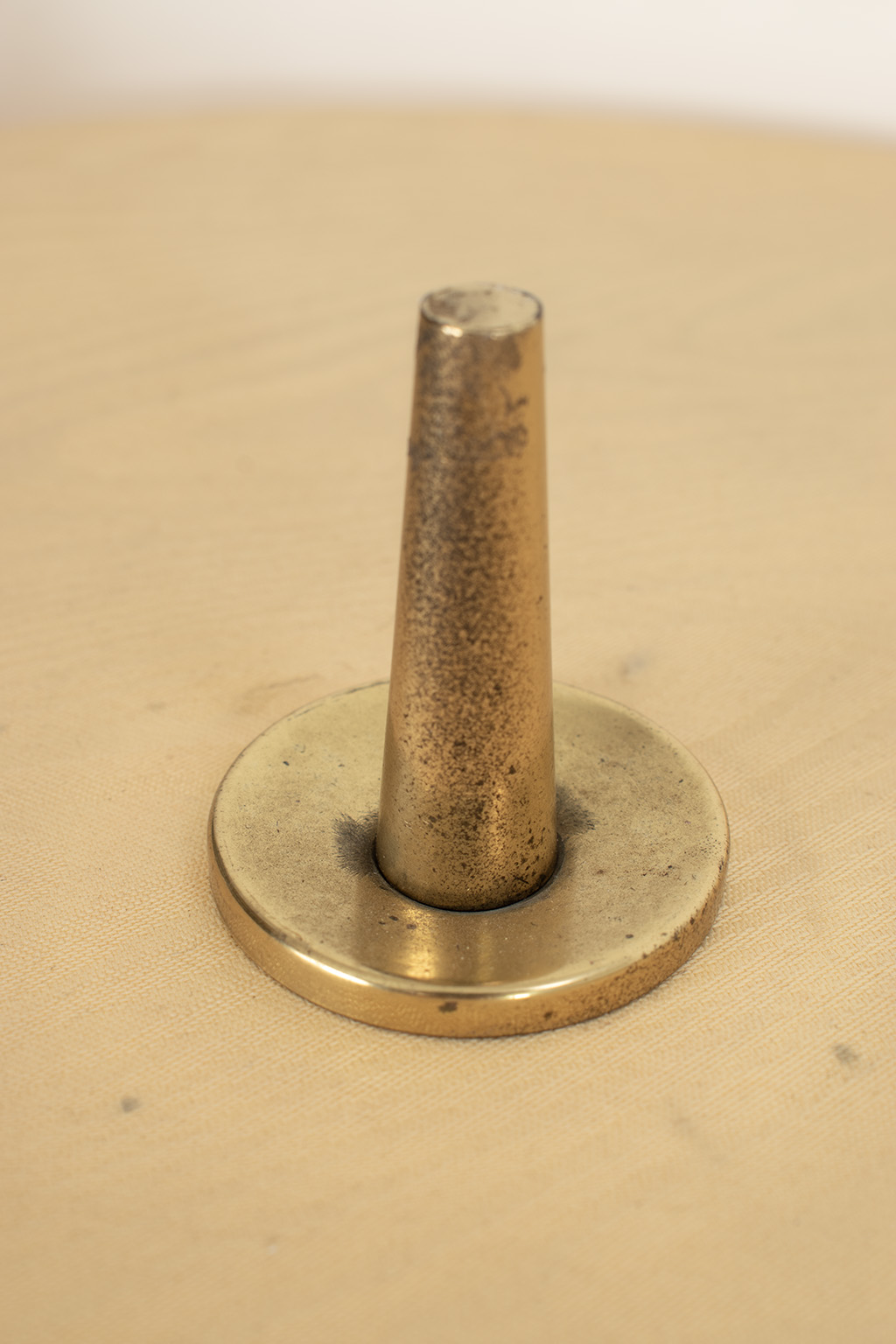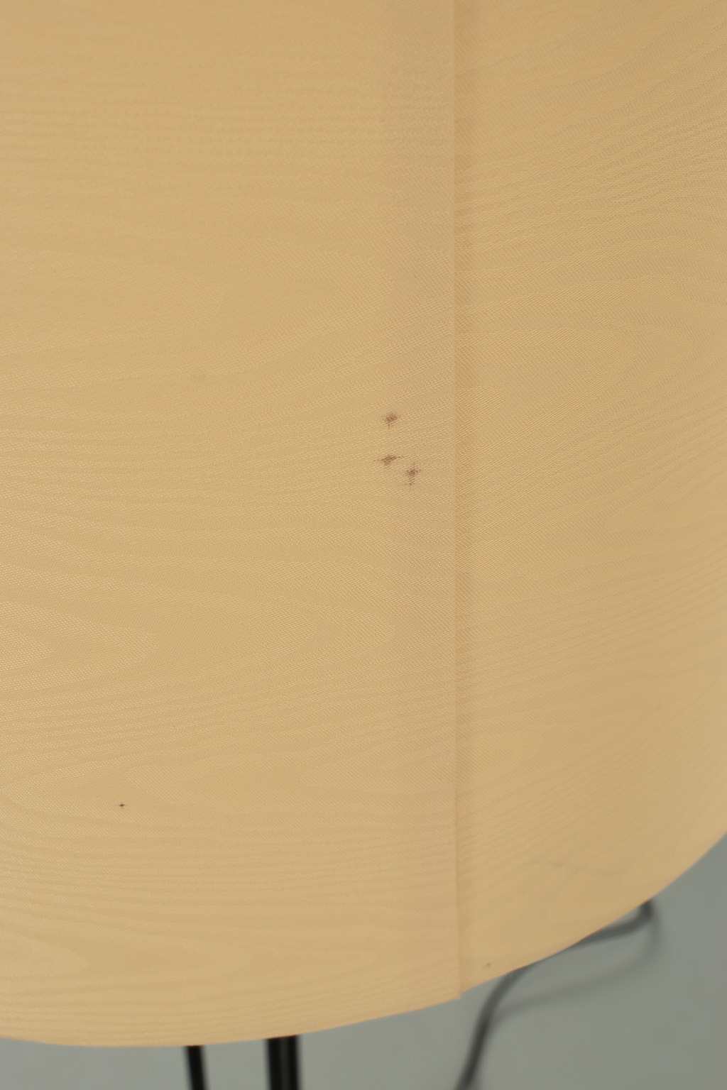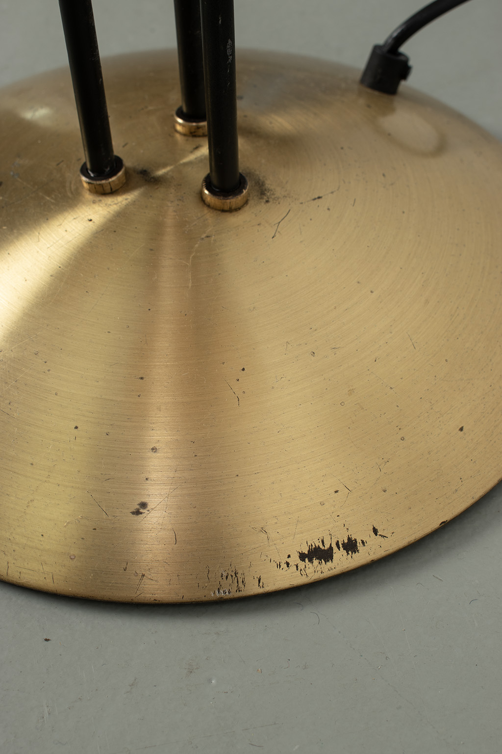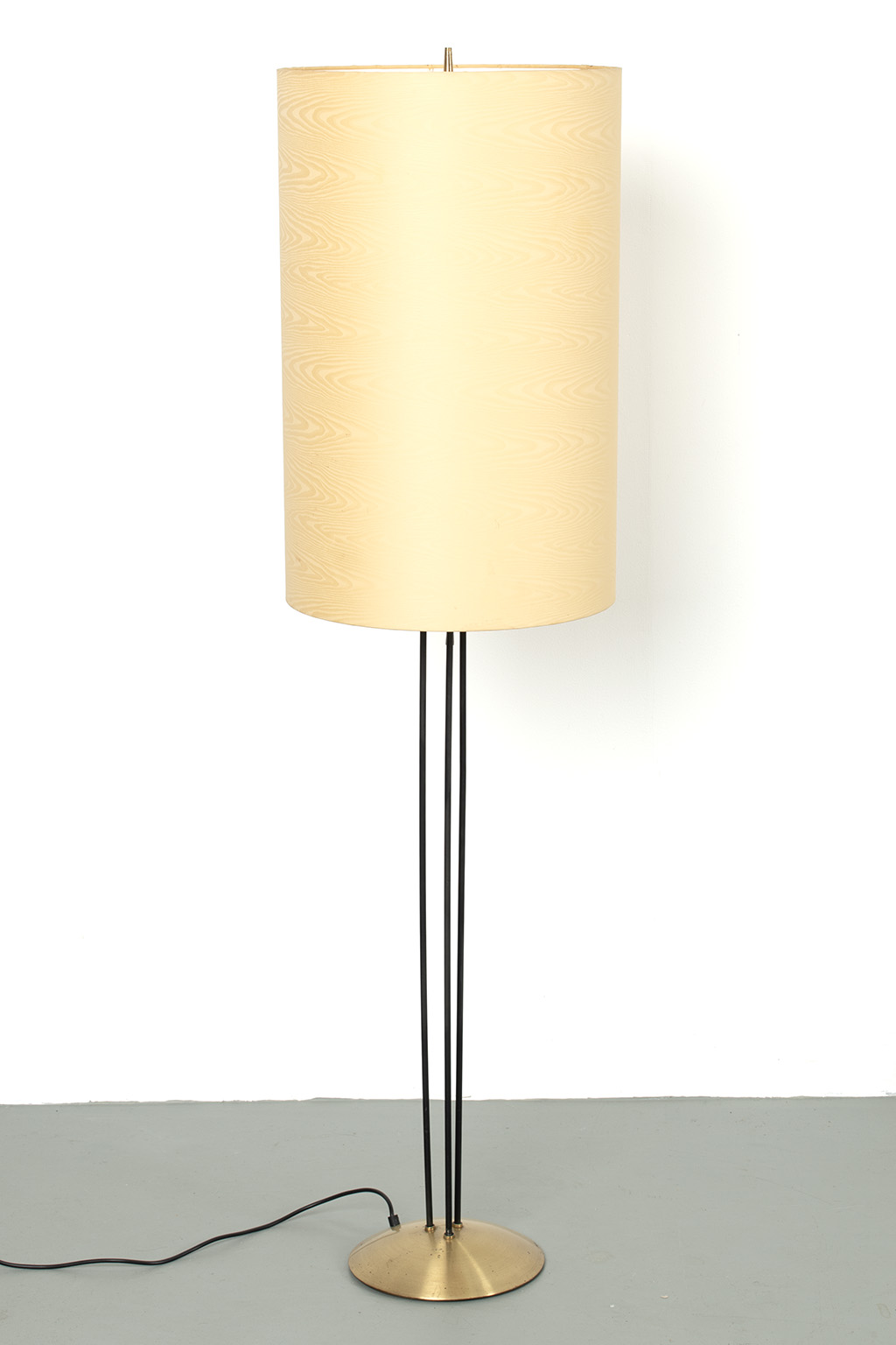 50s Vintage vloerlamp met goudkleurige metalen voet en stoffen kap.