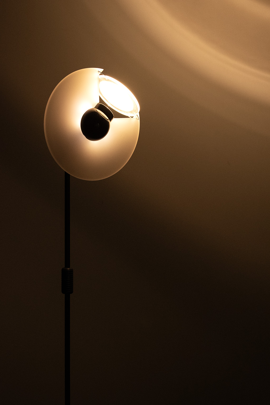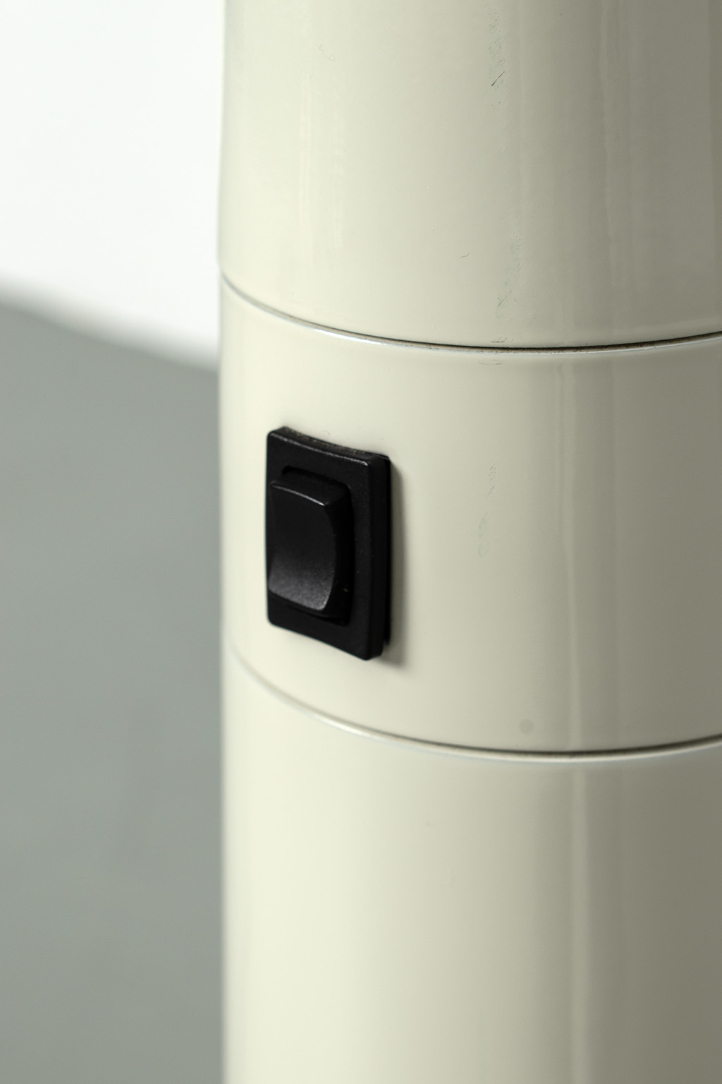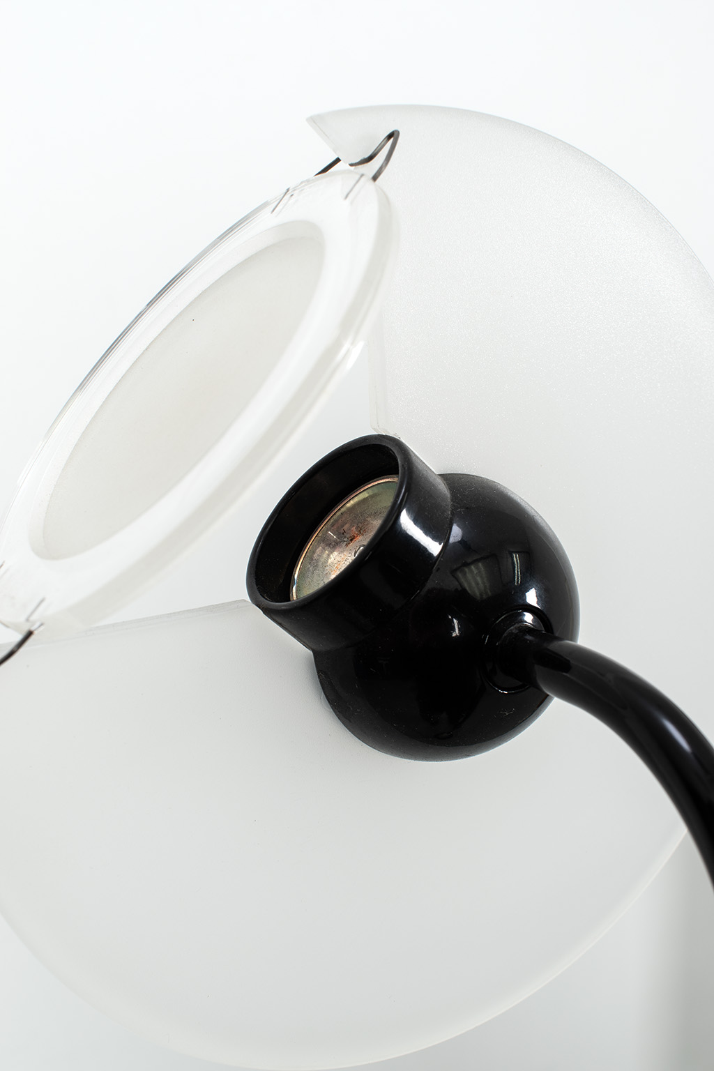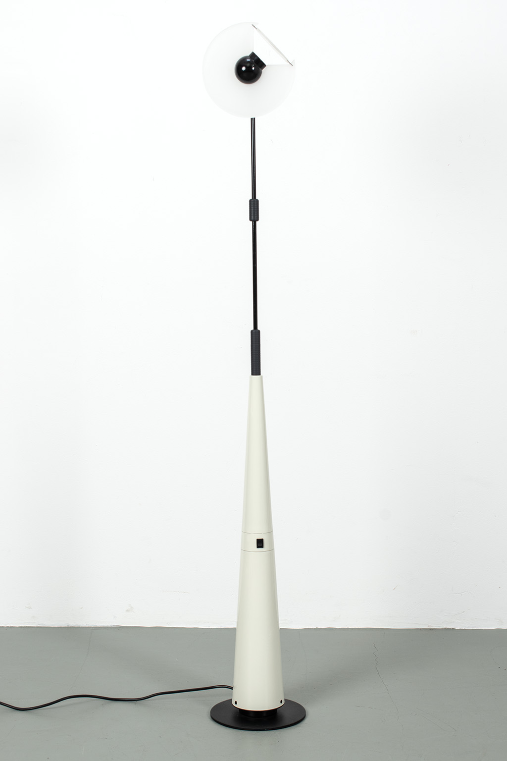 Arteluce vloerlamp Club 1195 ontworpen door Giuseppe Ramella. Een postmoderne jaren 80 halogeen lamp gemaakt van kunststof en metaal met een schakelaar op de voet. Het kapje is verstelbaar. Op de voet zit een deukje maar verder is de lamp in een goede vintage staat.