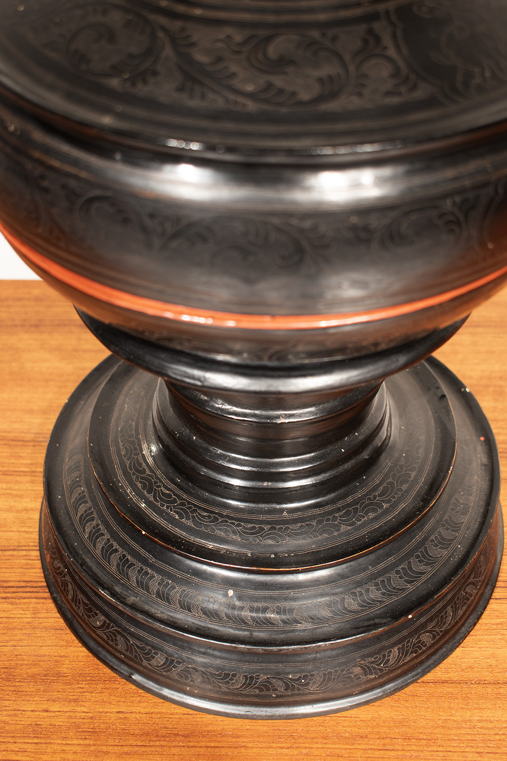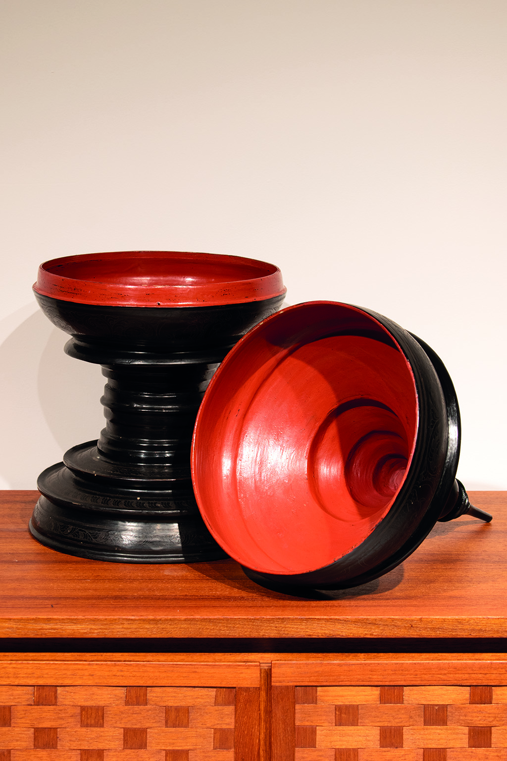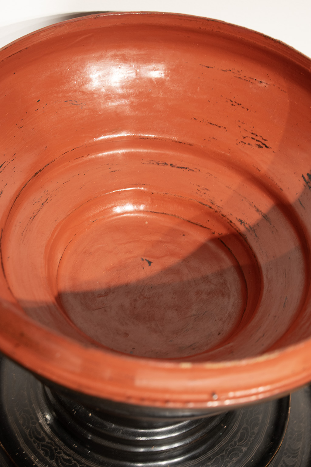 Birmese offerschaal uit de 20e eeuw uit de privécollectie van Angelique en Christiaan. Gemaakt van lichtgewicht hout met prachtige versieringen. De schaal is van buiten zwart gelakt. De binnenkant is gelakt in ossenbloedrood.