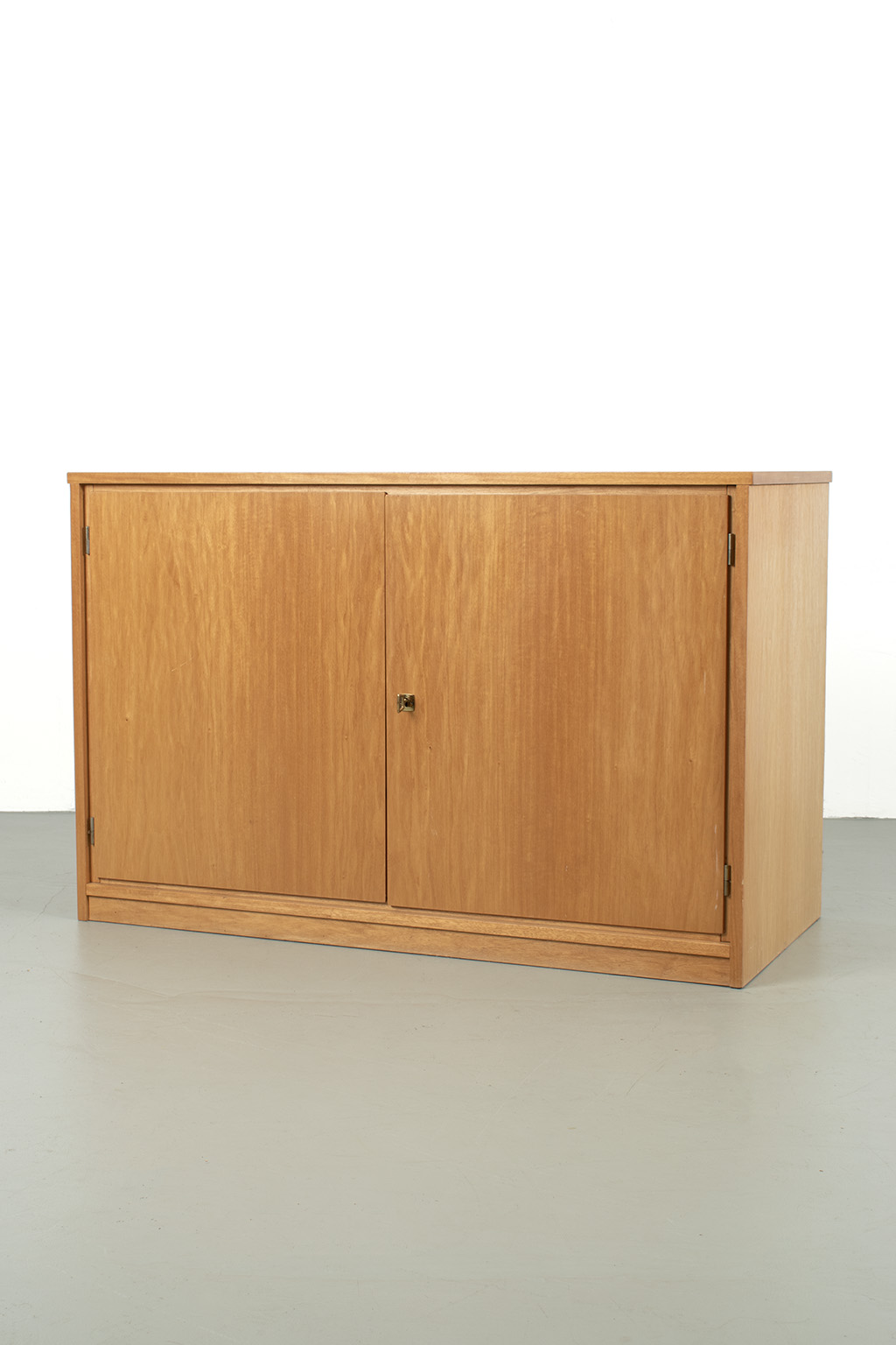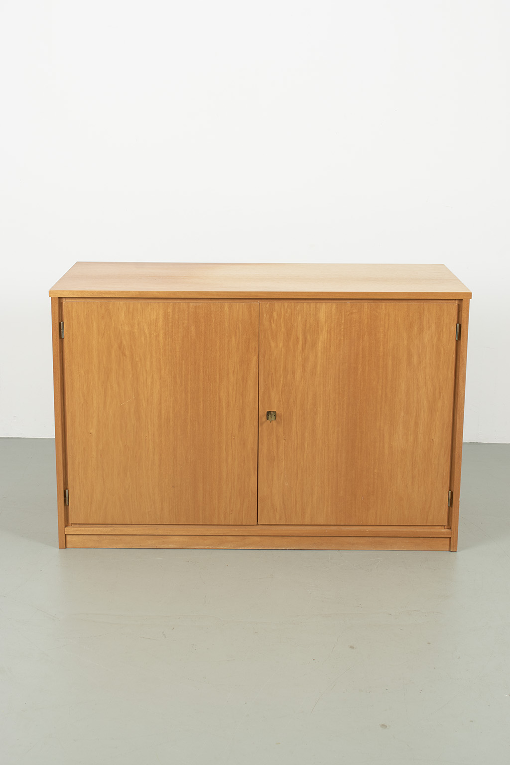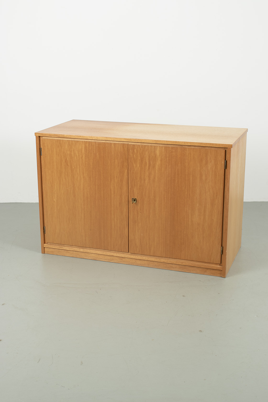 Blond fineer 2-deurs kast met veel bergruimte. Kan eventueel ook dienst doen als commode door ruime diepte. Bovenkant heeft duidelijk kleurverschil. Met originele sleutel. In een goede vintage staat.