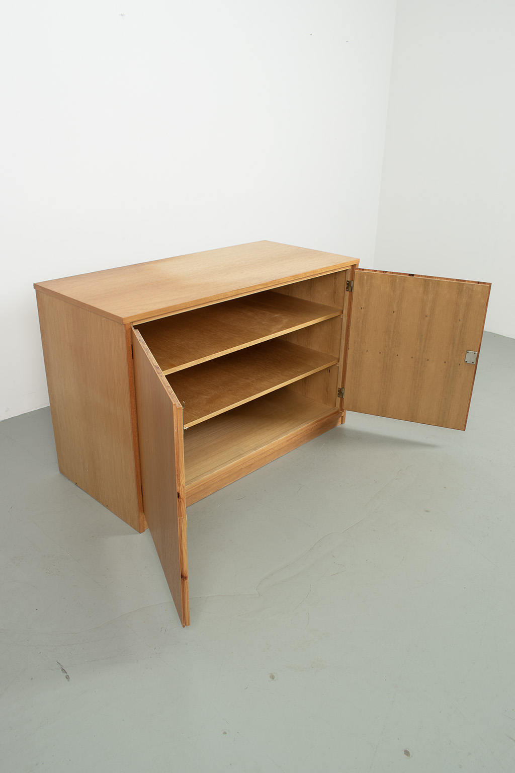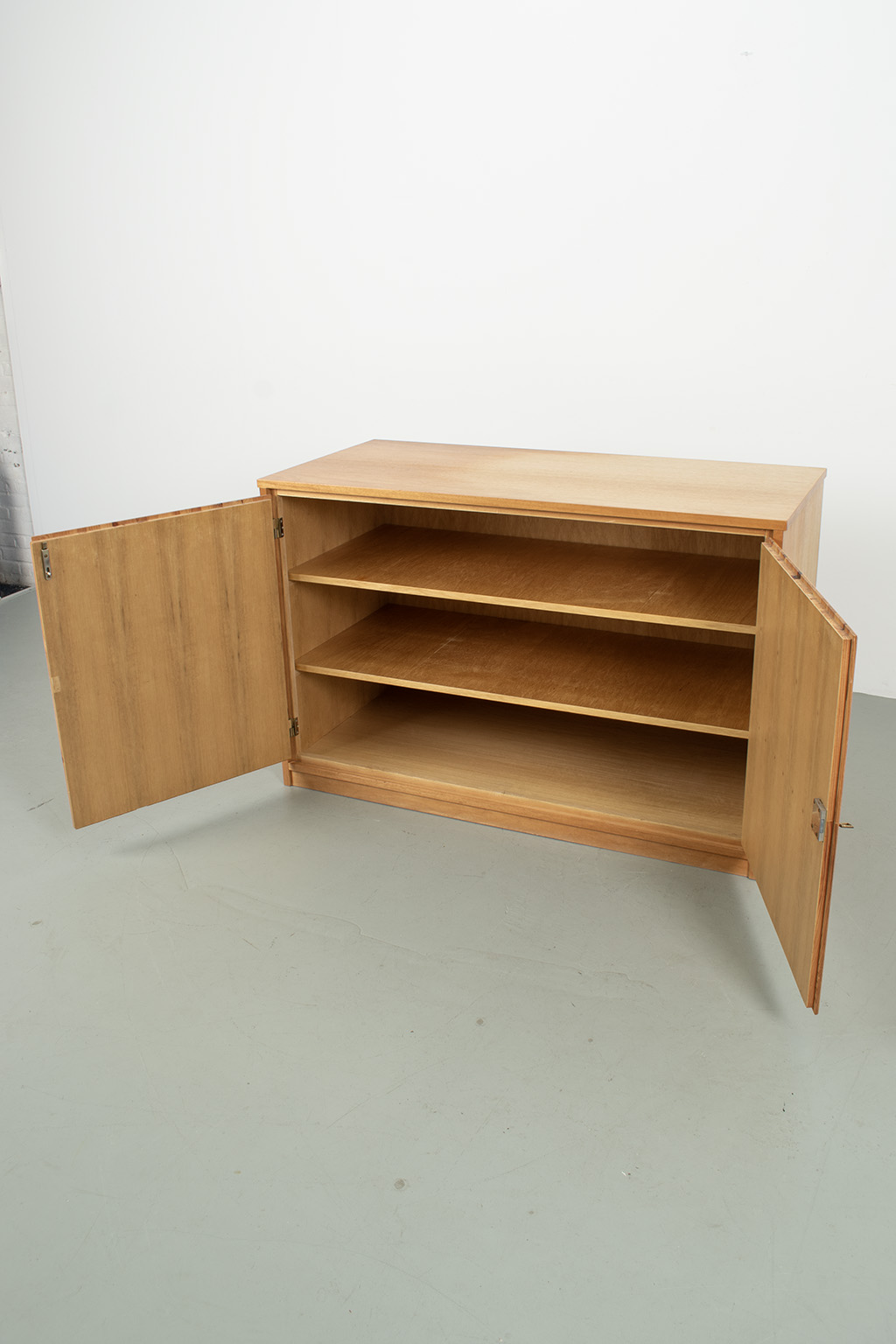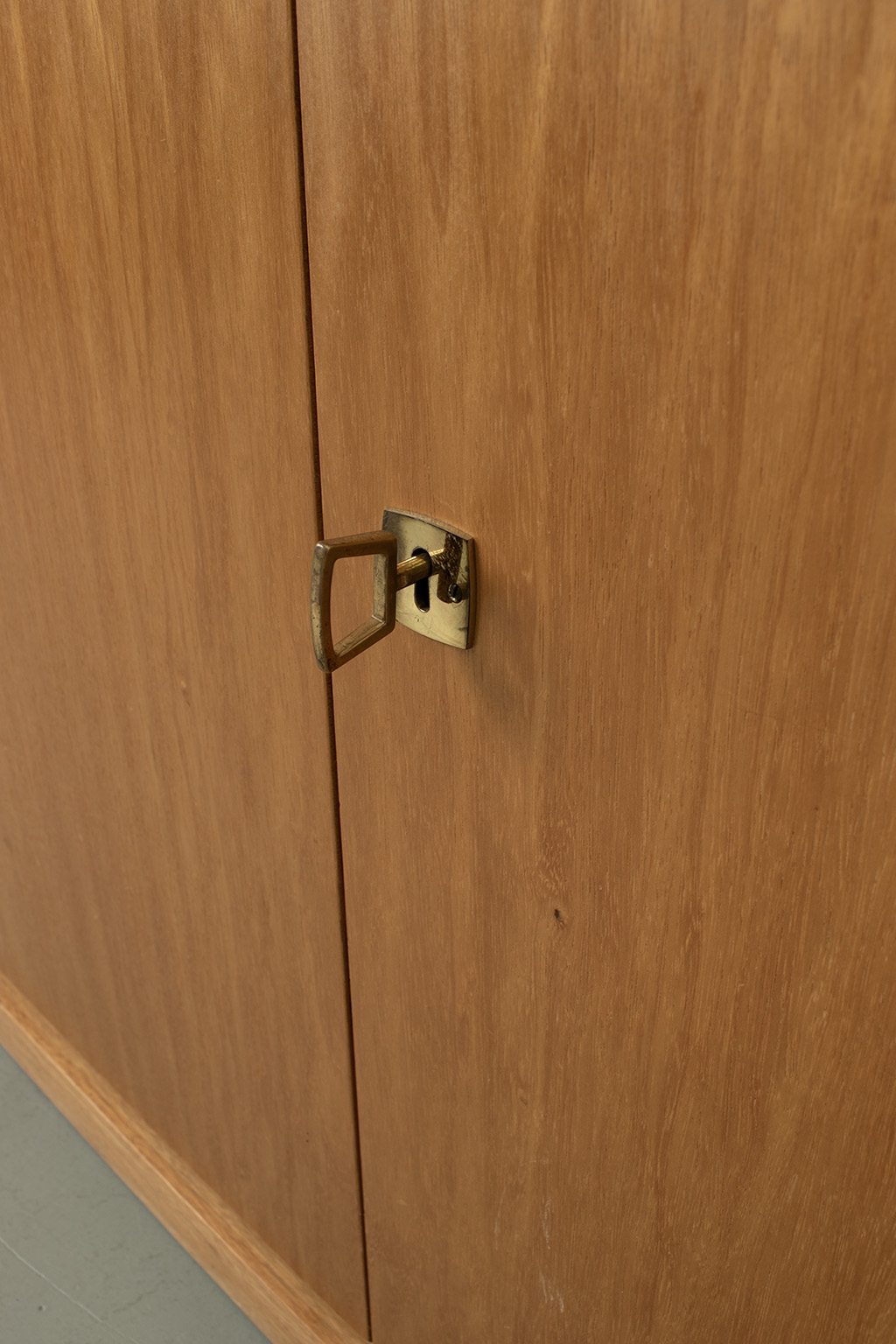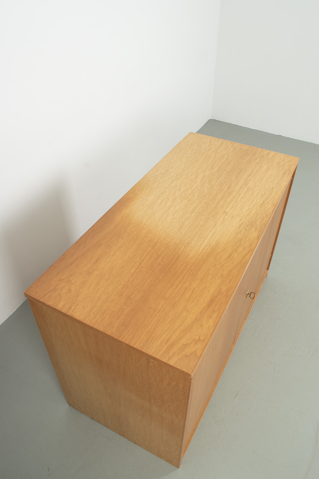 Blond fineer 2-deurs kast met veel bergruimte. Kan eventueel ook dienst doen als commode door ruime diepte. Bovenkant heeft duidelijk kleurverschil. Met originele sleutel. In een goede vintage staat.