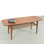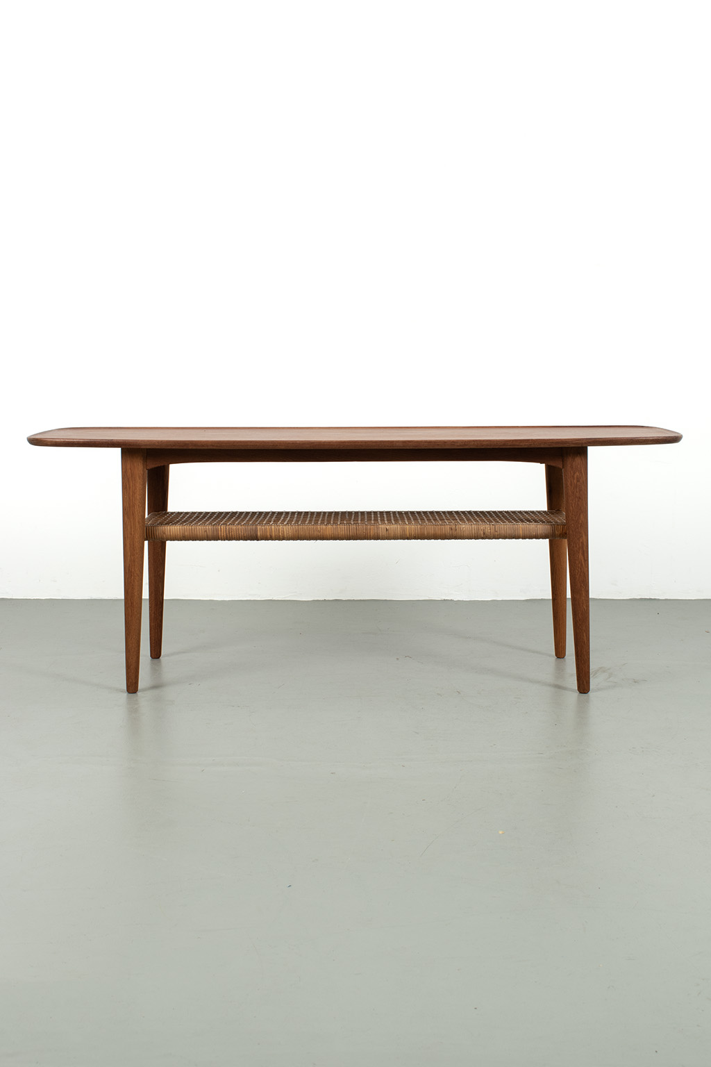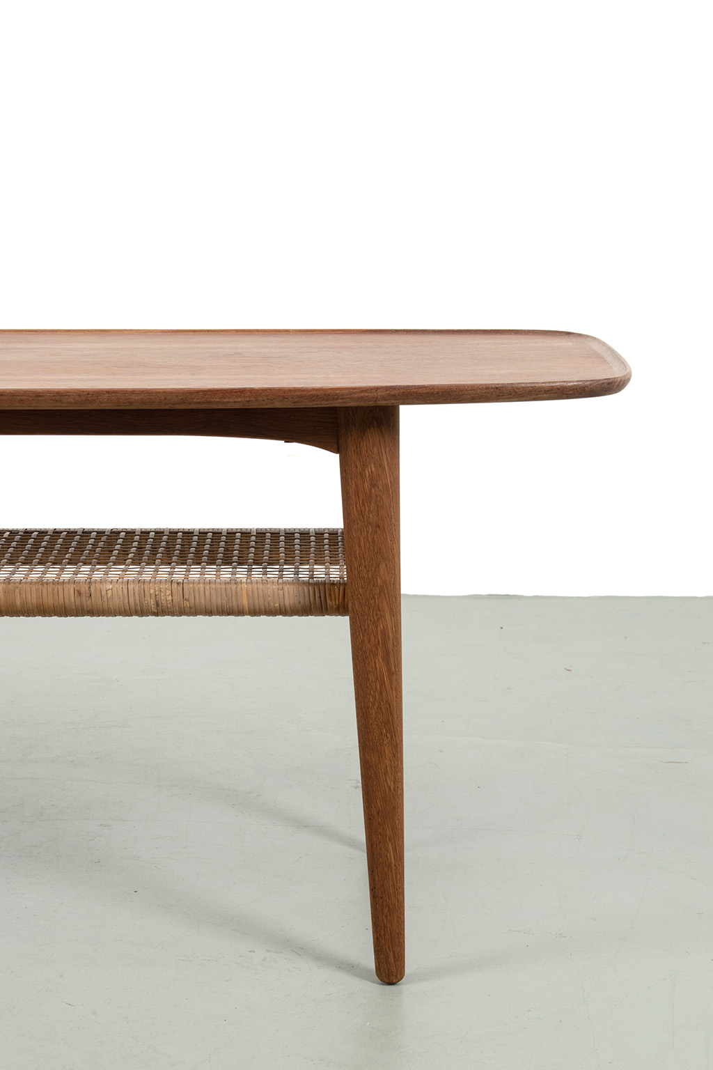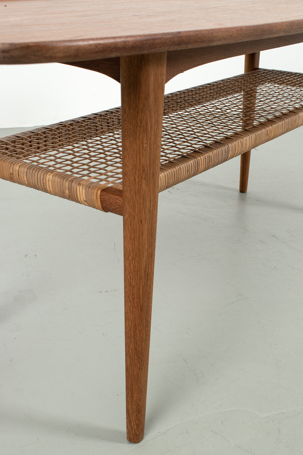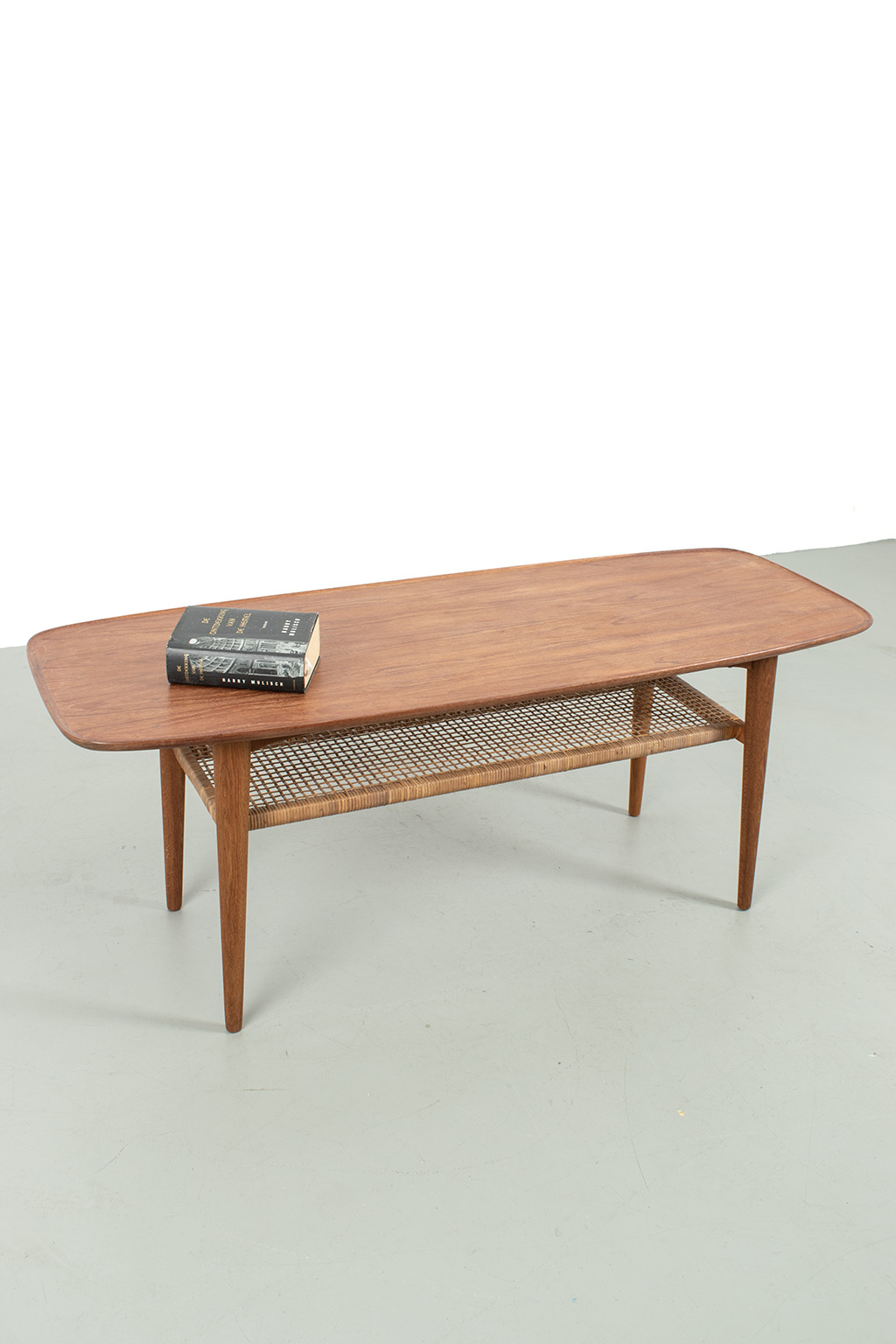Børge Mogensen salontafel voor het Deense Fredericia Stolefabrik. Deze teak en eiken tafel uit de jaren 50 heeft een lectuurvak gemaakt van rotan. Er ontbreekt een klein stukje rotan (zie foto) maar verder is deze tafel in een goede vintage staat.