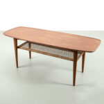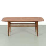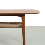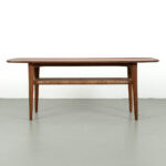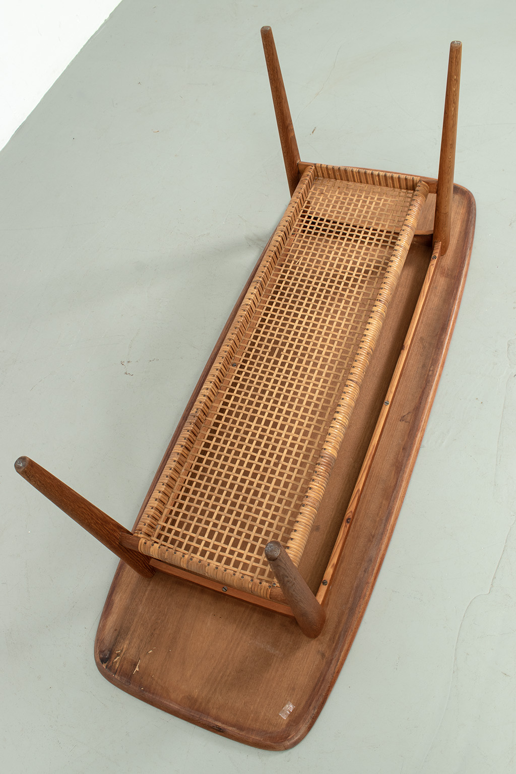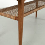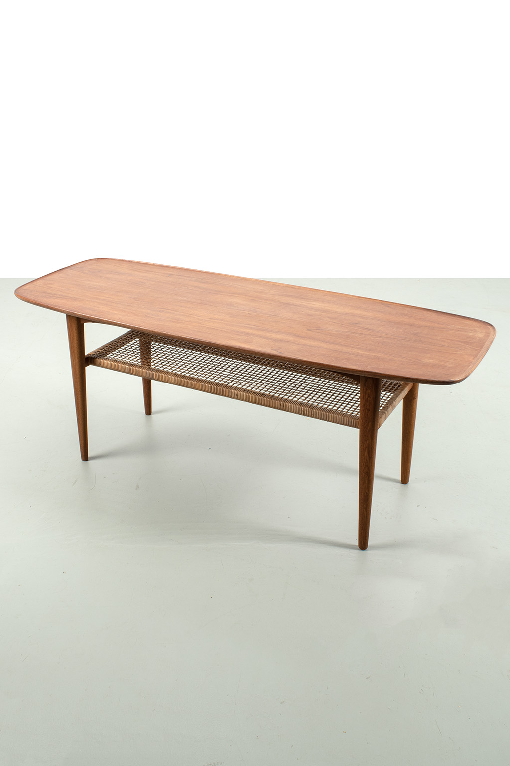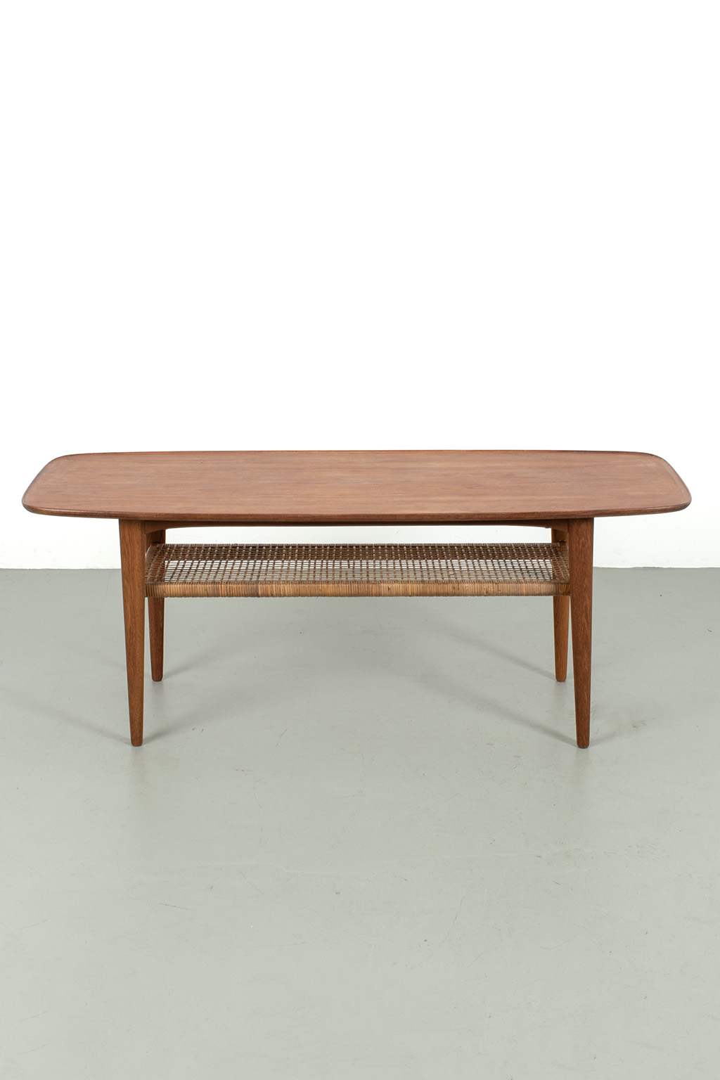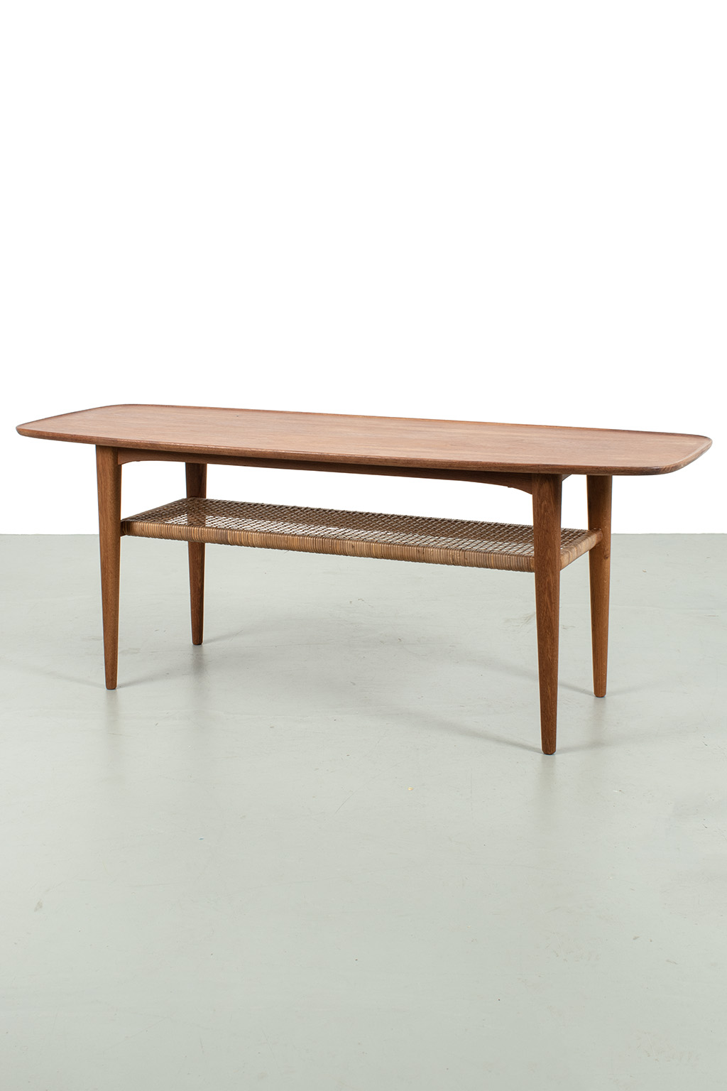 Børge Mogensen salontafel voor het Deense Fredericia Stolefabrik. Deze teak en eiken tafel uit de jaren 50 heeft een lectuurvak gemaakt van rotan. Er ontbreekt een klein stukje rotan (zie foto) maar verder is deze tafel in een goede vintage staat.