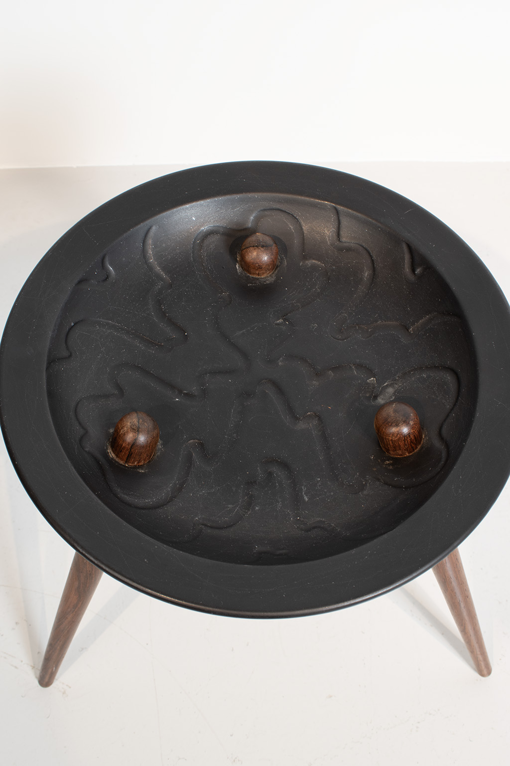 Deens bijzettafeltje met palissander poten. Evt. te gebruiken als plantentafeltje maar het tafeltje is ook mooi op zichzelf. De 3 palissander poten steken door het mat zwarte keramieken bordje. Het keramiek heeft een prachtig reliëf. Aan de onderkant van het bordje zit een kleine chip (zie foto) maar verder is dit item in een goede vintage staat.