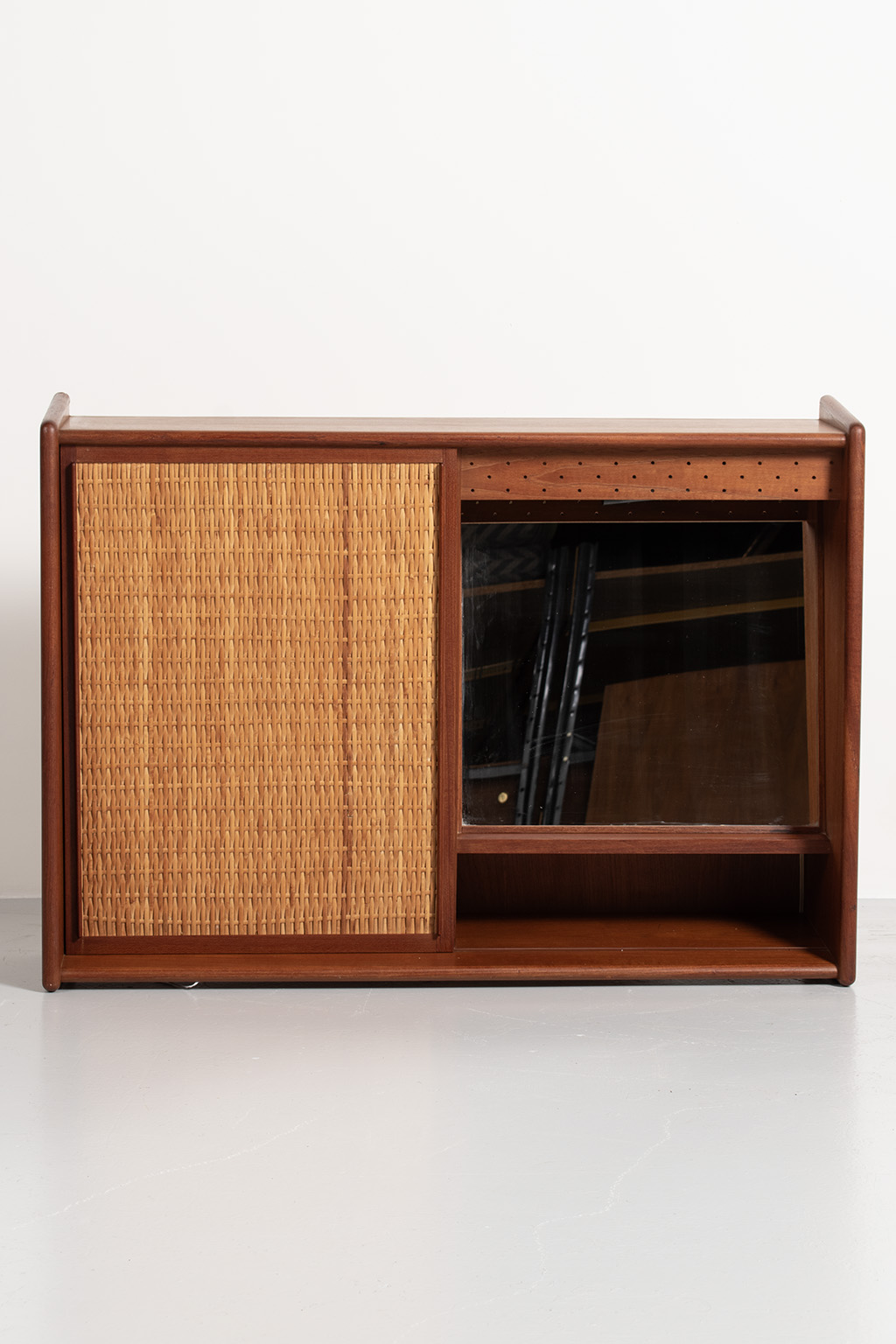 Deens teak wandmeubel met deurtje gemaakt van riet en een kapspiegel. In het kastje zit verlichting.