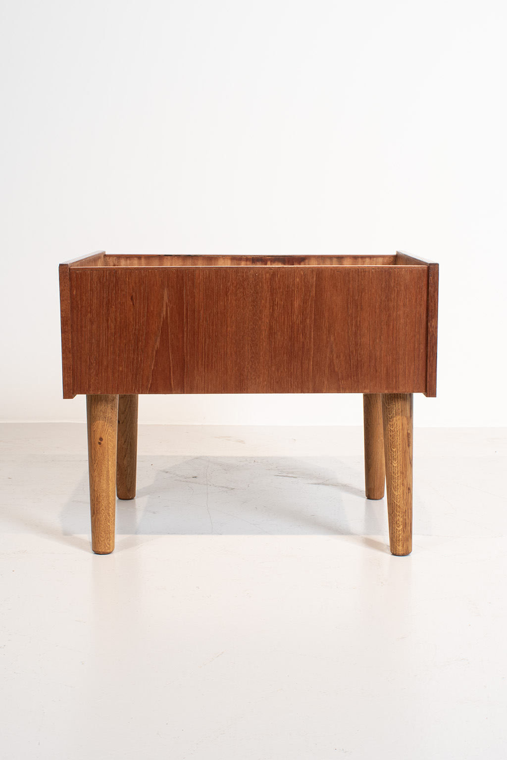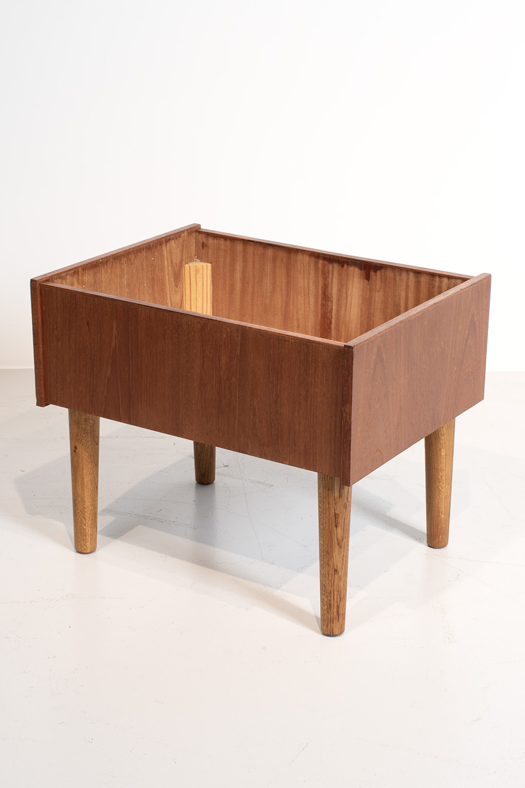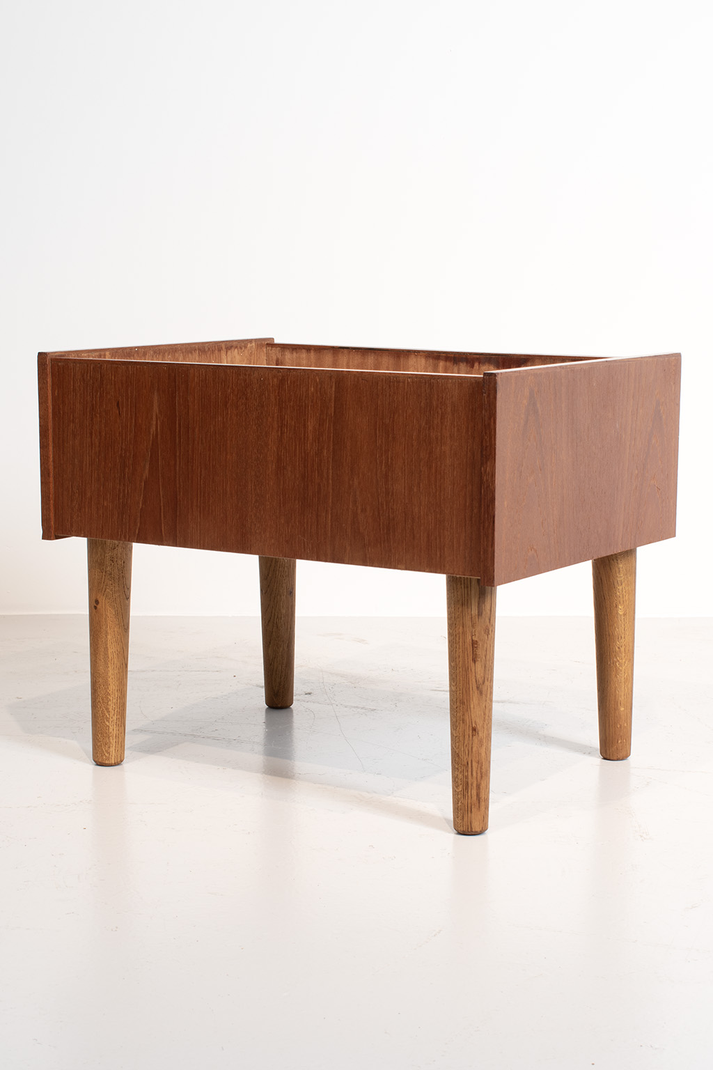 Deense plantenbak gemaakt van teak fineer zonder binnenbak. De poten zijn van een andere houtsoort (waarschijnlijk eiken) waardoor wij het vermoeden hebben dat deze eerder vervangen zijn.