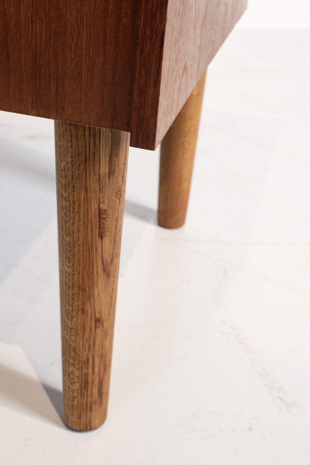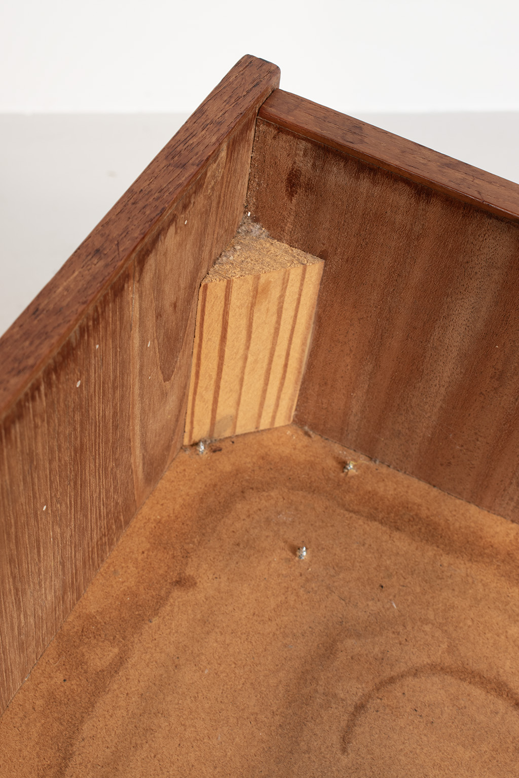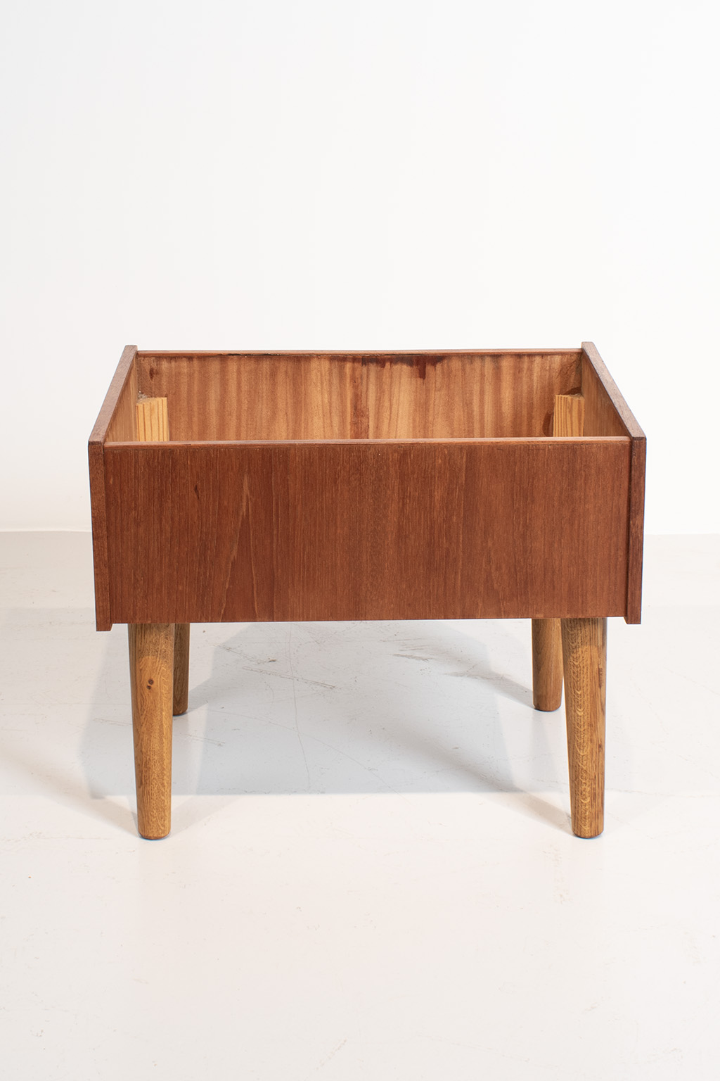 Deense plantenbak gemaakt van teak fineer zonder binnenbak. De poten zijn van een andere houtsoort (waarschijnlijk eiken) waardoor wij het vermoeden hebben dat deze eerder vervangen zijn.