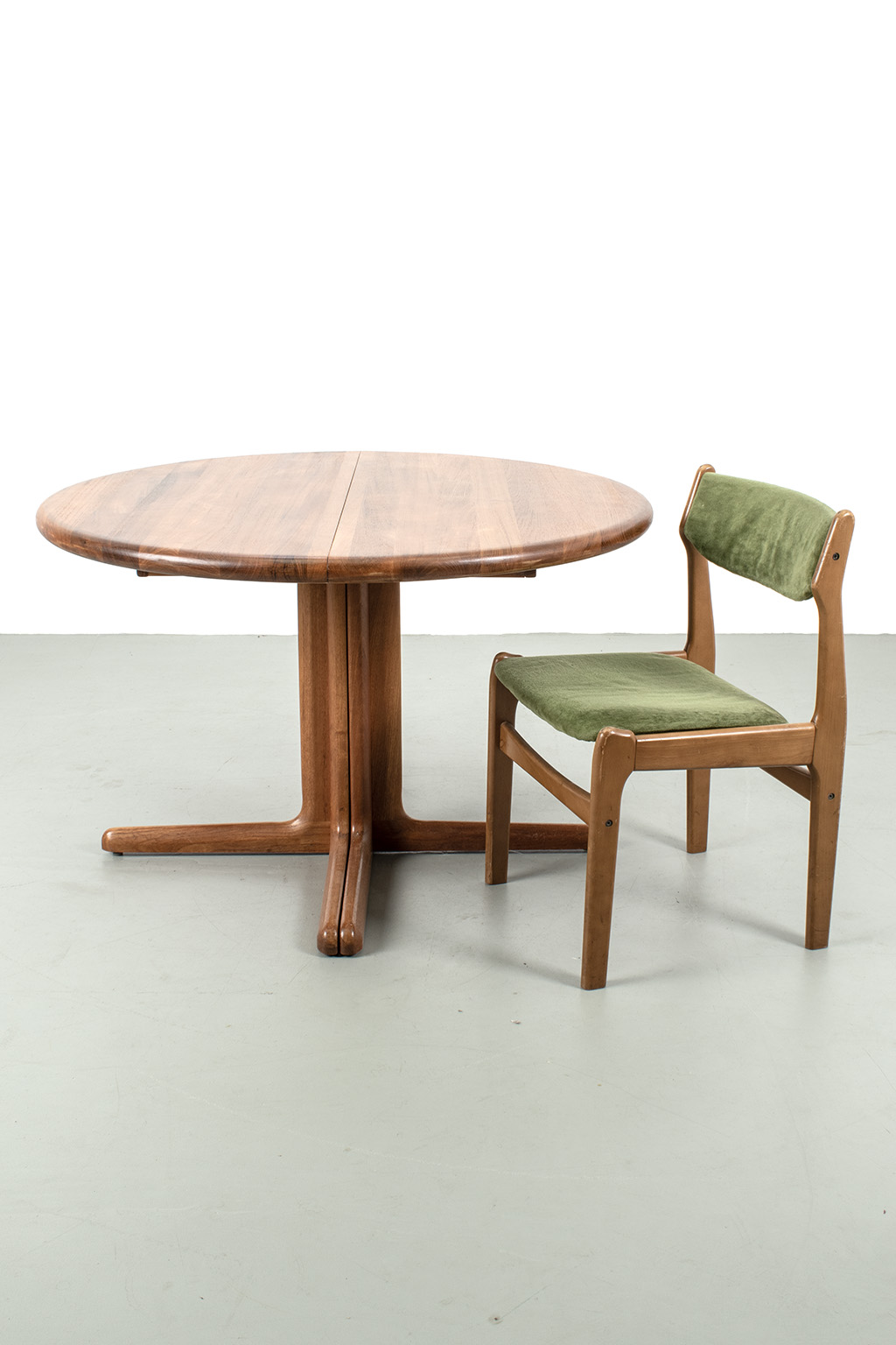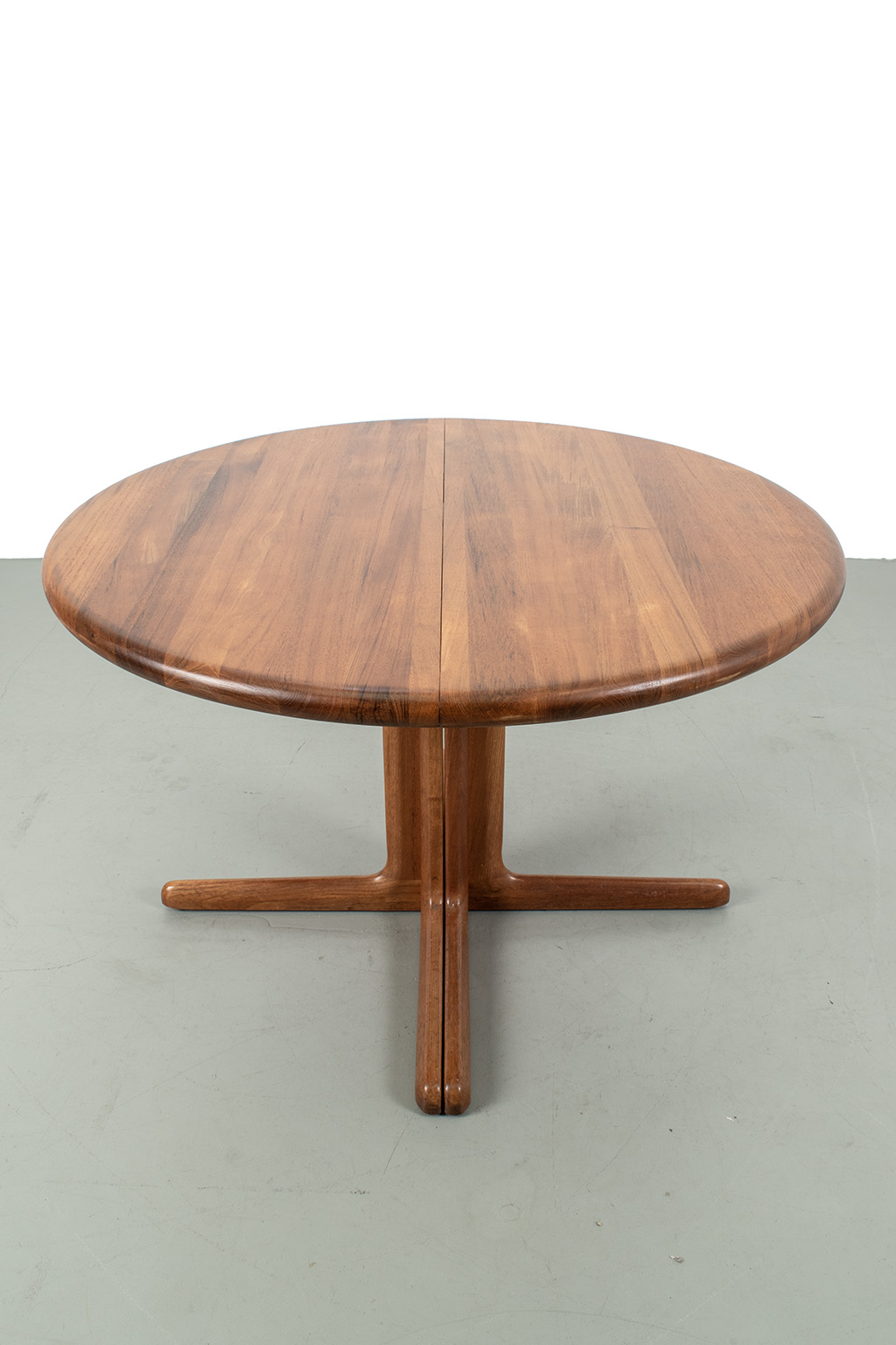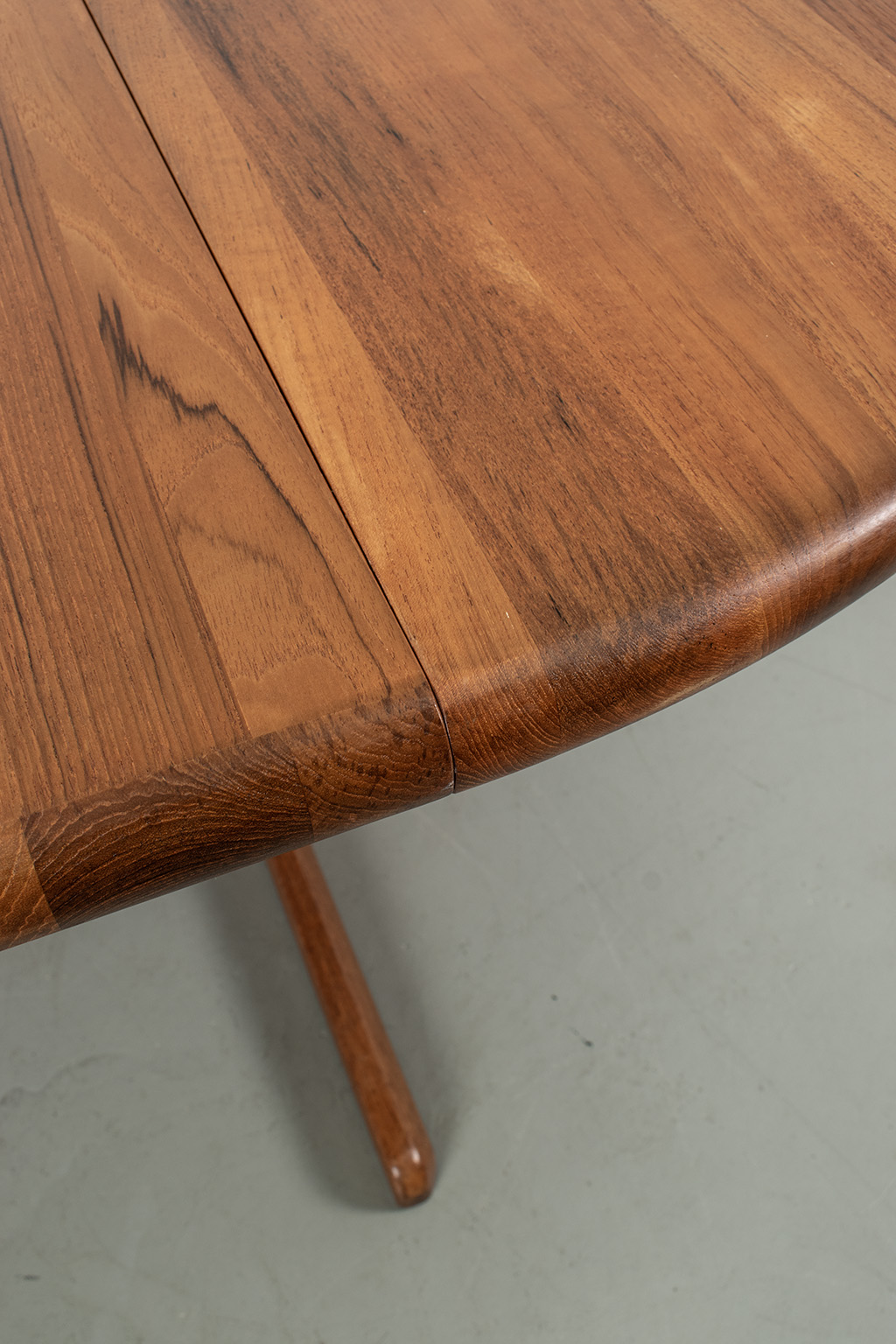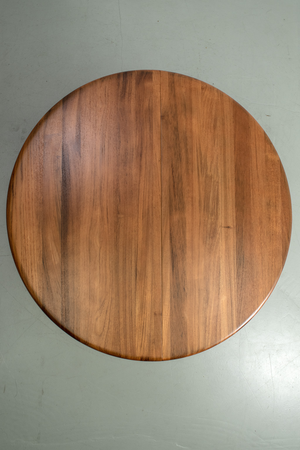 Deense uittrektafel gemaakt van deels massief, deels fineer (losse bladen) teak hout. Deze prachtige tafel heeft 2 verlengstukken waardoor je de ronde tafel kunt uitbreiden als je gasten hebt. Wees er snel bij want deze tafels zijn razend populair en dit exemplaar is in een hele goede vintage staat.
