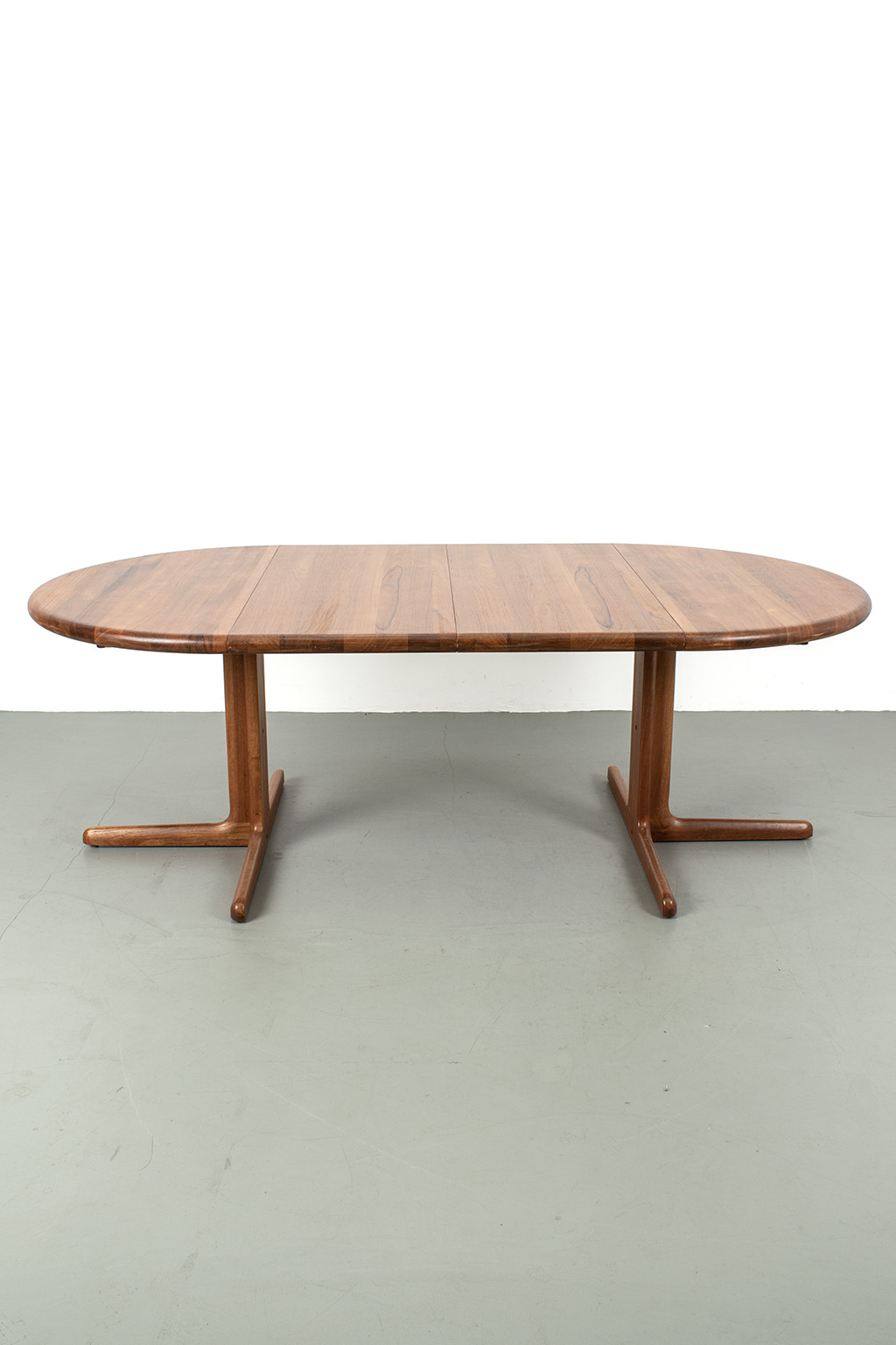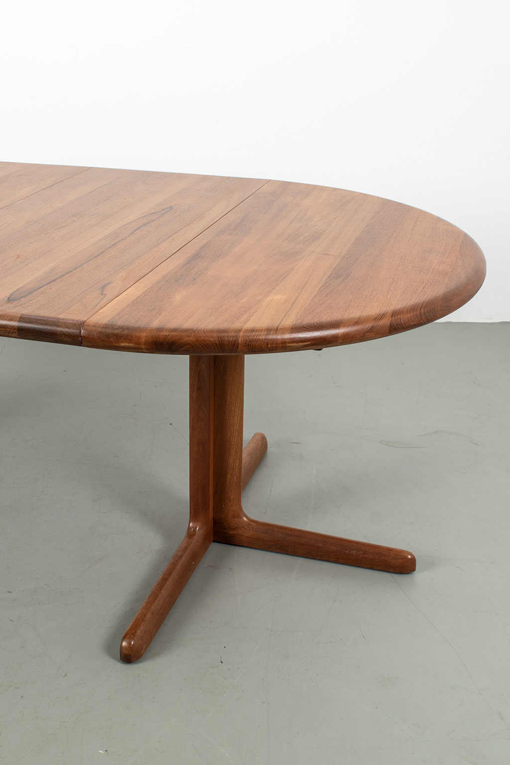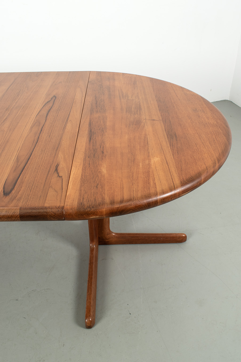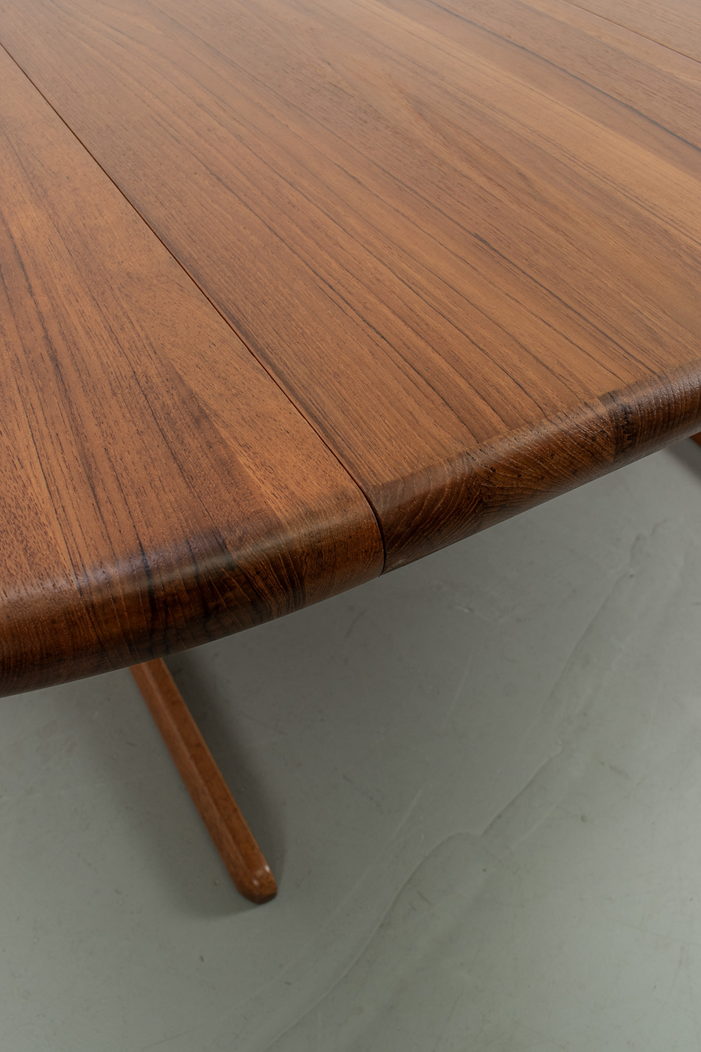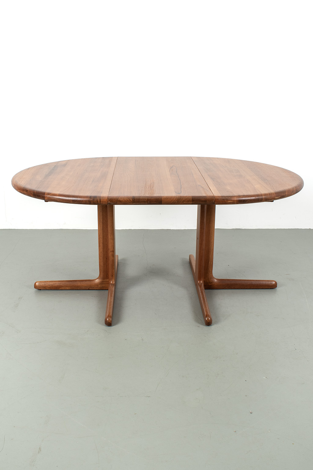 Deense uittrektafel gemaakt van deels massief, deels fineer (losse bladen) teak hout. Deze prachtige tafel heeft 2 verlengstukken waardoor je de ronde tafel kunt uitbreiden als je gasten hebt. Wees er snel bij want deze tafels zijn razend populair en dit exemplaar is in een hele goede vintage staat.