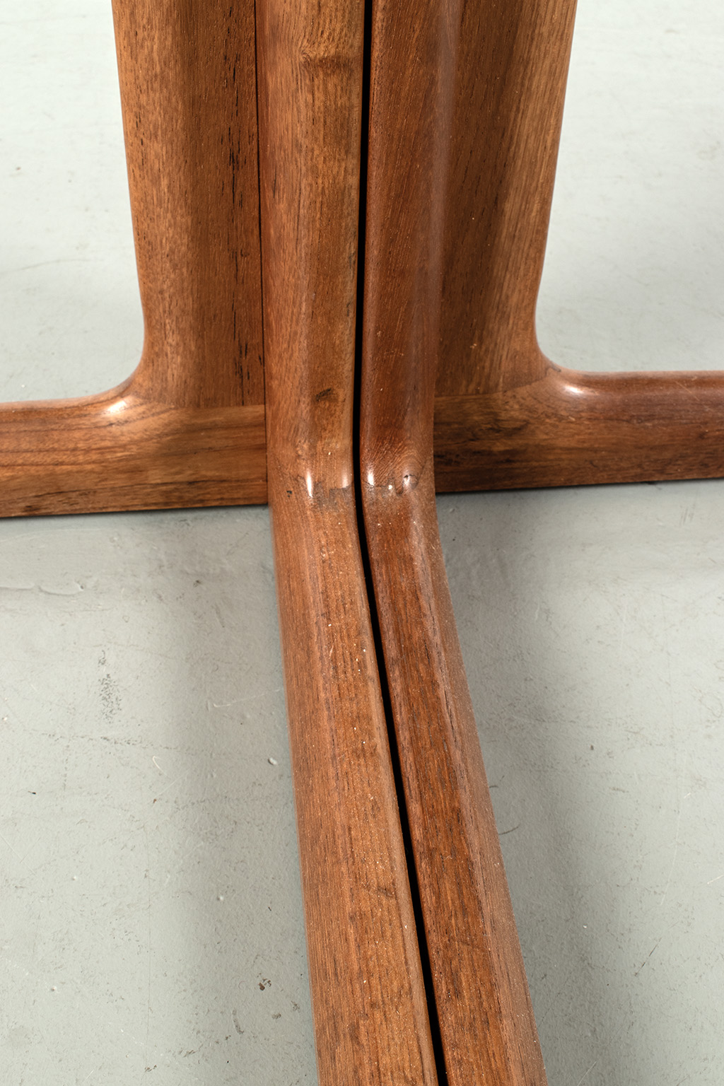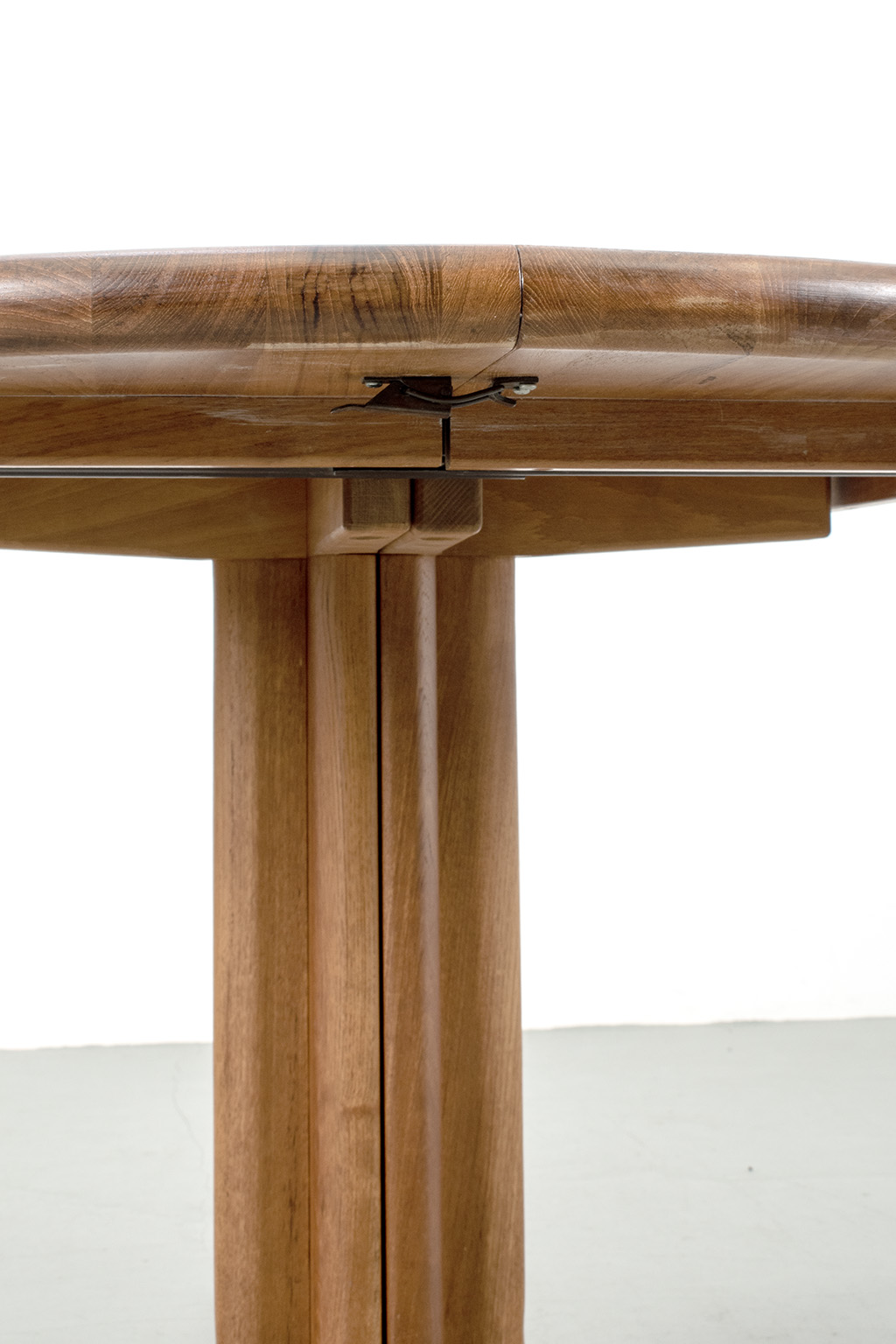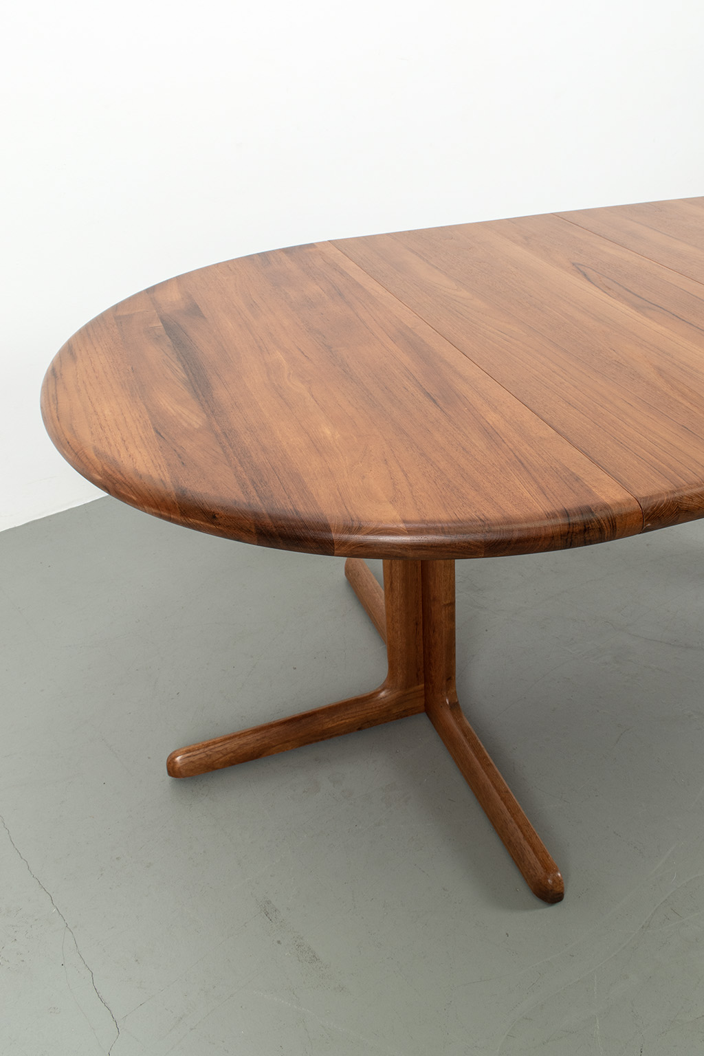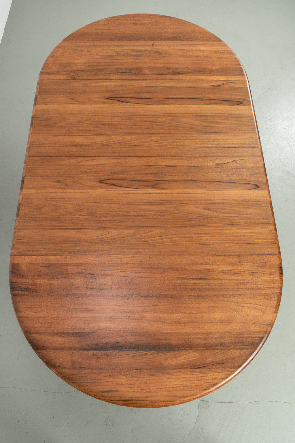 Deense uittrektafel gemaakt van deels massief, deels fineer (losse bladen) teak hout. Deze prachtige tafel heeft 2 verlengstukken waardoor je de ronde tafel kunt uitbreiden als je gasten hebt. Wees er snel bij want deze tafels zijn razend populair en dit exemplaar is in een hele goede vintage staat.