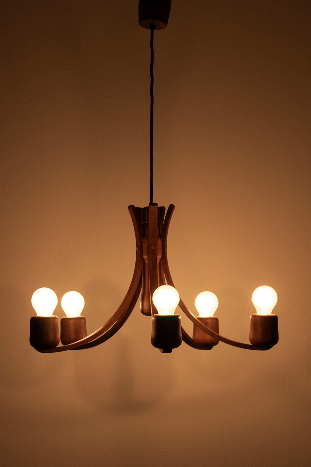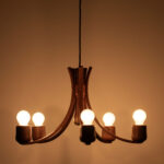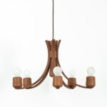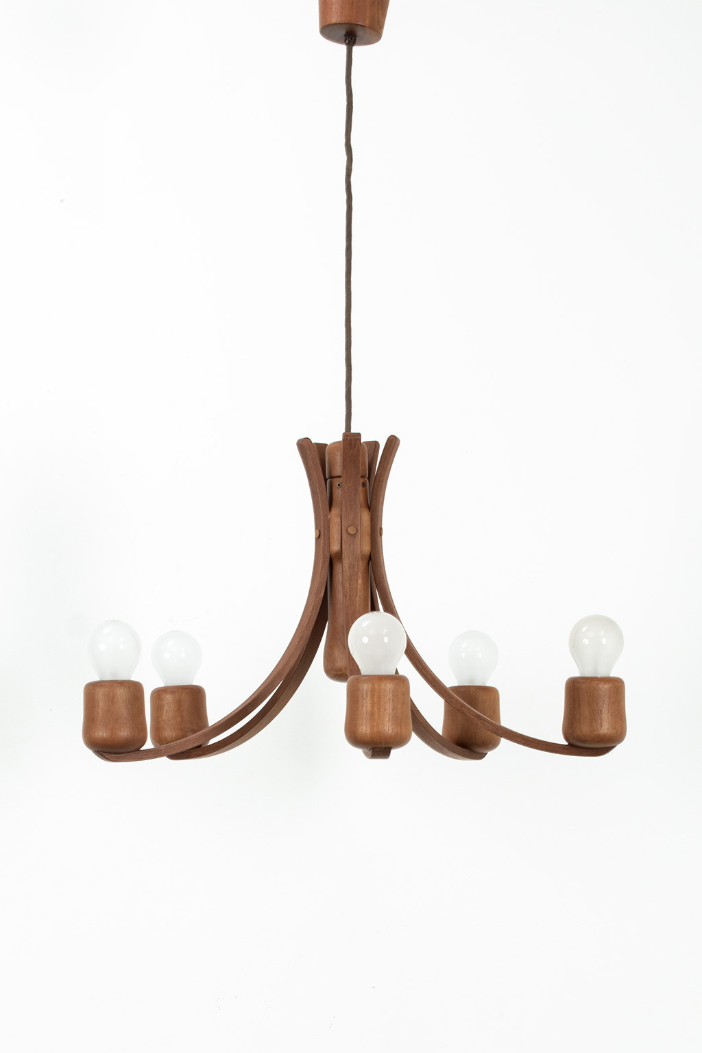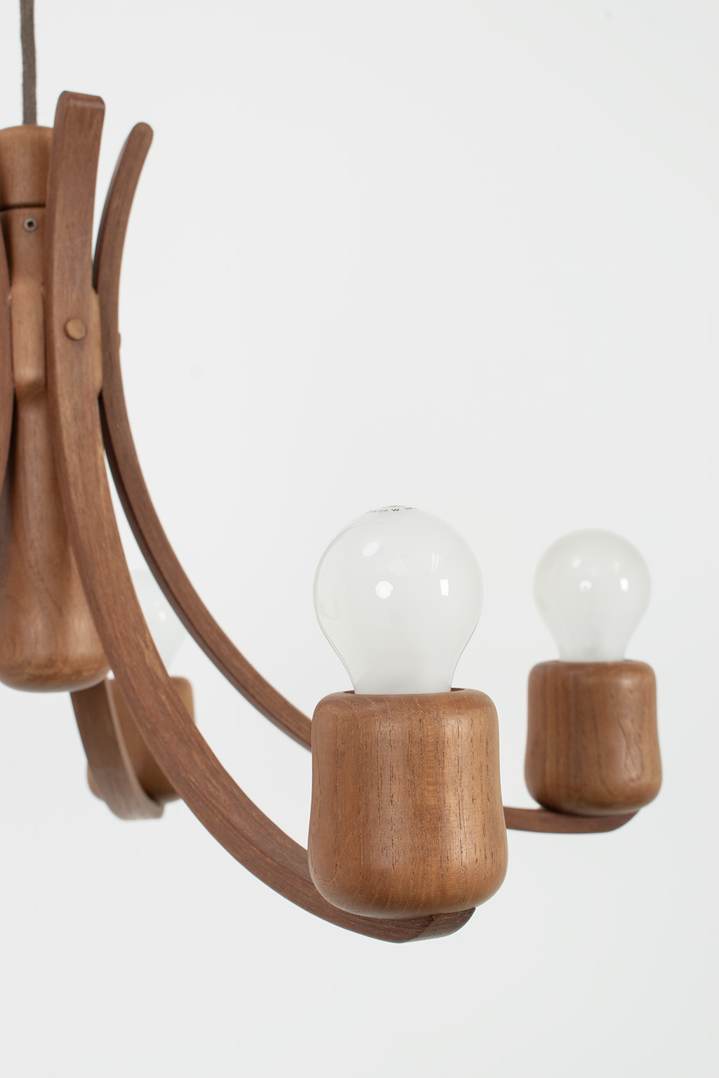 Domus kroonluchter (2 stuks op voorraad) met 5 armen. Gemaakt van teak hout. Lichtbronnen zijn exclusief en dus naar eigen inzicht te bepalen.