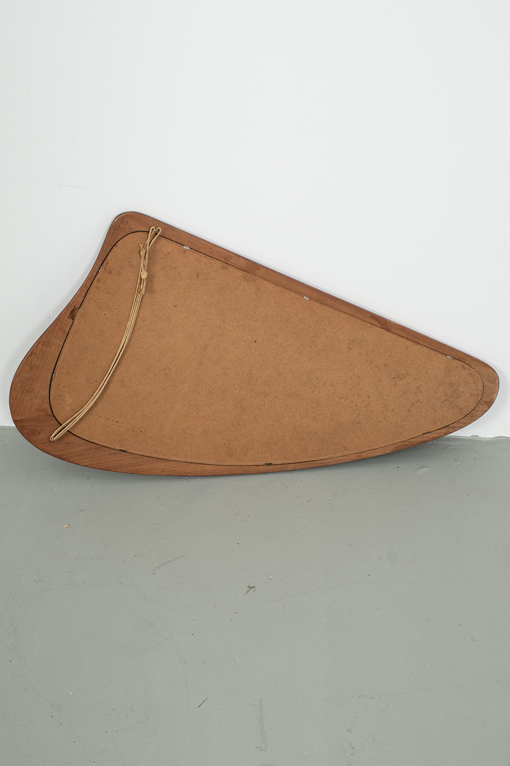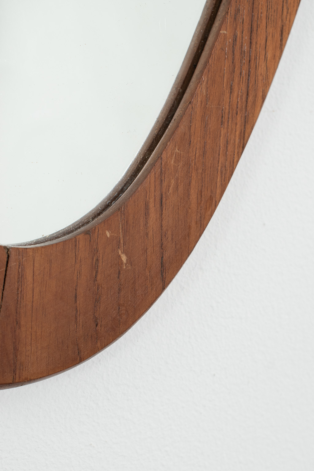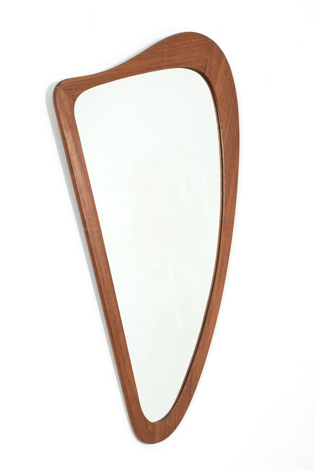 Freeform spiegel met een prachtig organisch gevormd frame in teak. Het glas heeft weer maar verder is de spiegel in een goede vintage staat.