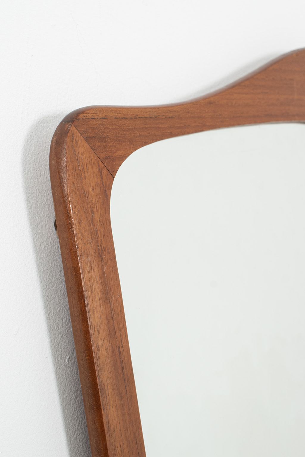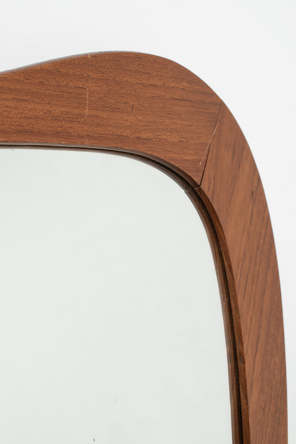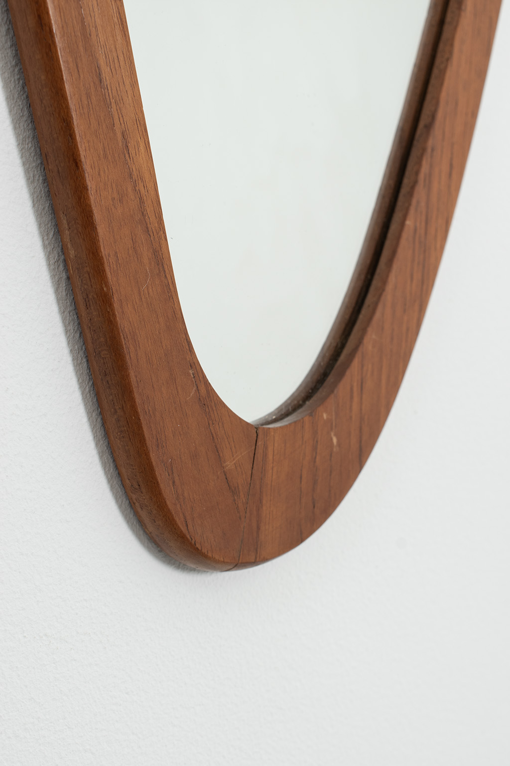 Freeform spiegel met een prachtig organisch gevormd frame in teak. Het glas heeft weer maar verder is de spiegel in een goede vintage staat.