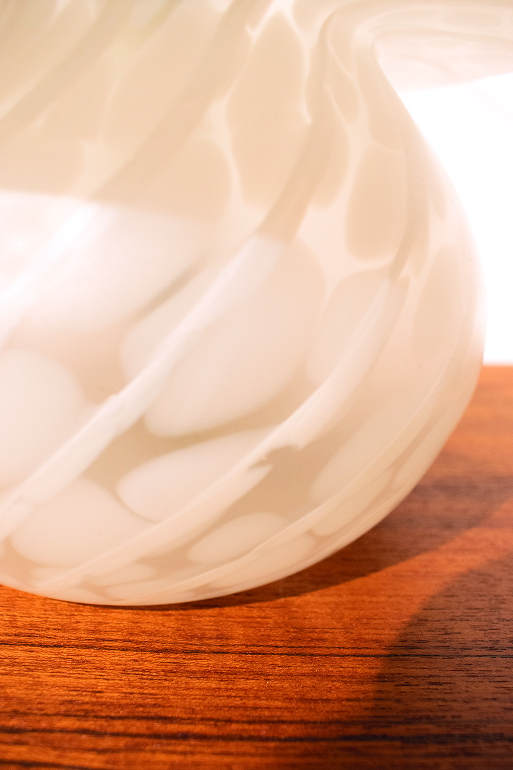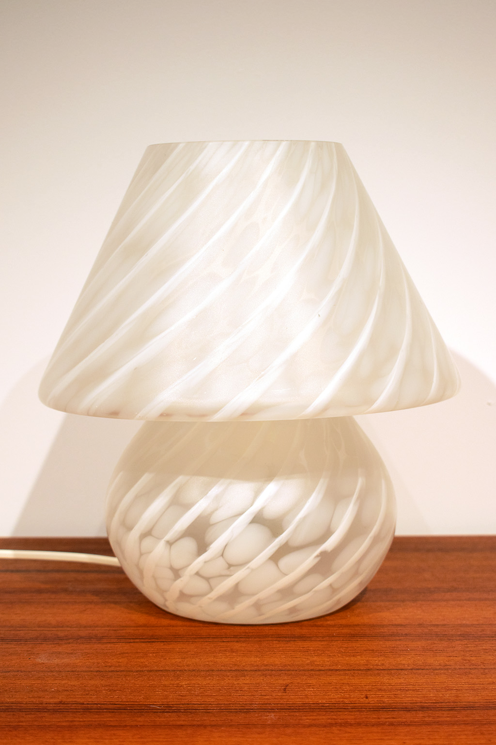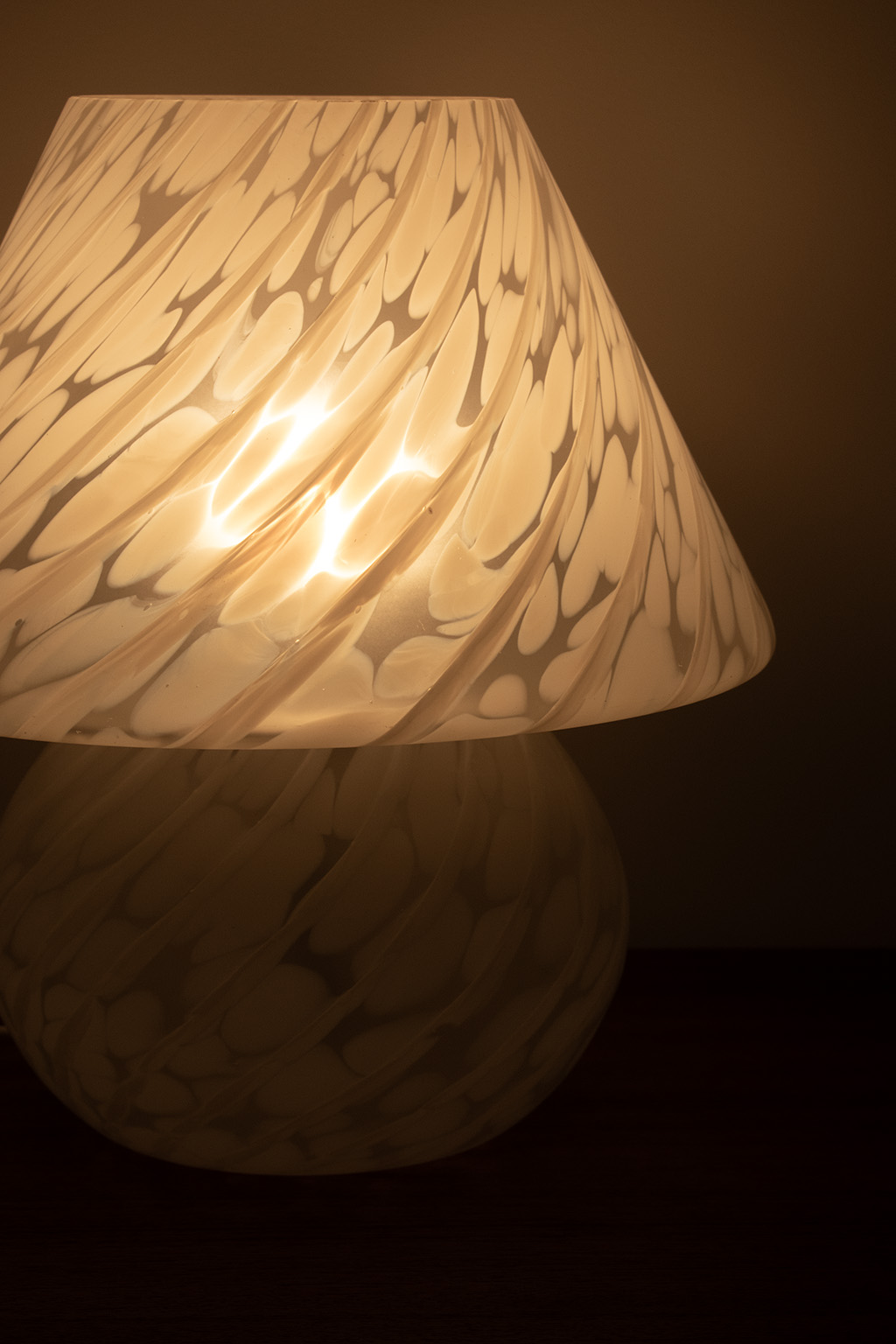 Glazen mushroom tafellampje. Het glas heeft een prachtig patroon waardoor het licht heel sfeervol is.