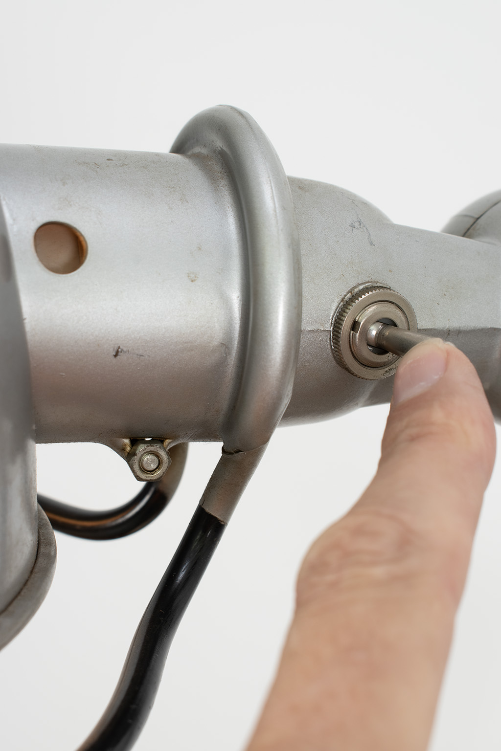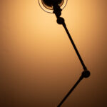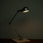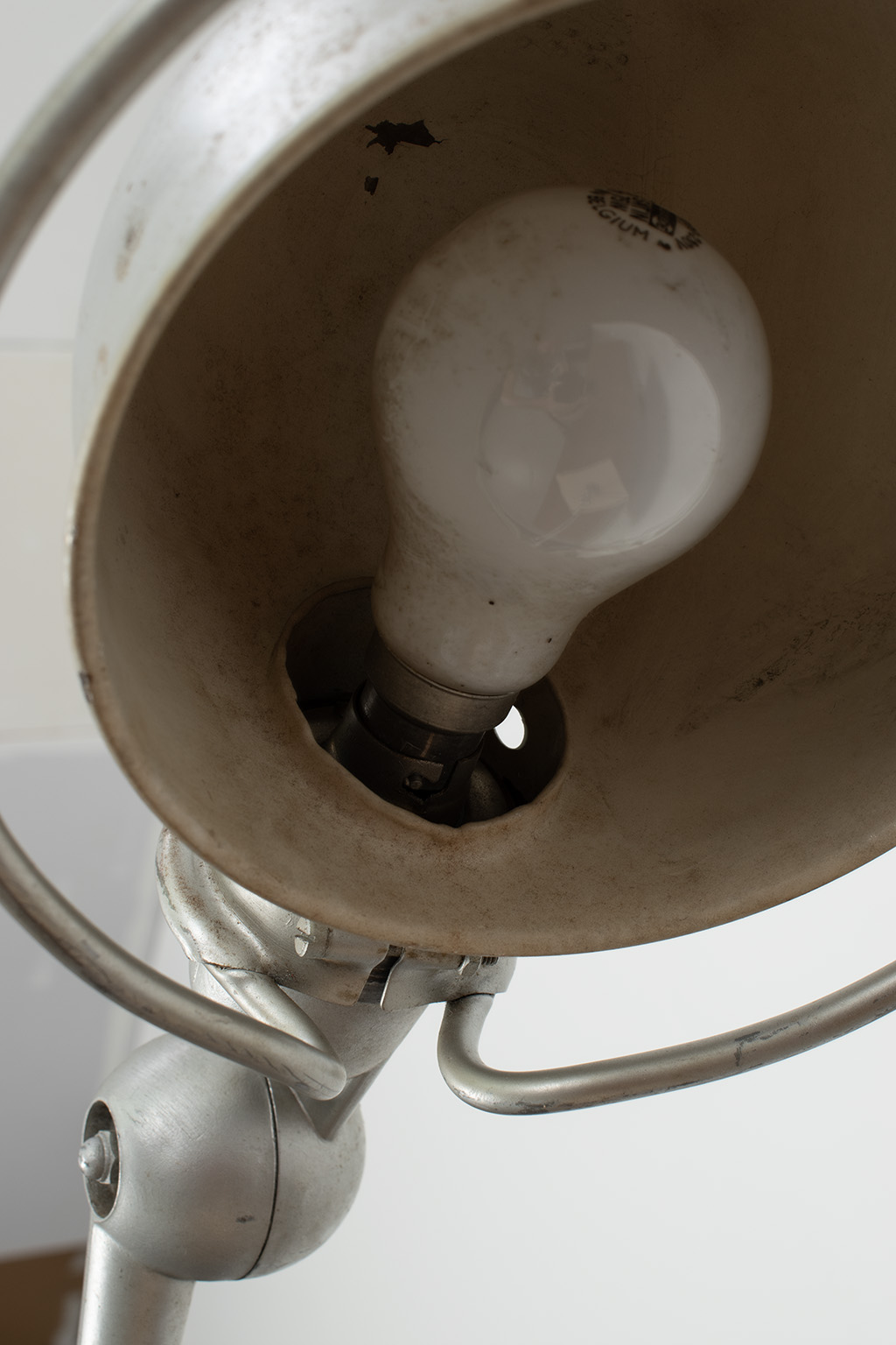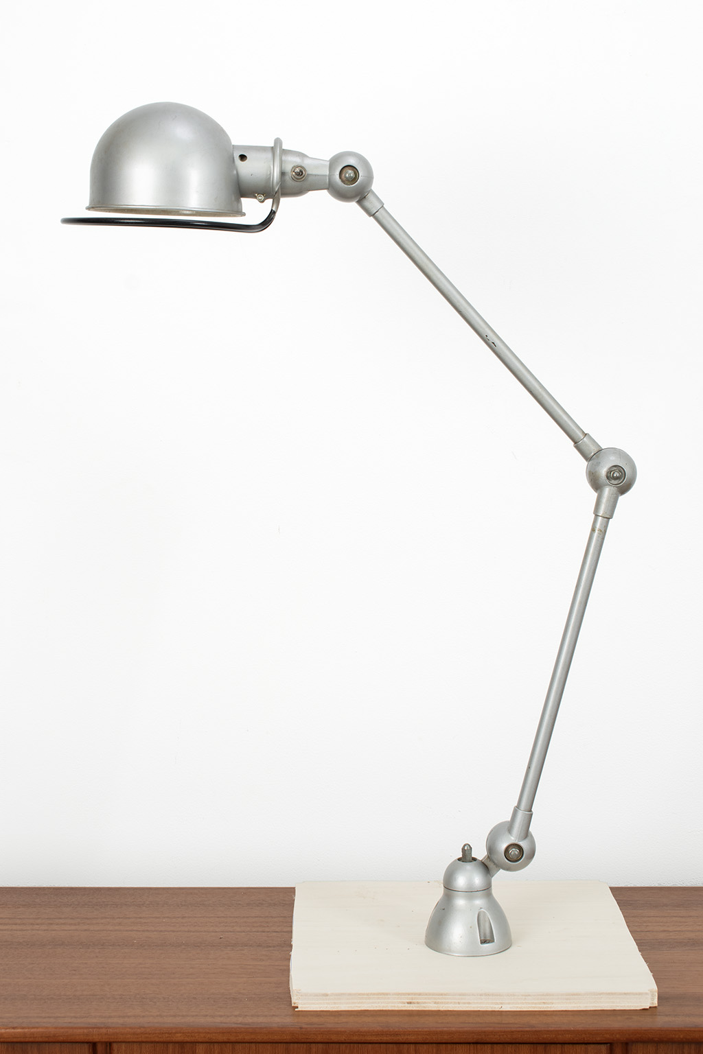 Jieldé lamp ontworpen door Jean Louis Domecq. De lamp heeft een bajonet fitting (lamp is incl.) en kan gemonteerd worden op de muur of op een tafel/bureaublad (plankje op de foto is ter illustratie en hoort niet bij de lamp).
