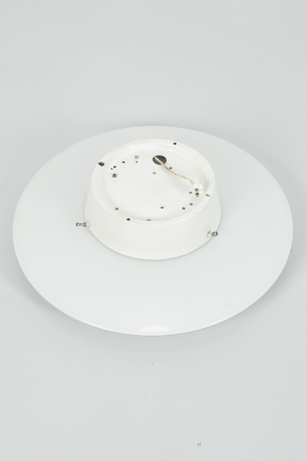 Louis Poulsen AJ Eklipta plafonnière of wandlamp. Deze lampen zijn nieuw nog steeds verkrijgbaar in 3 verschillende maten (een stuk duurder uiteraard). Deze lamp heeft een groot formaat (Ø 45 cm.). Het ontwerp is zeer eenvoudig waardoor de lampen (2xE27) sfeervol door het prachtige opaalglas schijnt.