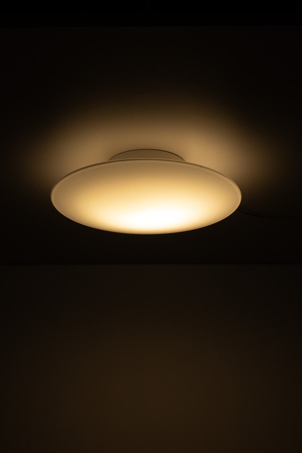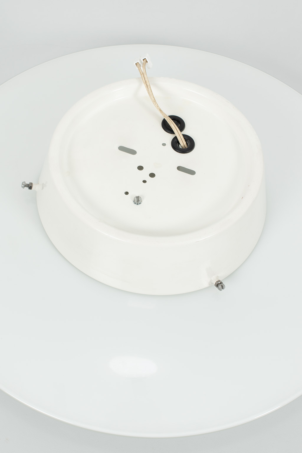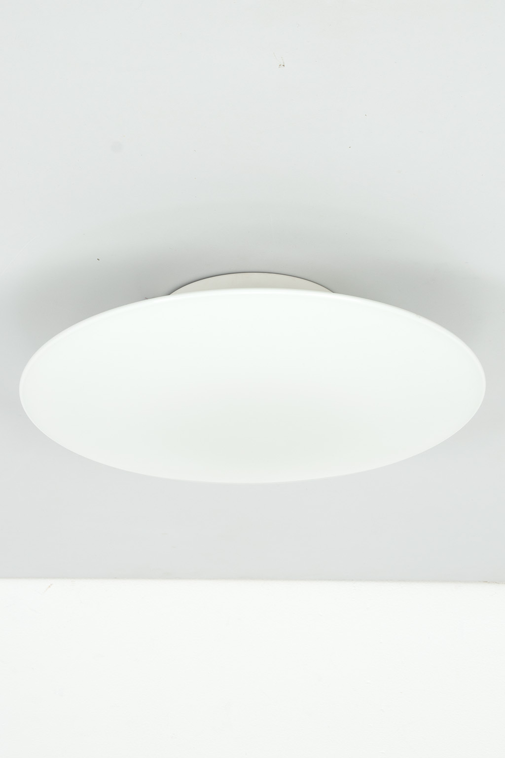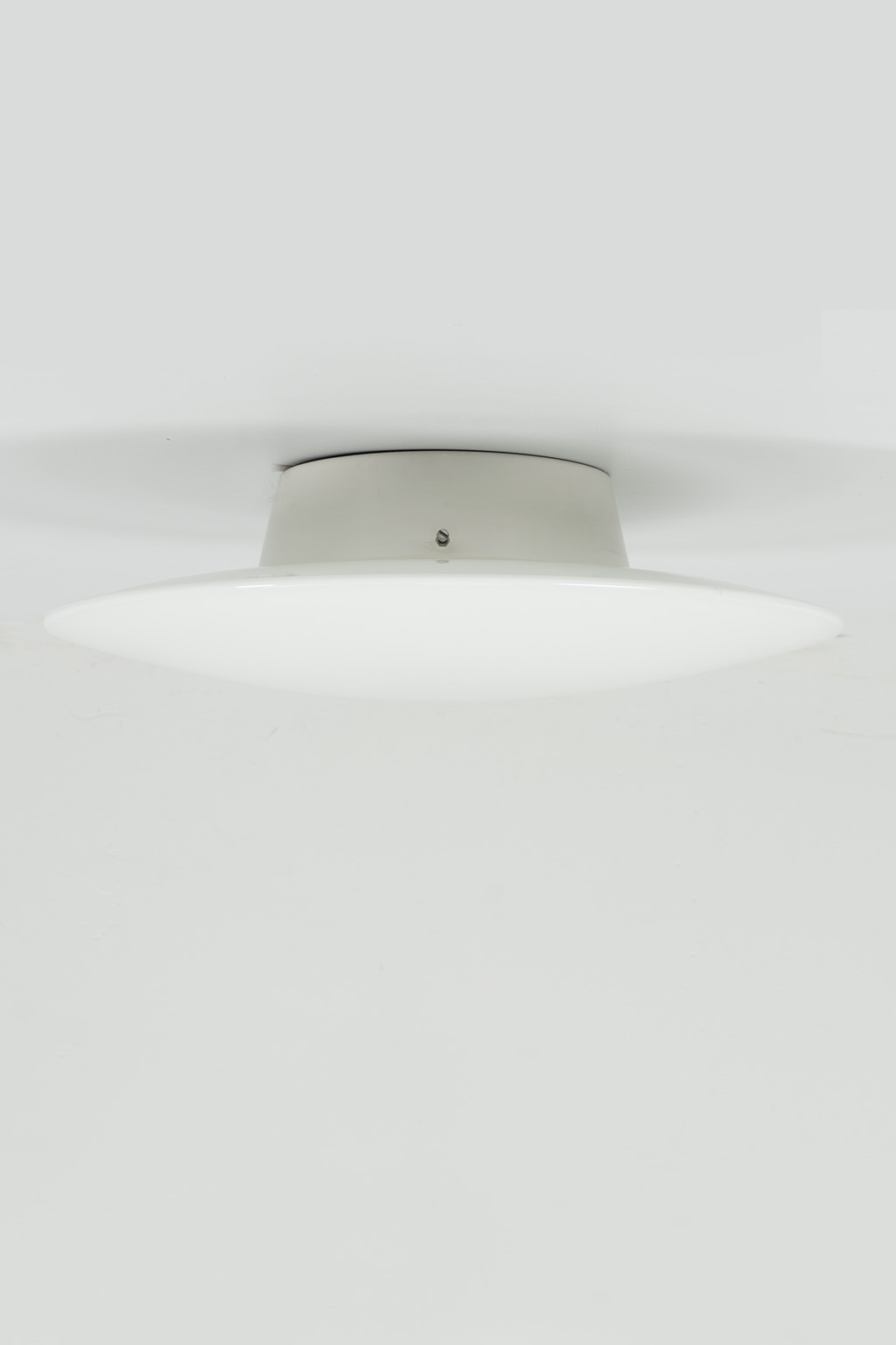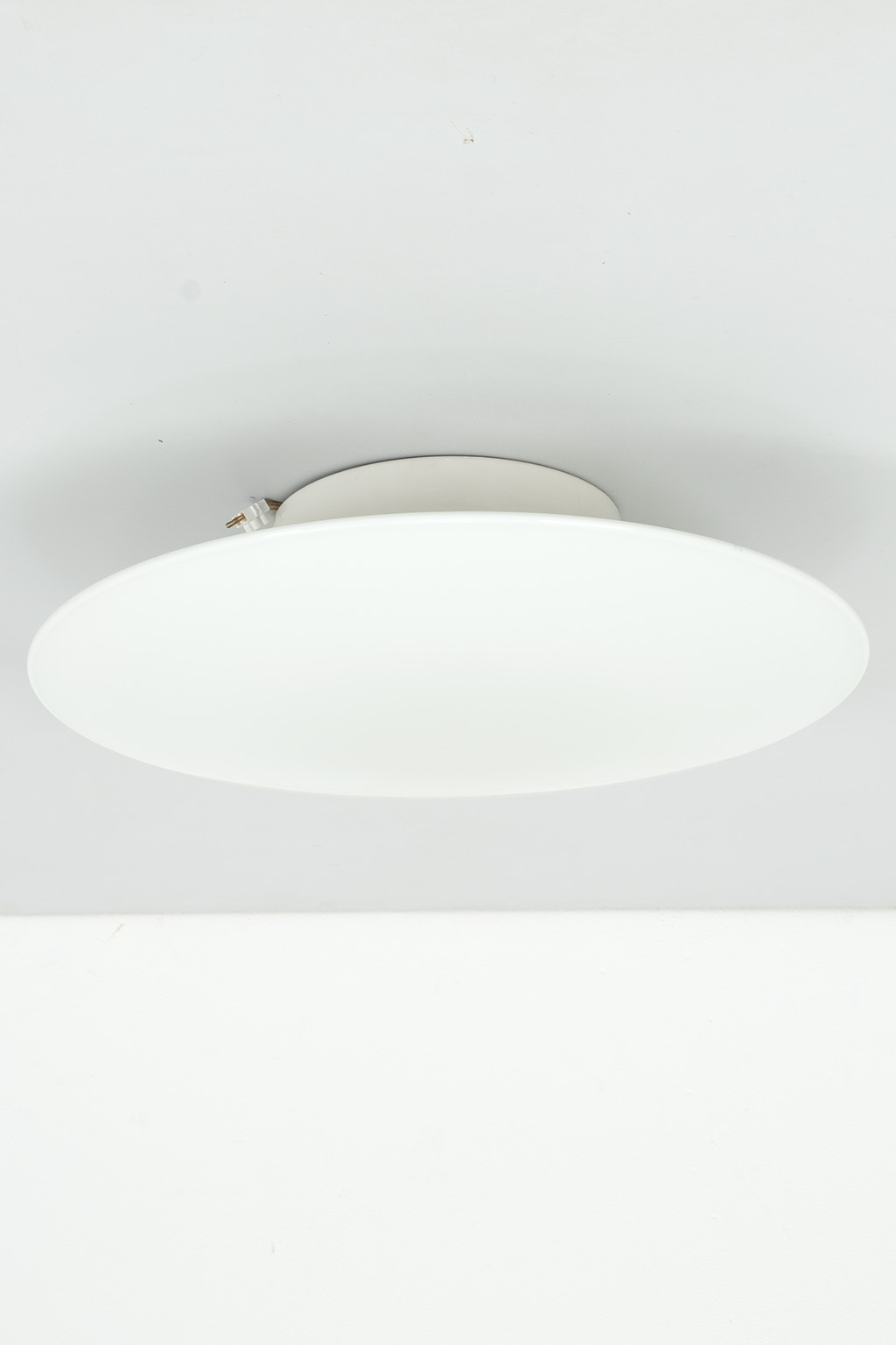Louis Poulsen AJ Eklipta plafonnière of wandlamp. Deze lampen zijn nieuw nog steeds verkrijgbaar in 3 verschillende maten (een stuk duurder uiteraard). Deze lamp heeft een groot formaat (Ø 45 cm.). Het ontwerp is zeer eenvoudig waardoor de lampen (2xE27) sfeervol door het prachtige opaalglas schijnt.