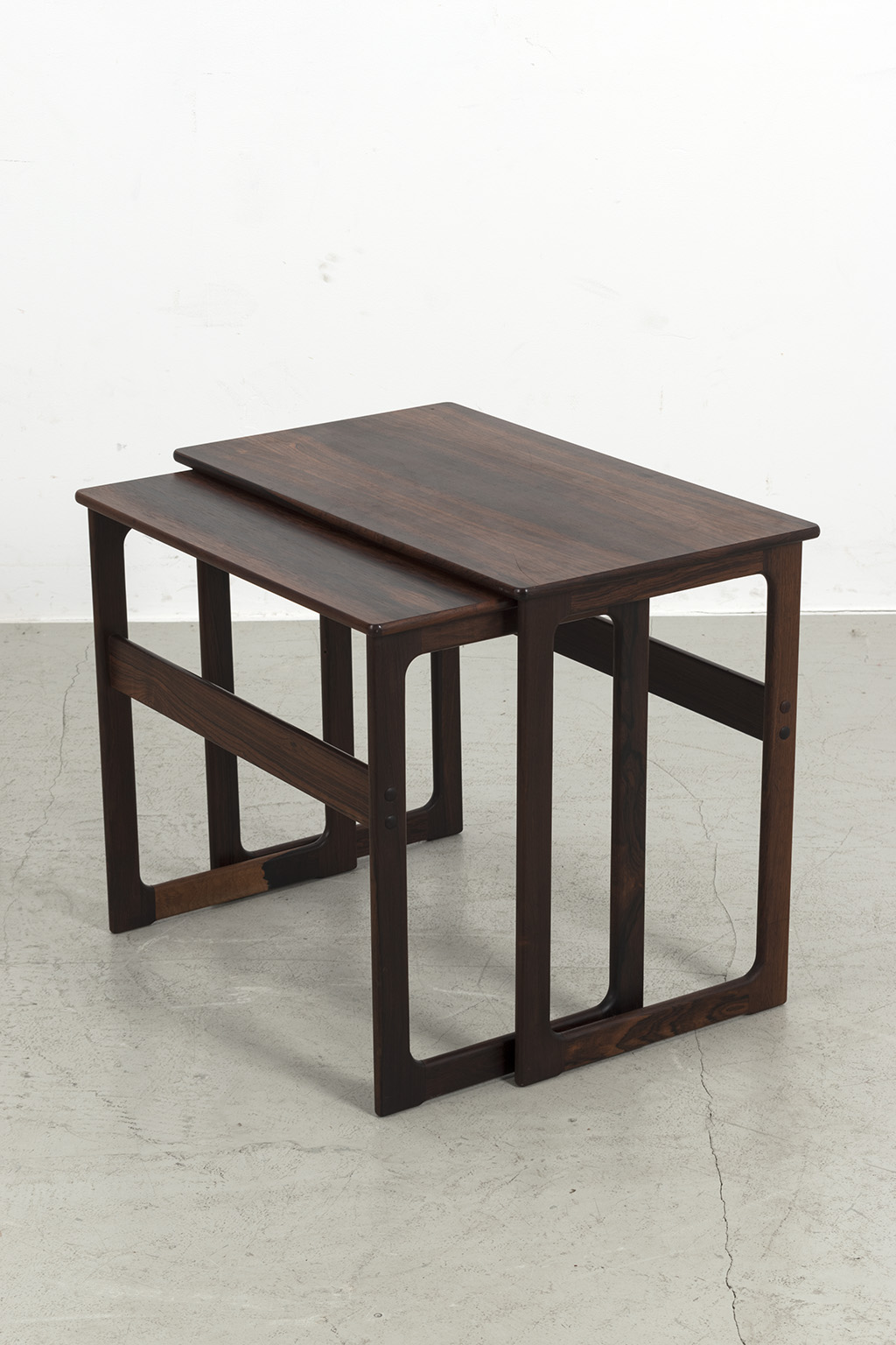 Mooi jaren 70 mimisetje bestaande uit twee palissander tafeltjes. Heeft wat gebruikssporen maar is verder in goede vintage staat.