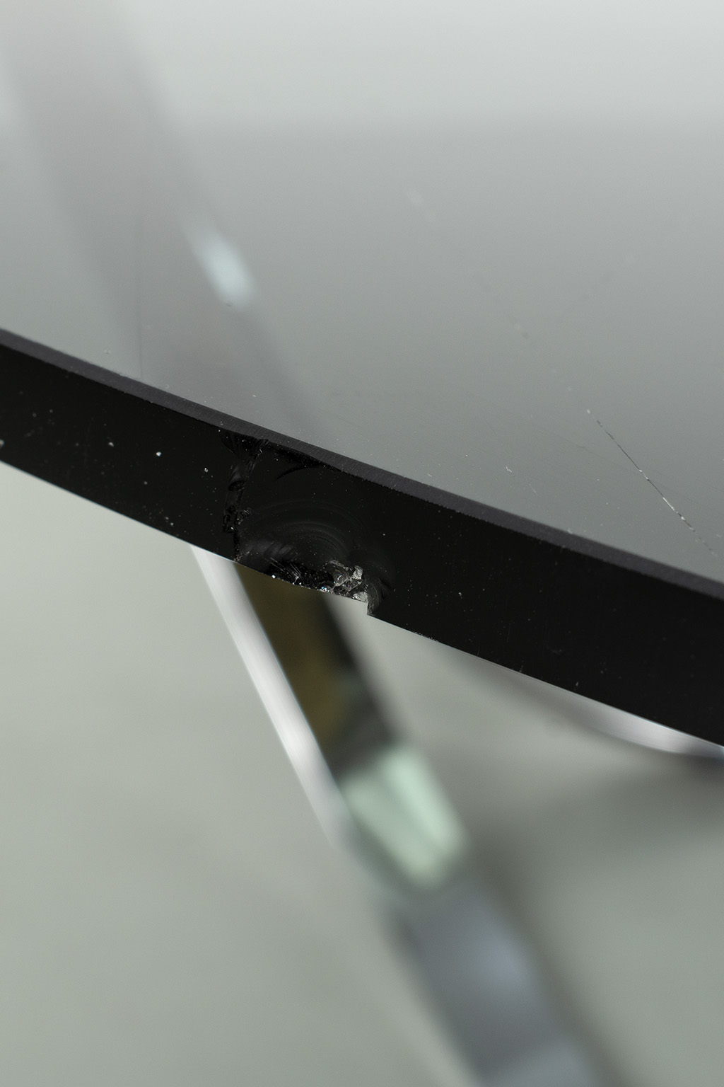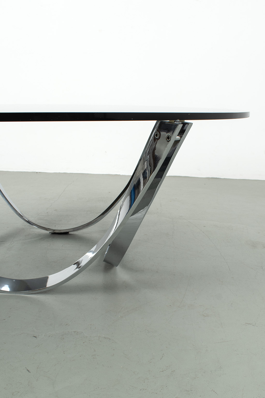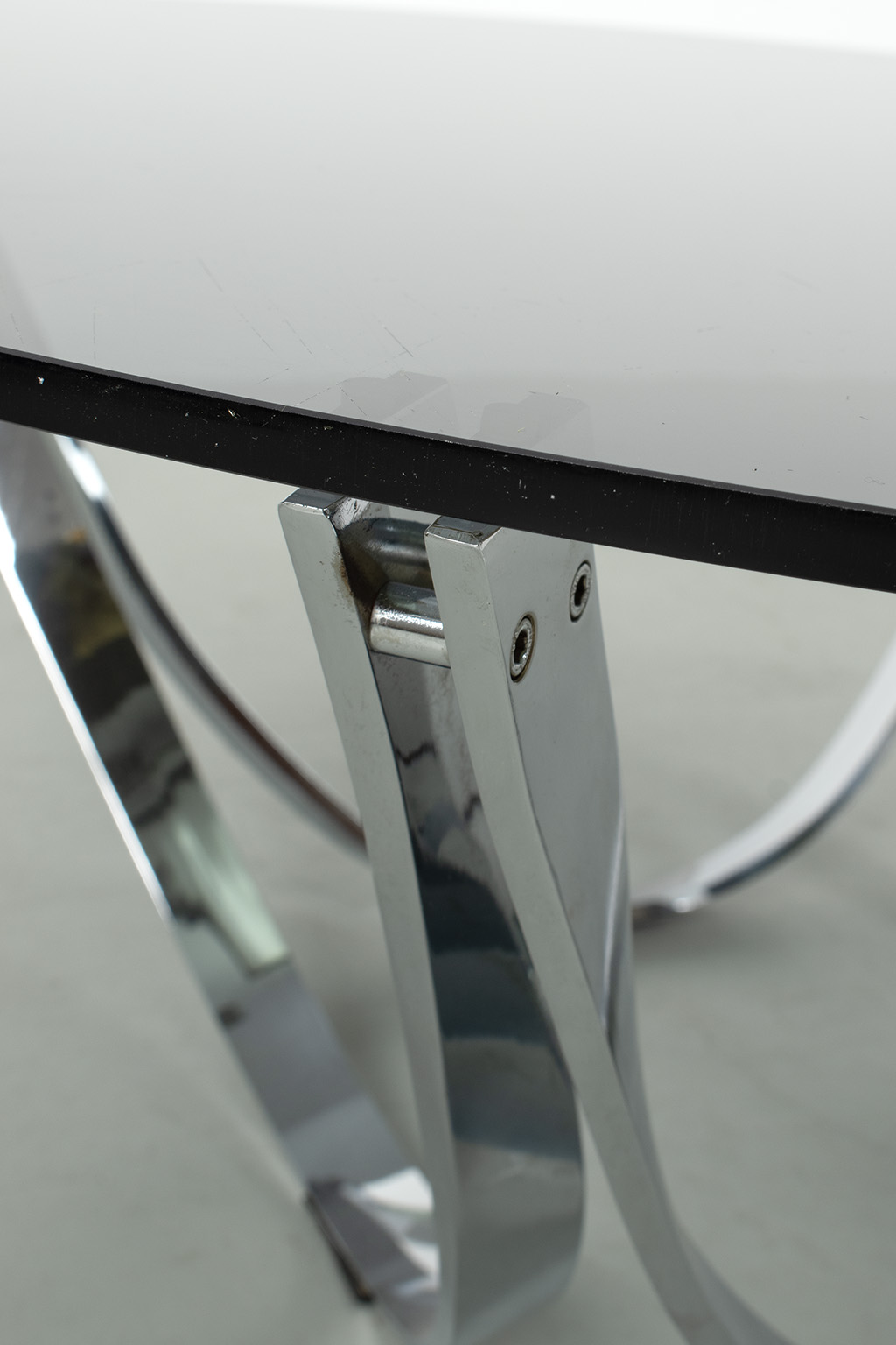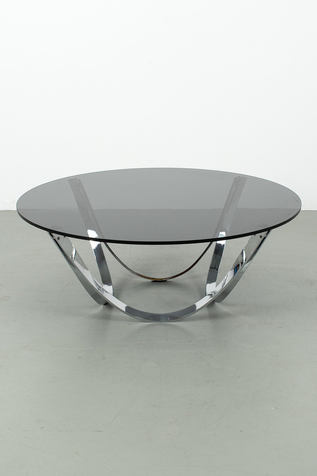 Roger Springer salontafel voor Dunbar. Een salontafel in de ‘Space Age’ stijl met een chromen onderstel in een goede staat en een rookglazen blad met wat chips en krasjes.
