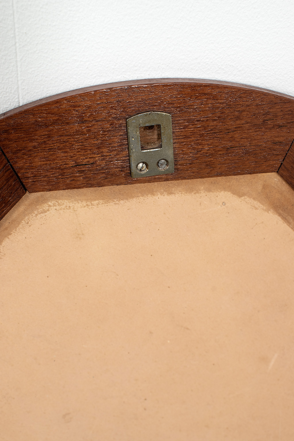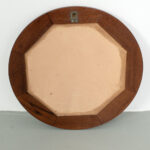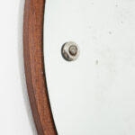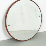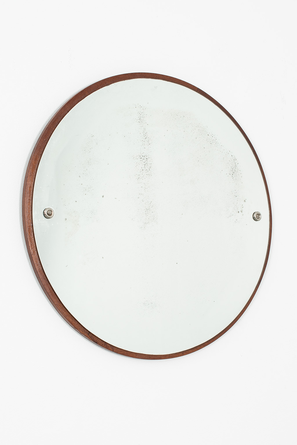 Ronde teak spiegel. Deze spiegel is van top tot teen ‘vintage’. Het spiegelglas is op een teak fineer ronde plaat bevestigd middels decoratieve schroeven. De spiegel heeft weer wat het karakter geeft. Verder in goede vintage staat.