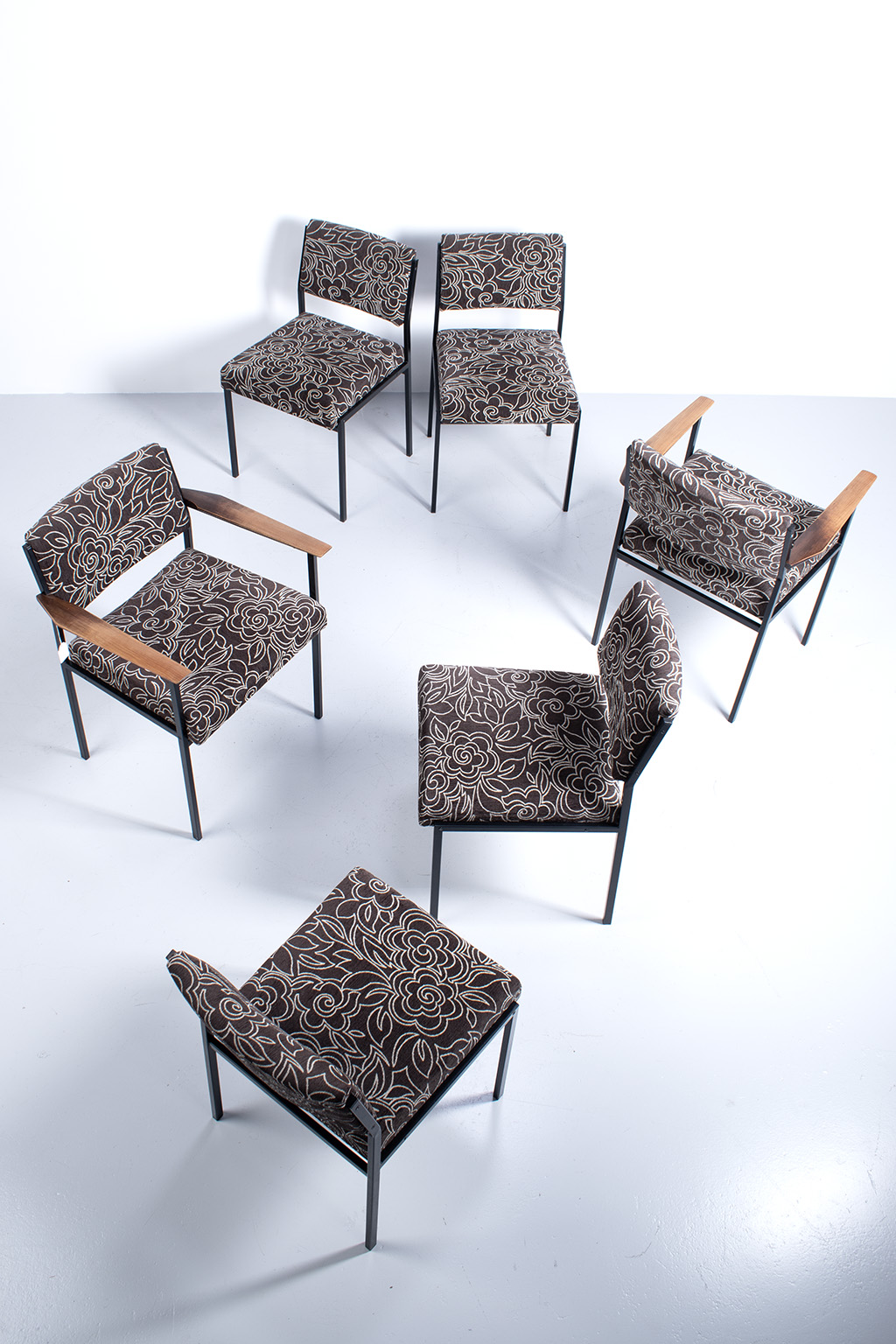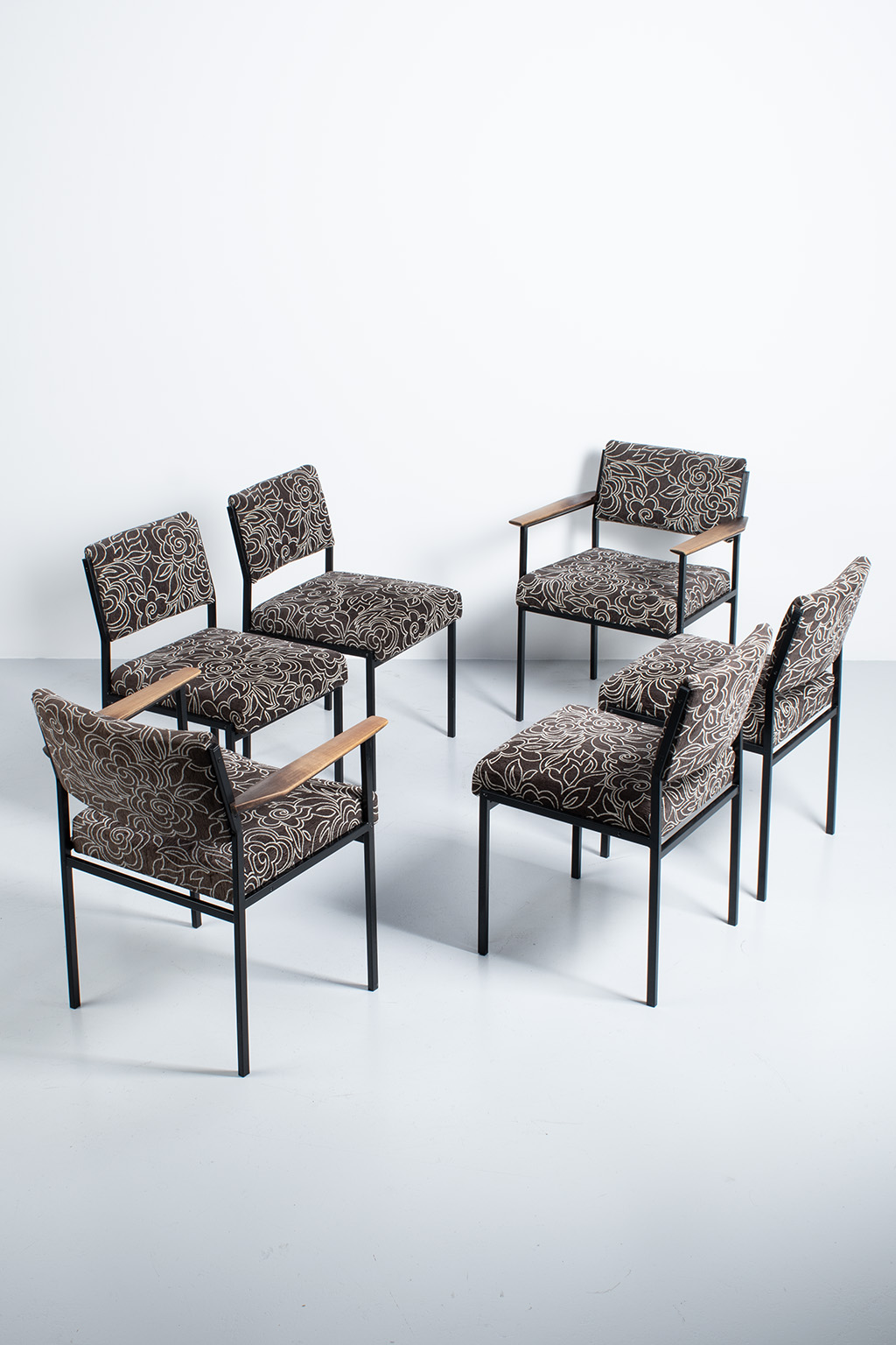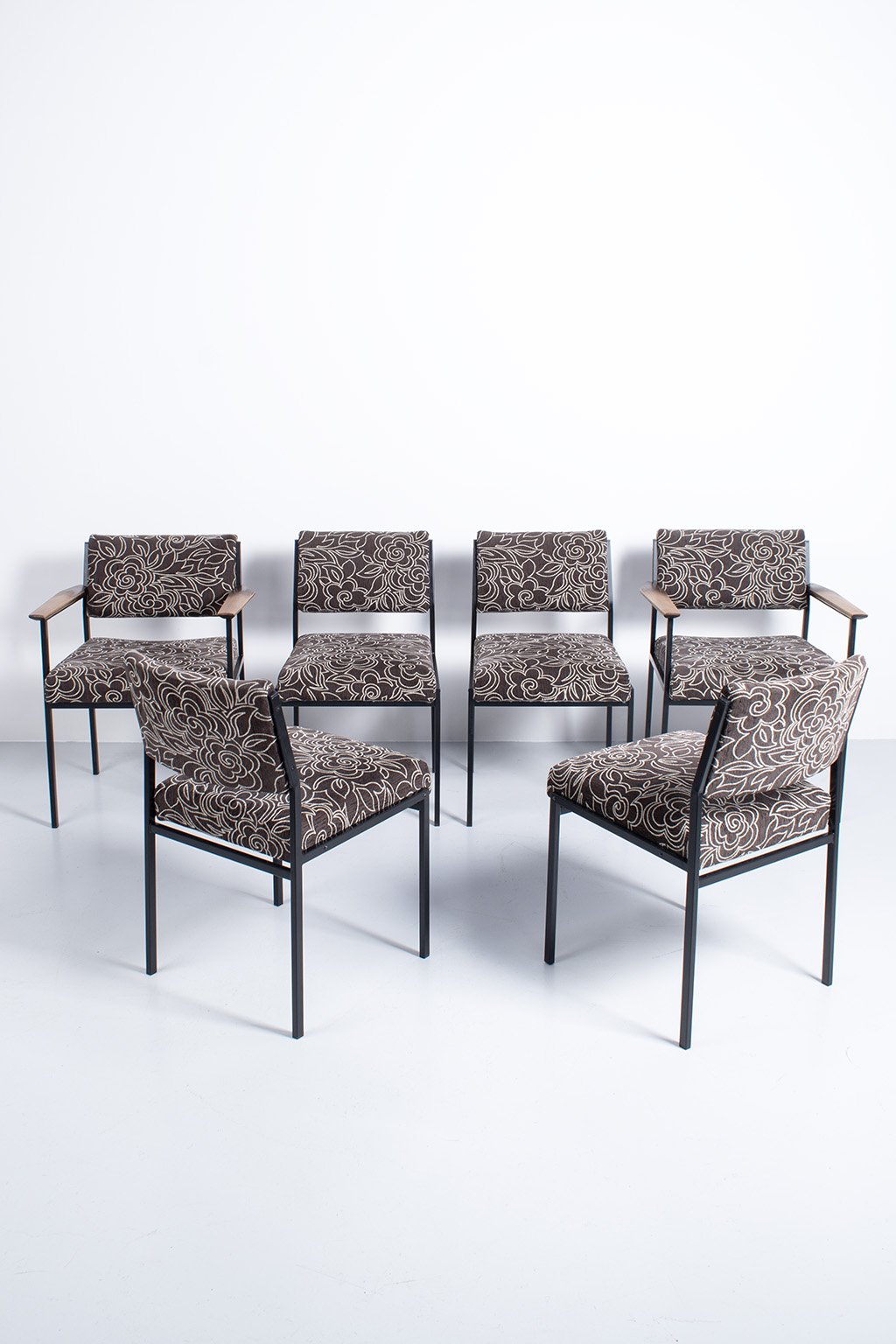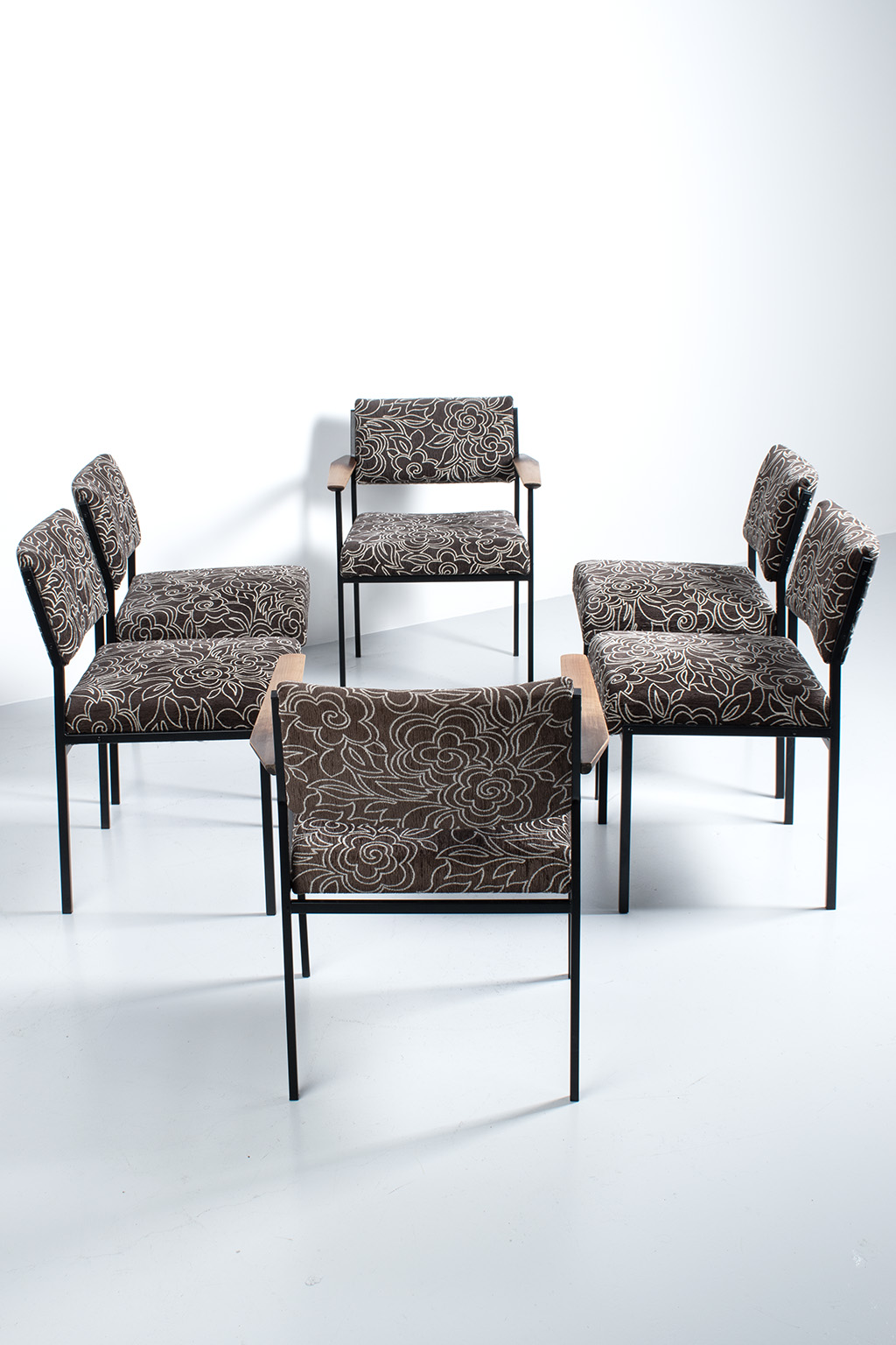 Set van 6 vintage stoelen met een leuke bloemenstof bekleed. De frames zijn van metaal en er zijn 2 stoelen met houten armleuningen. Deze zijn wat vlekkig maar verder prima in orde.