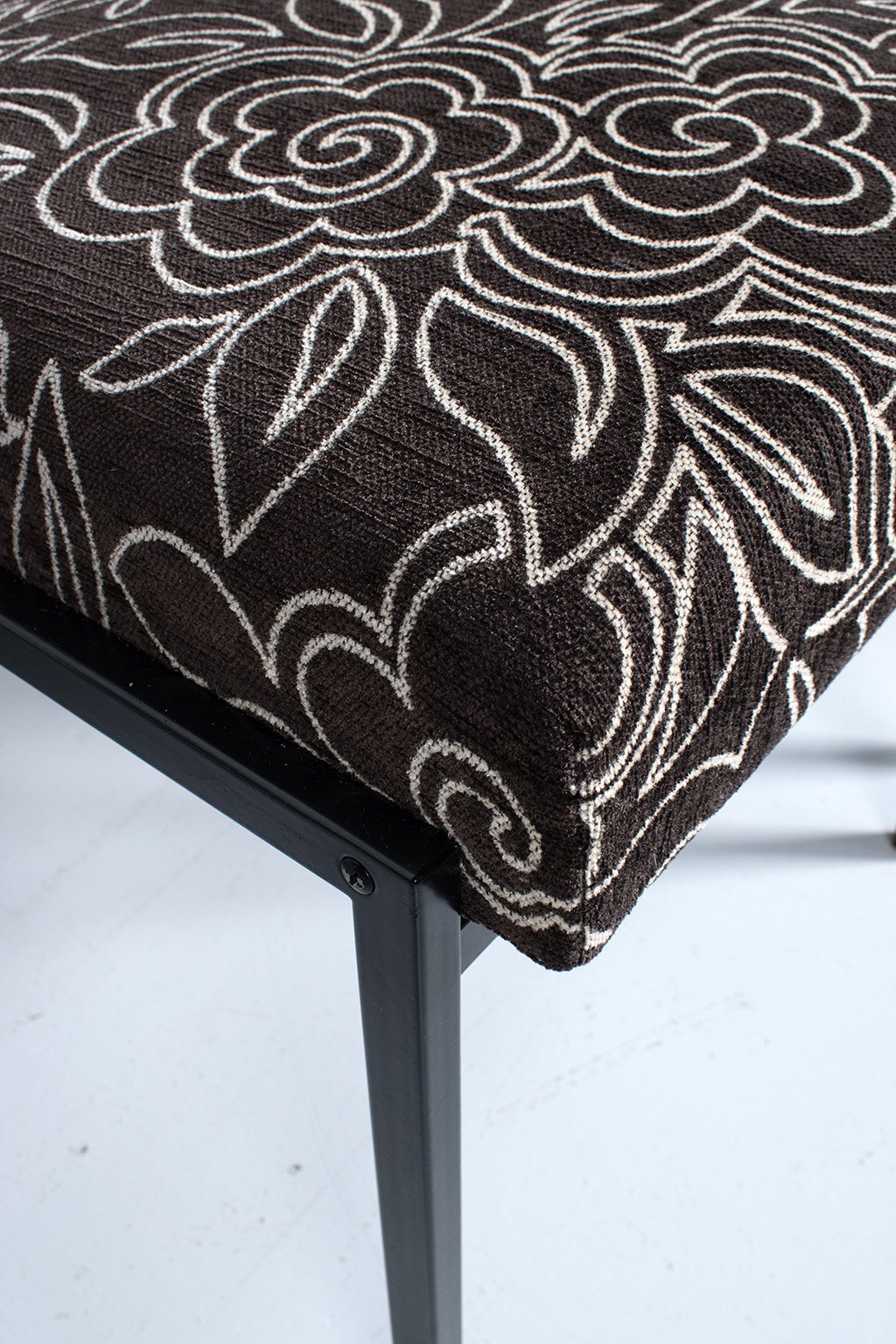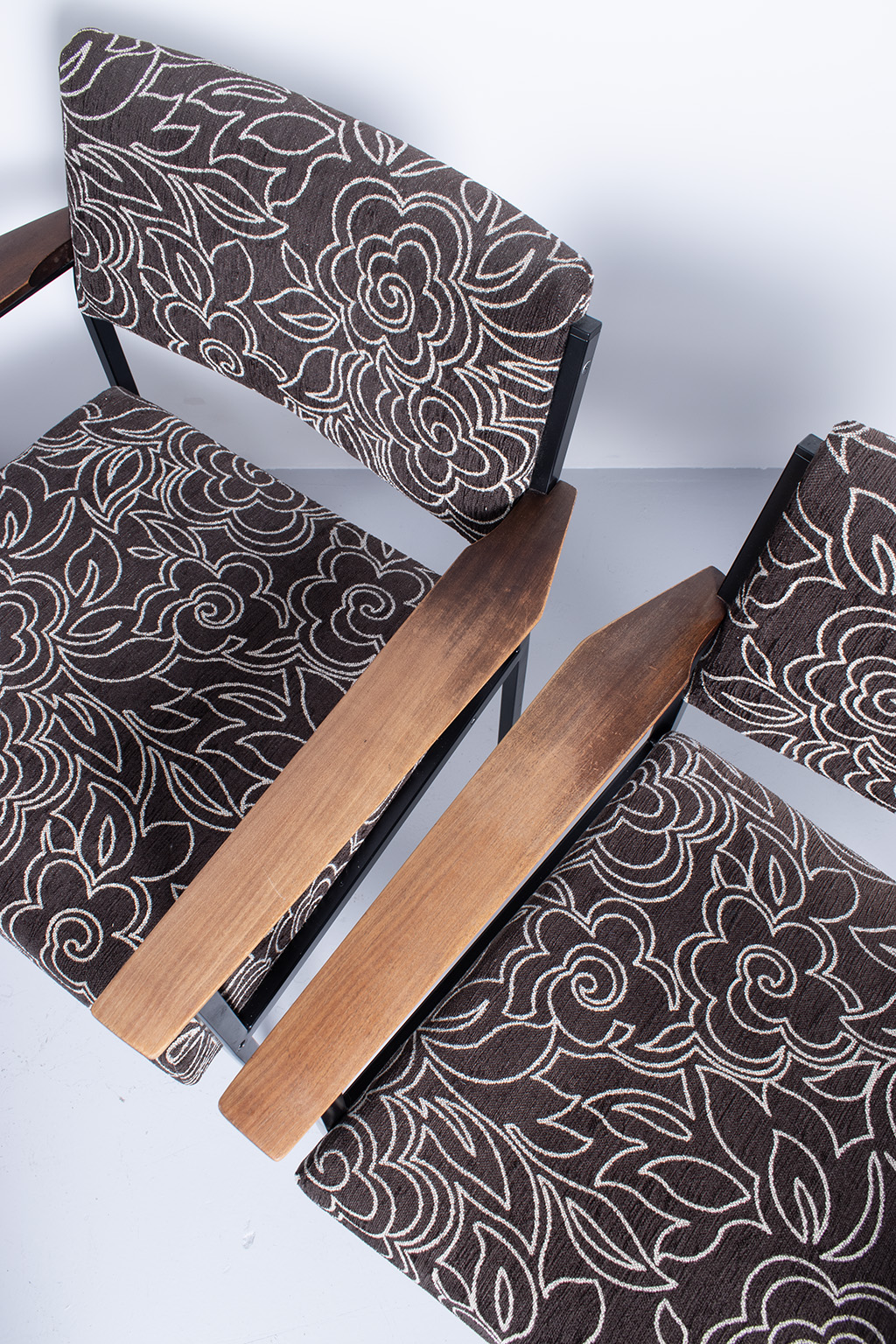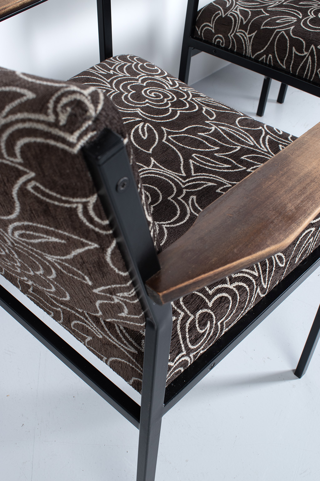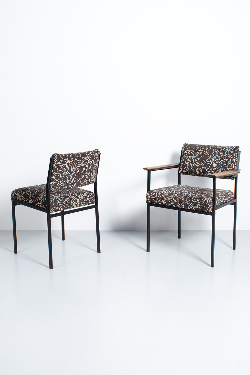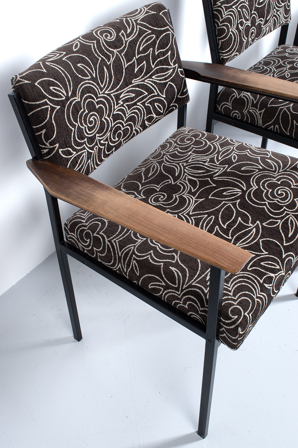 Set van 6 vintage stoelen met een leuke bloemenstof bekleed. De frames zijn van metaal en er zijn 2 stoelen met houten armleuningen. Deze zijn wat vlekkig maar verder prima in orde.
