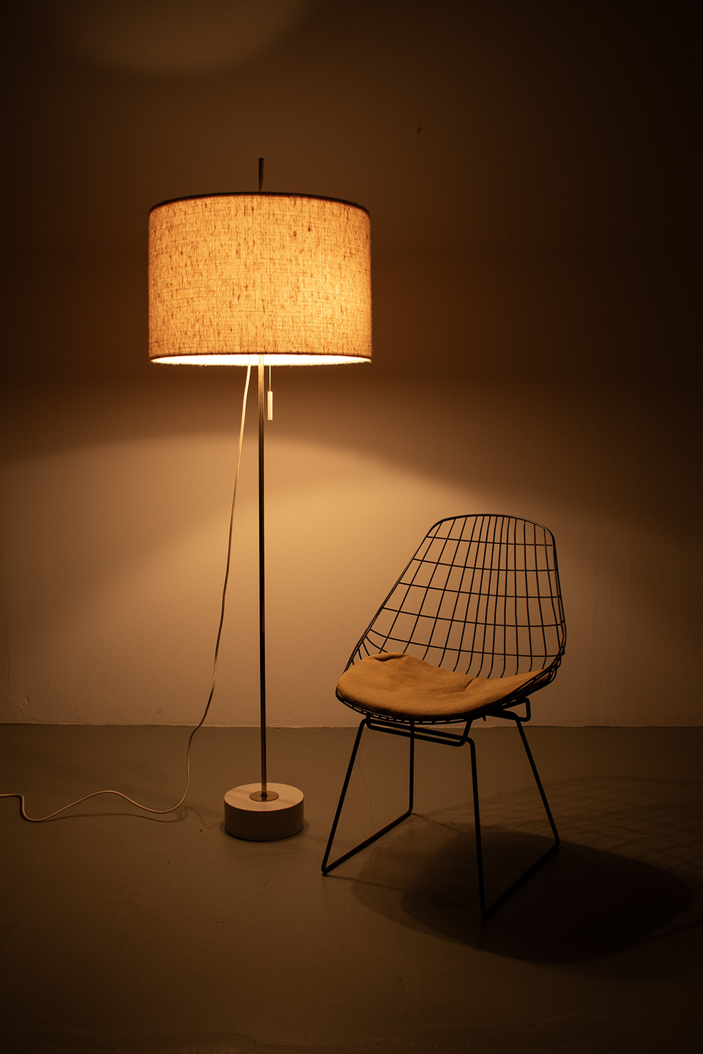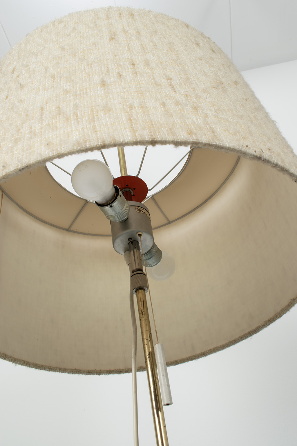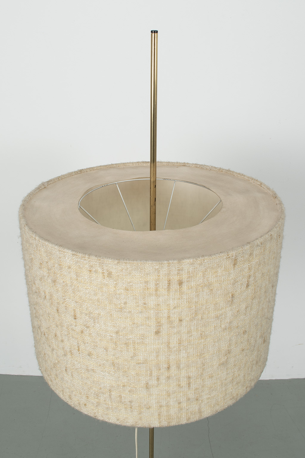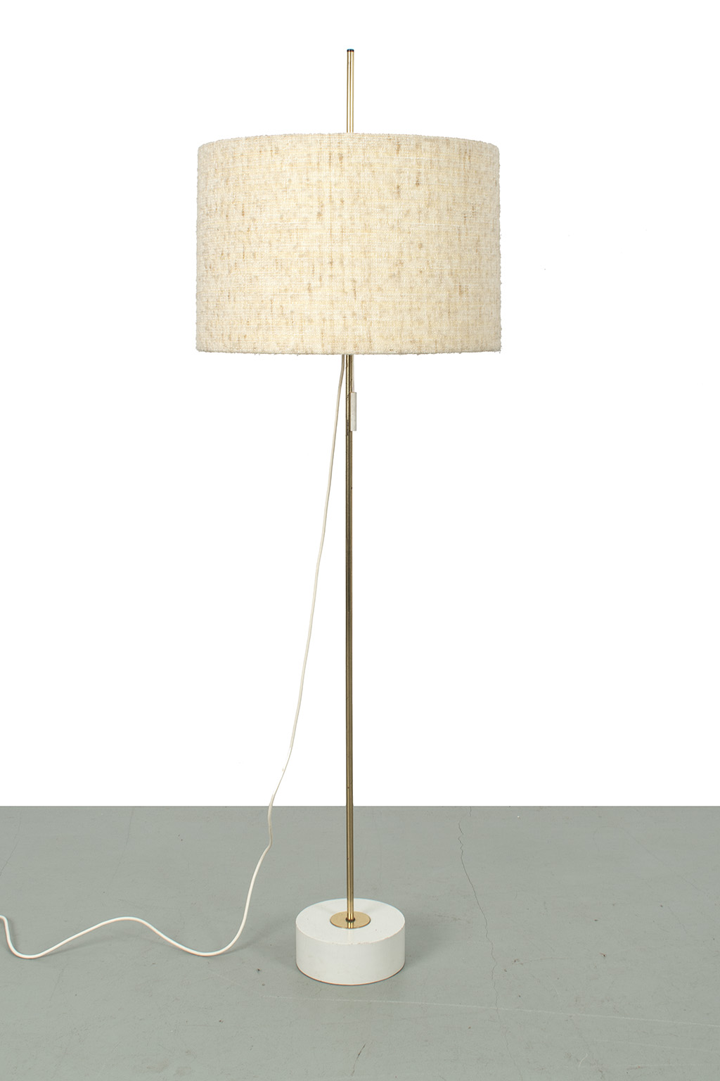 Temde Leuchten vloerlamp uit de jaren 60 met de originele stoffen kap. De lamp is verstelbaar langs de messingkleur stang. De zware voet is wit gelakt. De lamp heeft wat (te verwachten) patina en is verder in een goede vintage staat op wat lakschade van de voet na.