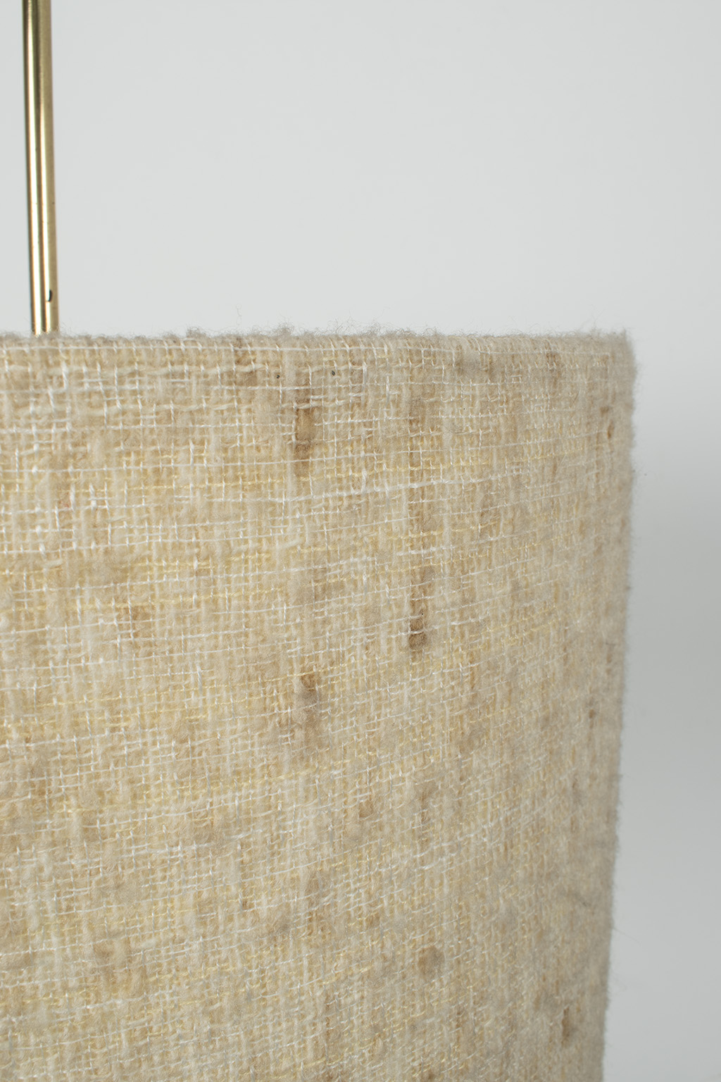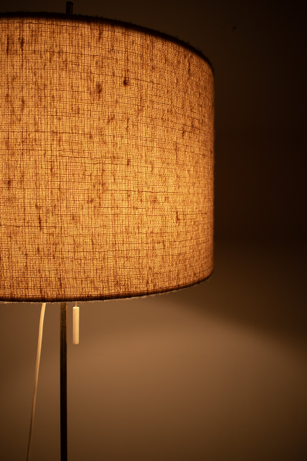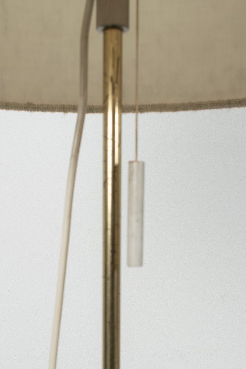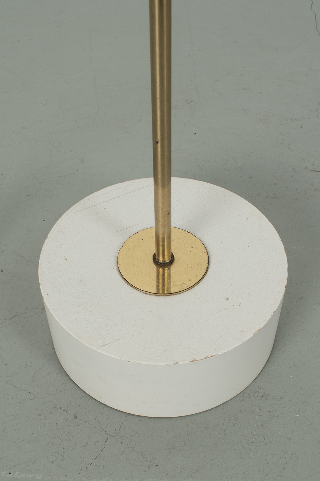 Temde Leuchten vloerlamp uit de jaren 60 met de originele stoffen kap. De lamp is verstelbaar langs de messingkleur stang. De zware voet is wit gelakt. De lamp heeft wat (te verwachten) patina en is verder in een goede vintage staat op wat lakschade van de voet na.