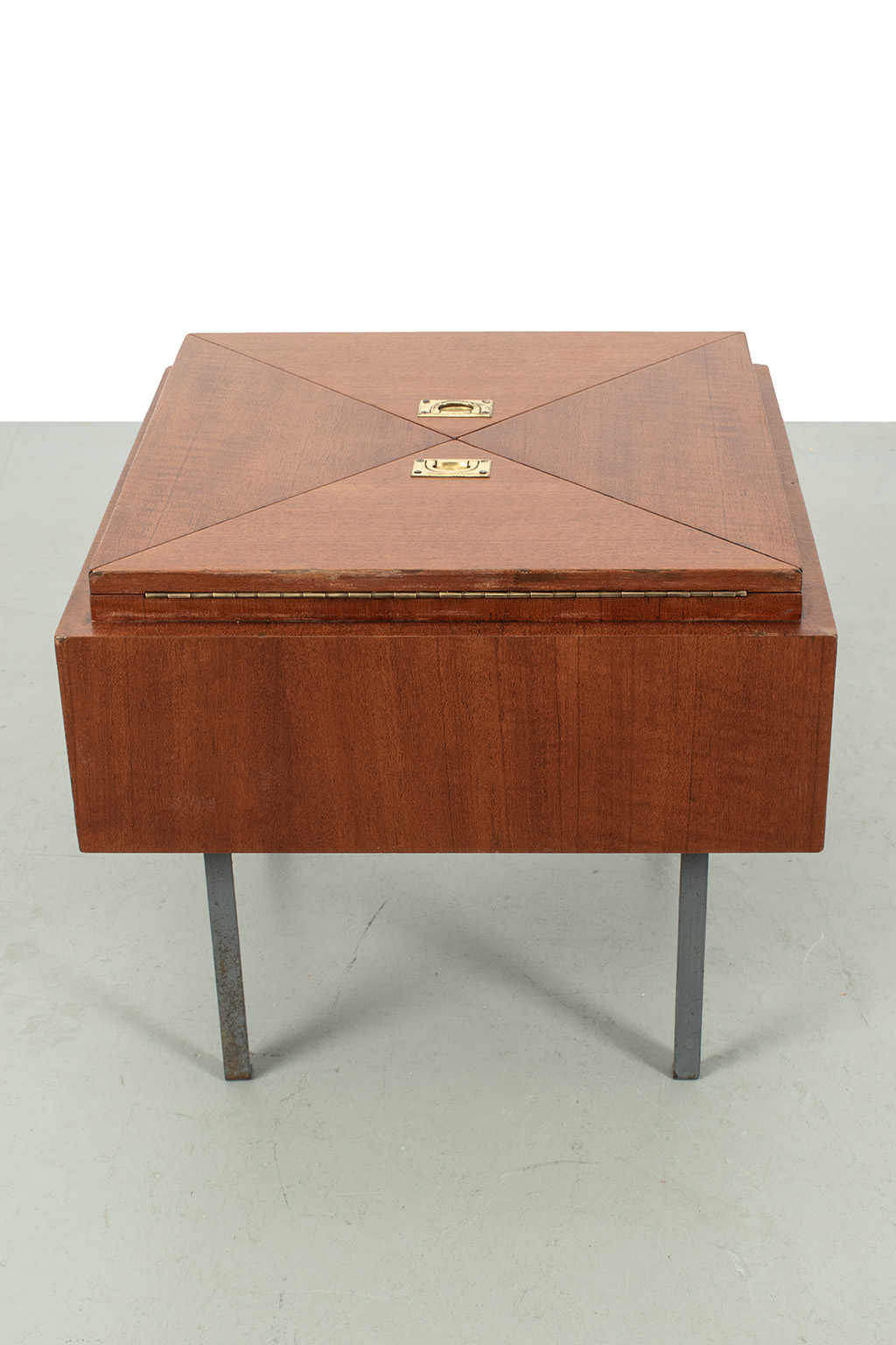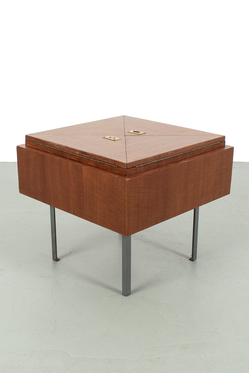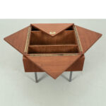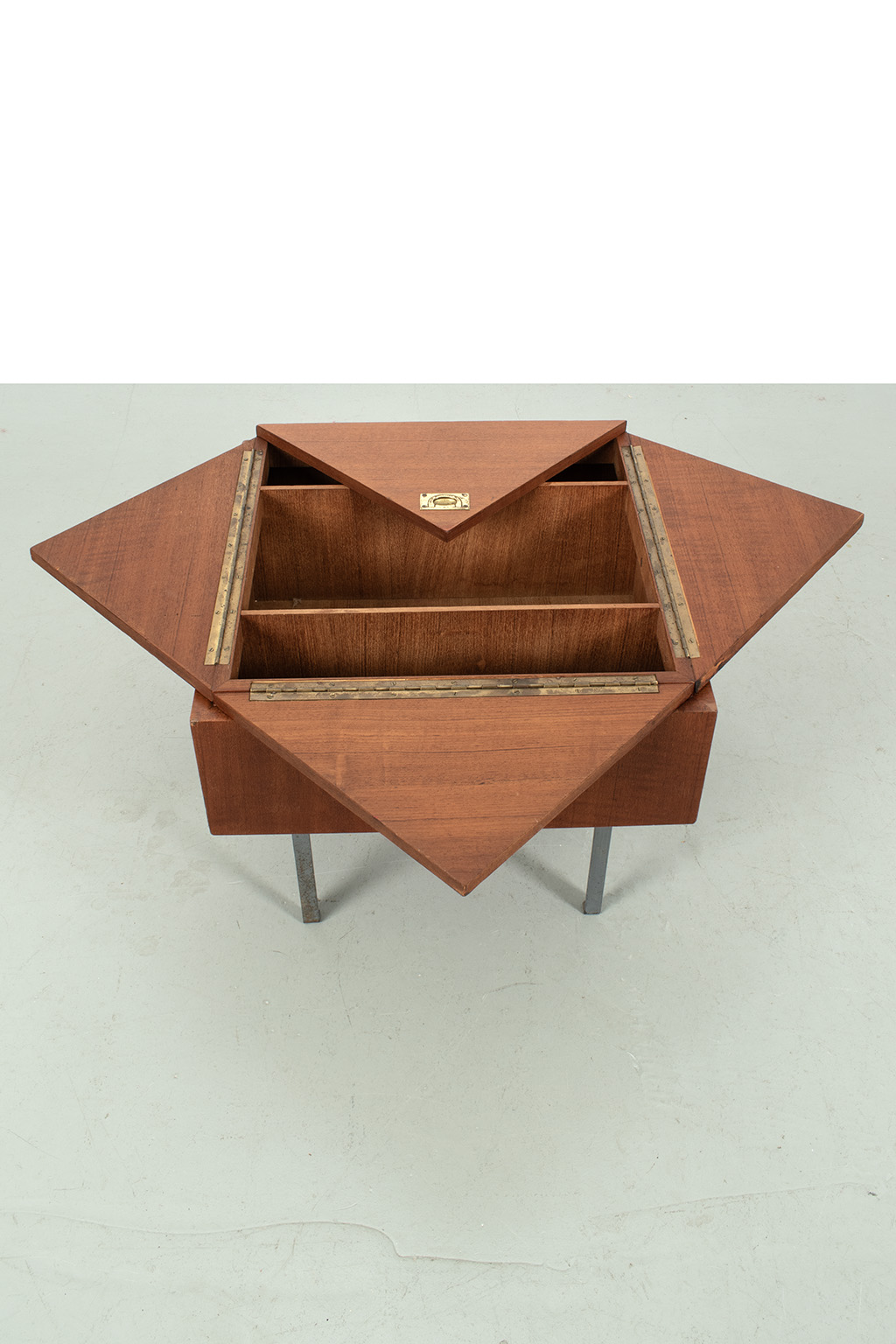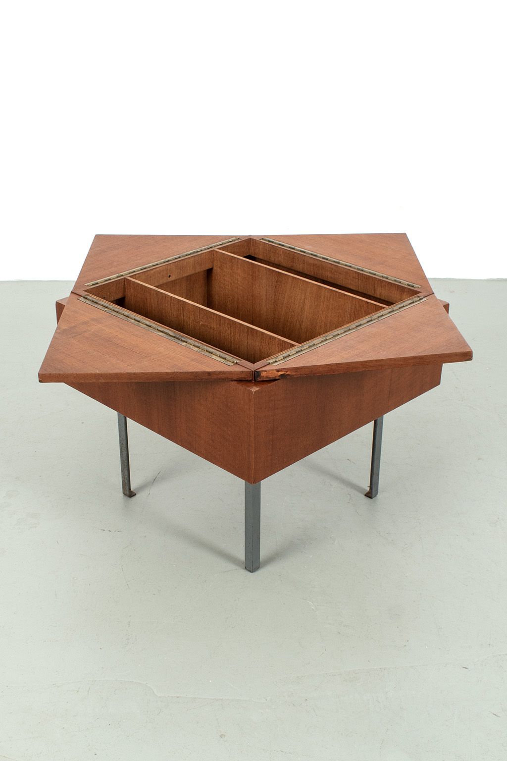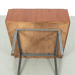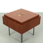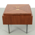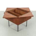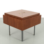 Uitklapbaar bijzettafeltje met opbergruimte. Middels de messingkleurige handgreepjes kun je het blad in 4 delen openen. Het teak fineer blok wordt ondersteund door een stalen frame. Het stevige frame heeft duidelijke sporen van ouderdom en het fineer is op meerdere plaatsen gerepareerd.