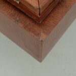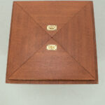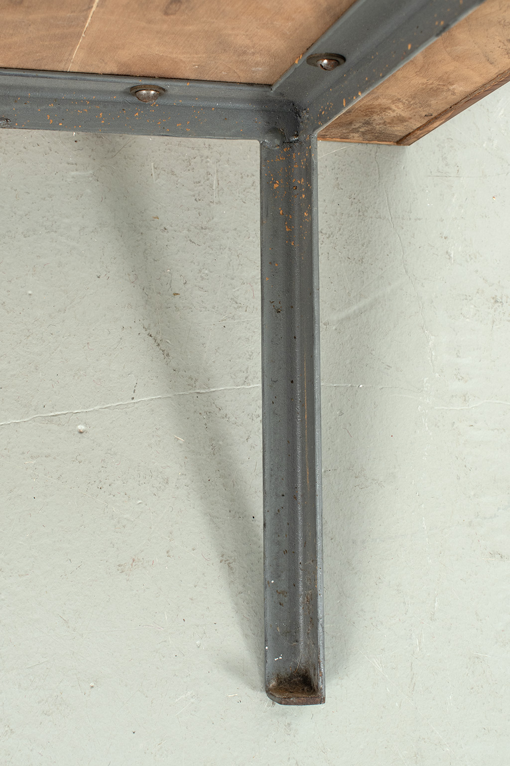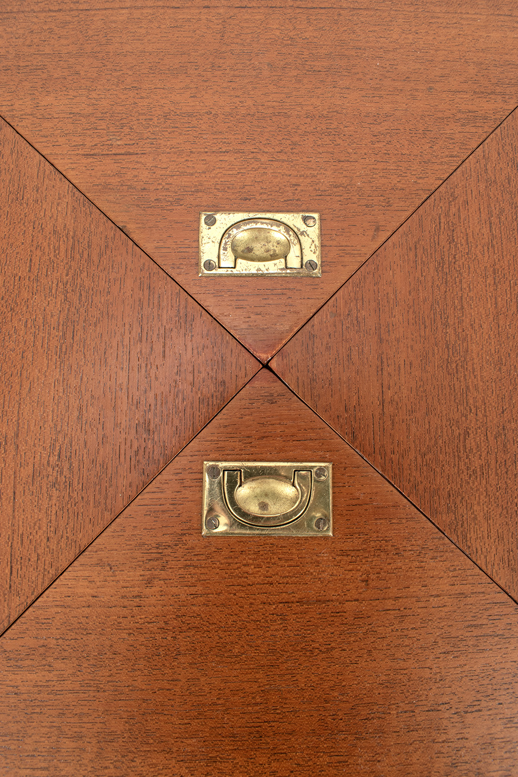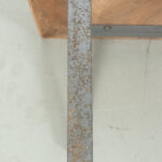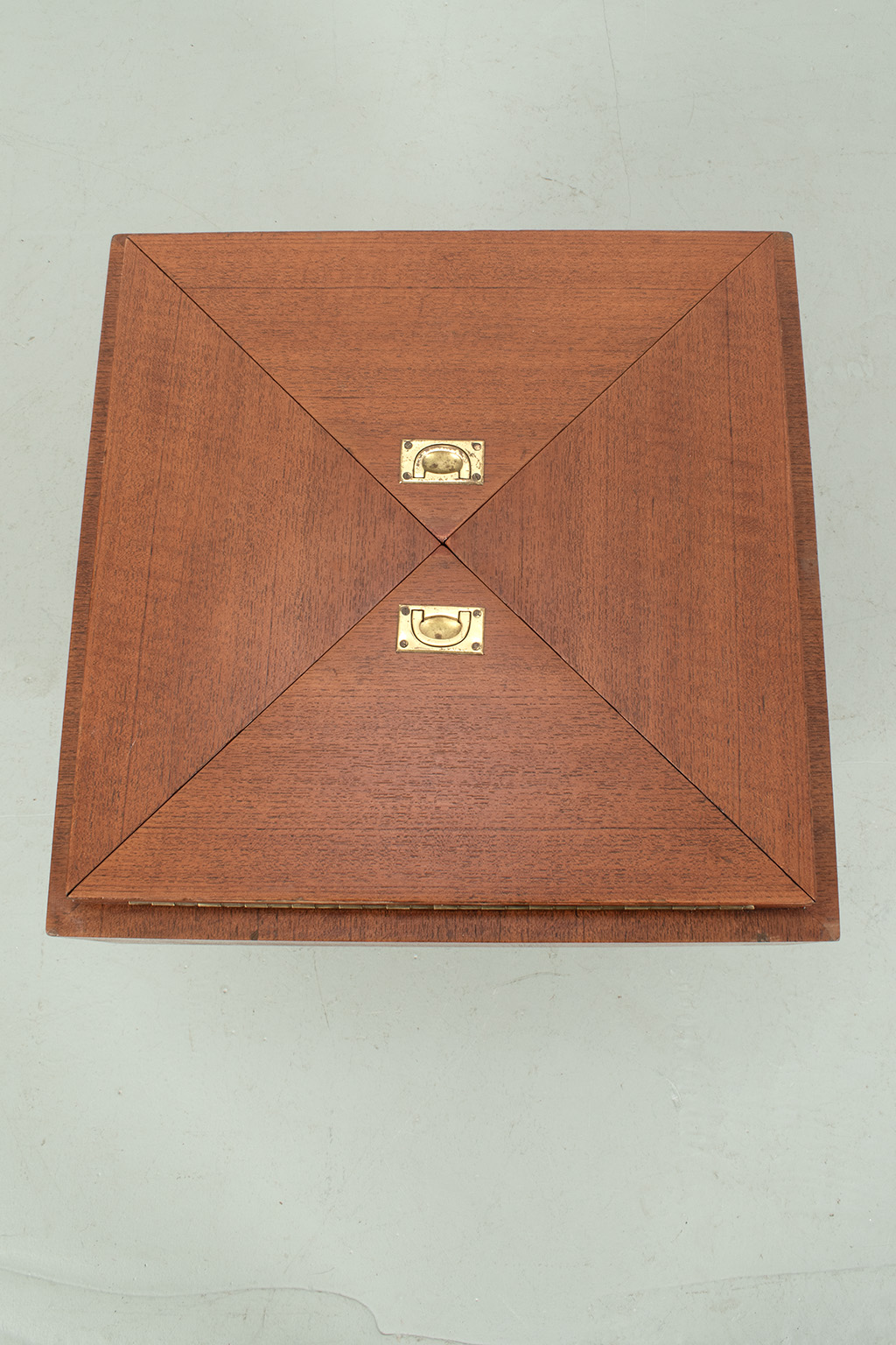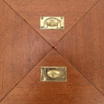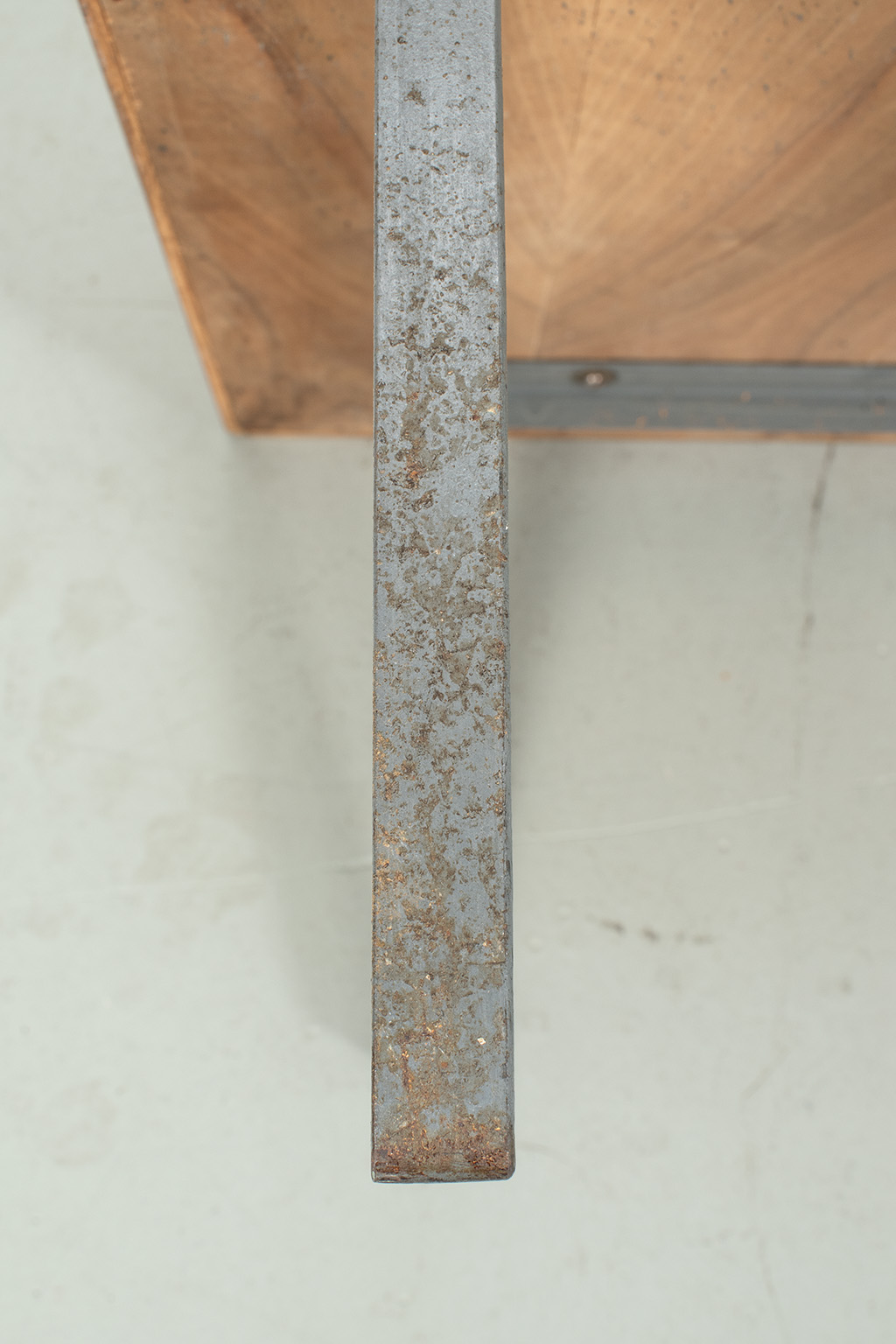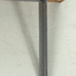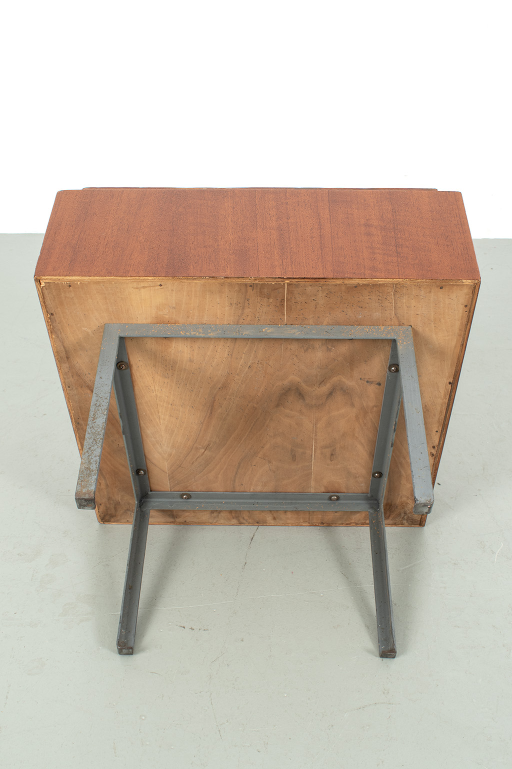 Uitklapbaar bijzettafeltje met opbergruimte. Middels de messingkleurige handgreepjes kun je het blad in 4 delen openen. Het teak fineer blok wordt ondersteund door een stalen frame. Het stevige frame heeft duidelijke sporen van ouderdom en het fineer is op meerdere plaatsen gerepareerd.