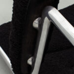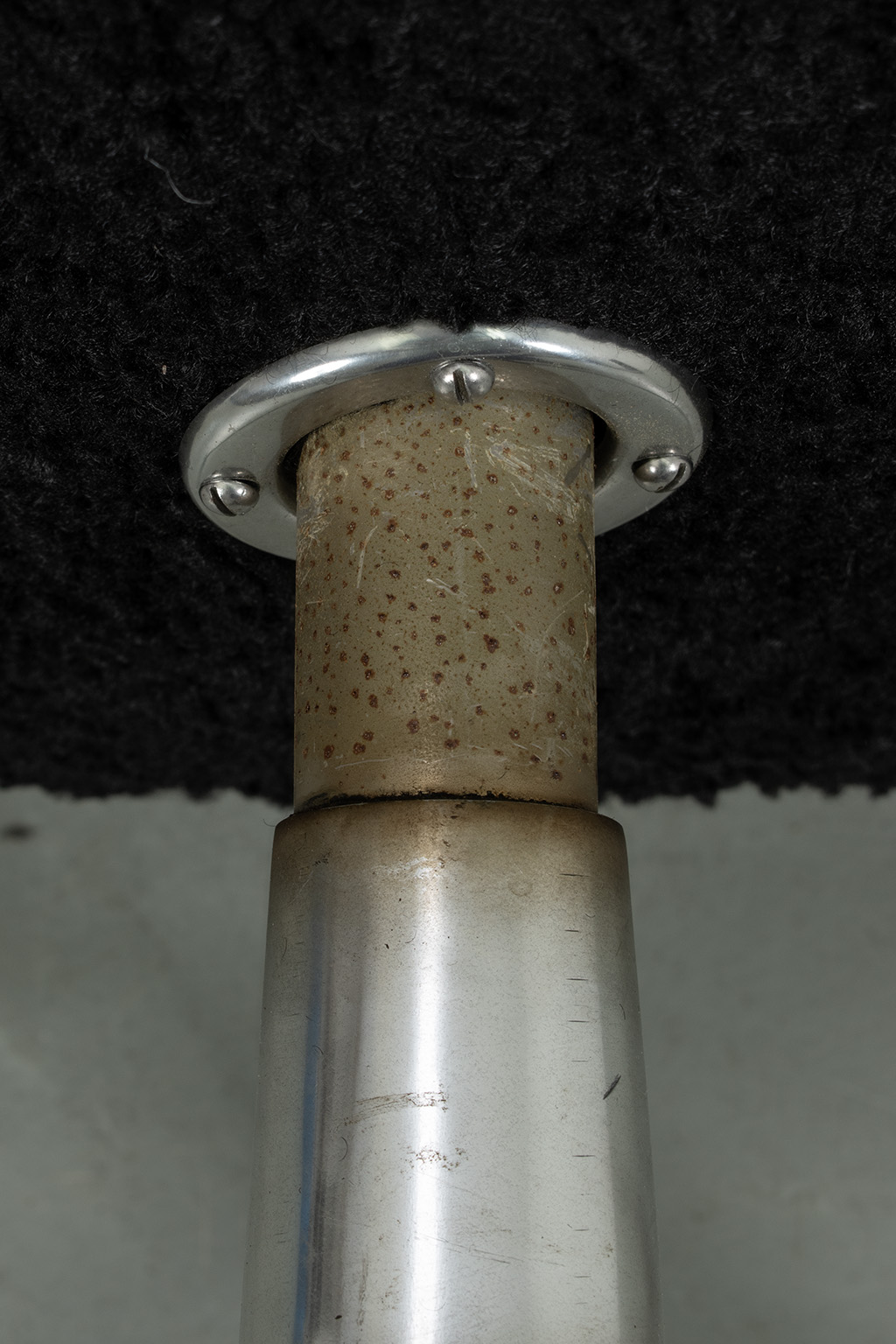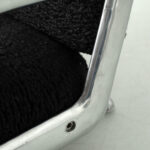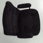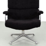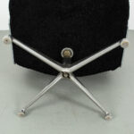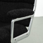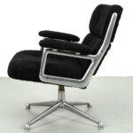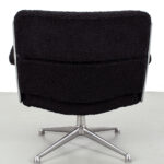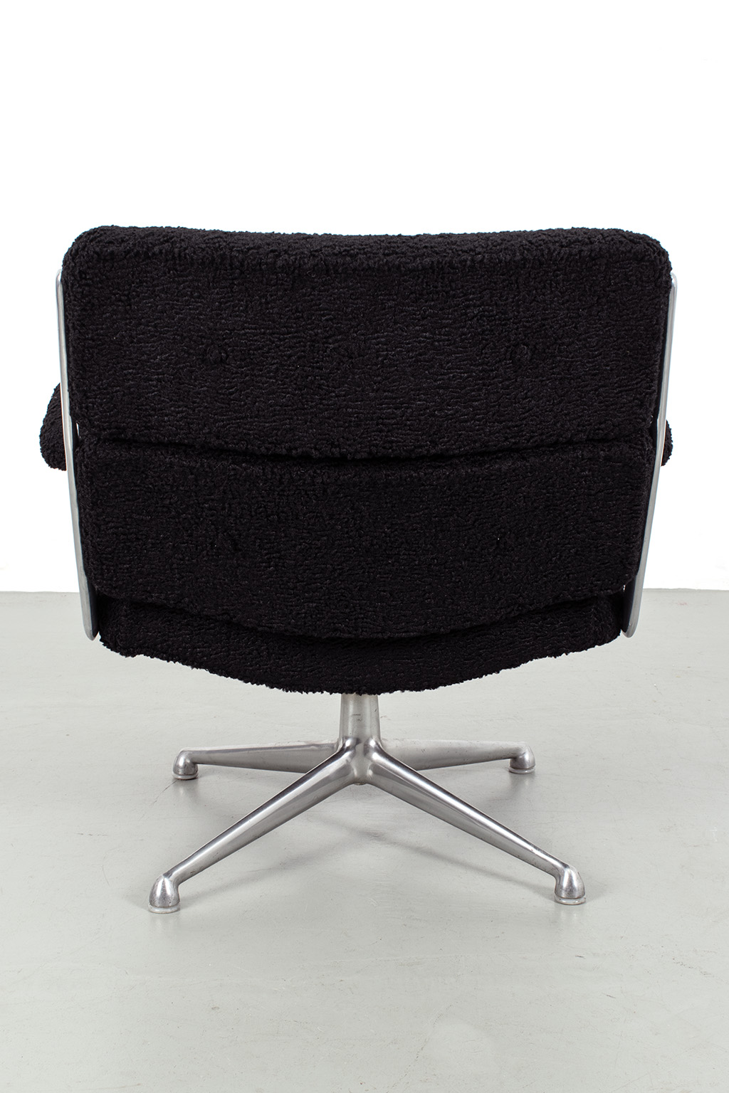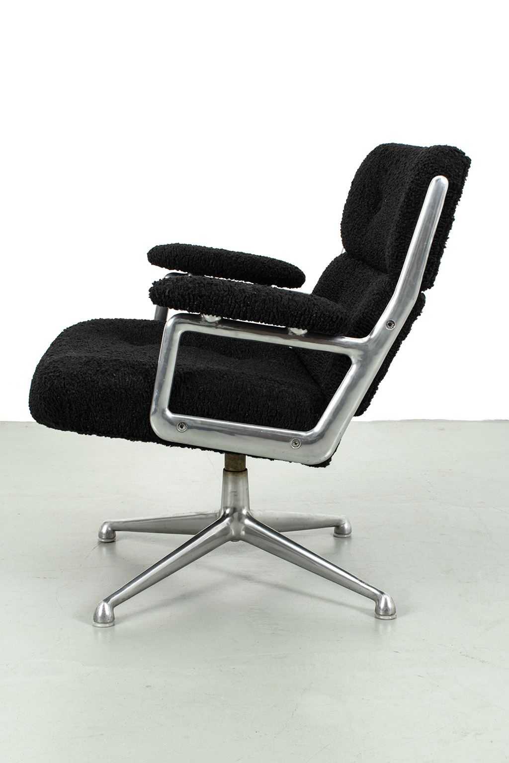 Vintage Eames Time Life Lobby chair met nieuwe bekleding. Het duo Charles & Ray Eames ontwierp deze stoel met modelnummer 675 in de jaren 60 met origineel lederen bekleding. Dit exemplaar is opnieuw gestoffeerd in een wollige zwarte stof. De fauteuil is draaibaar en heeft een aluminium frame met de zo kenmerkende Eames vormen. Het frame heeft wel wat gebruikssporen (zie foto’s) maar de stoel is nog in goede vintage staat.