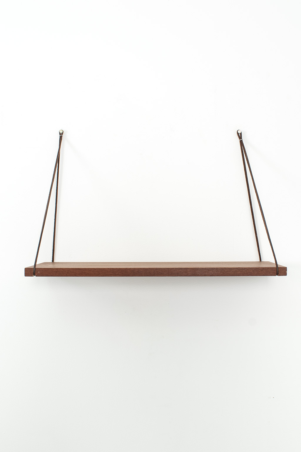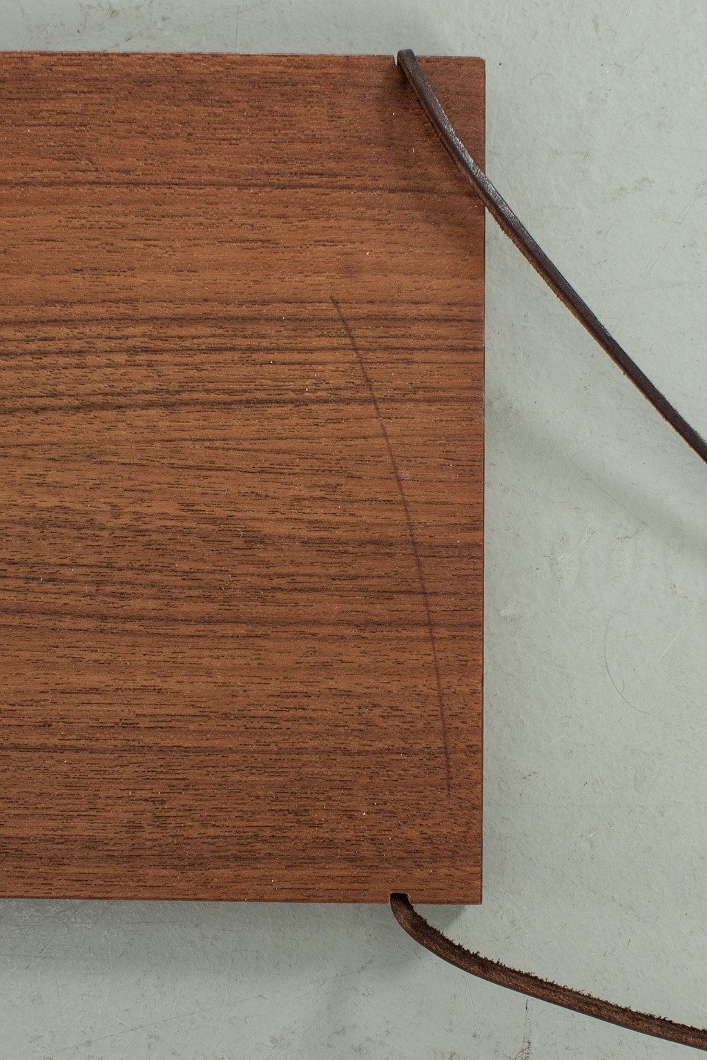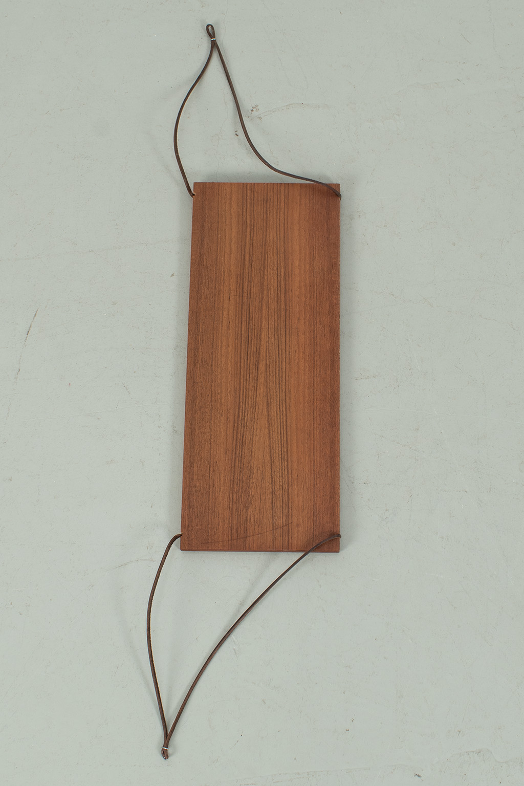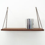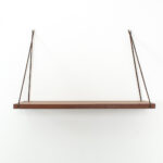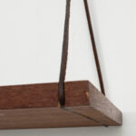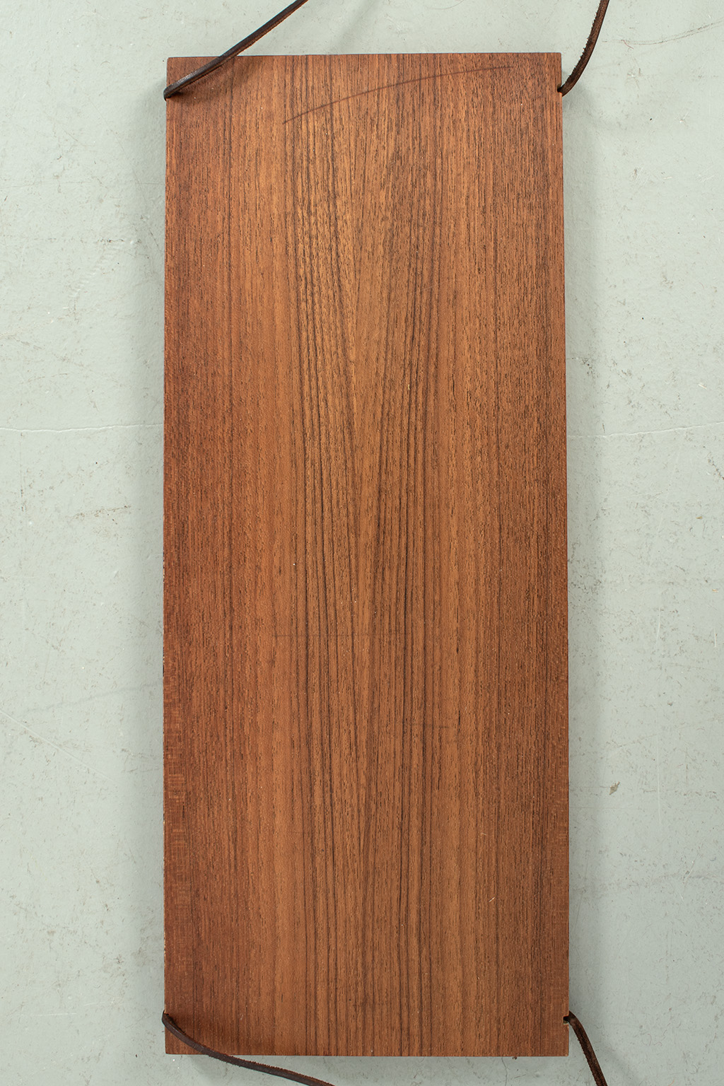 Wandplankje met lederen koordjes. Het plankje is gemaakt van teak fineer. Het heeft wel een kras maar verder is dit plankje in een goede vintage staat.