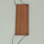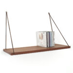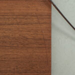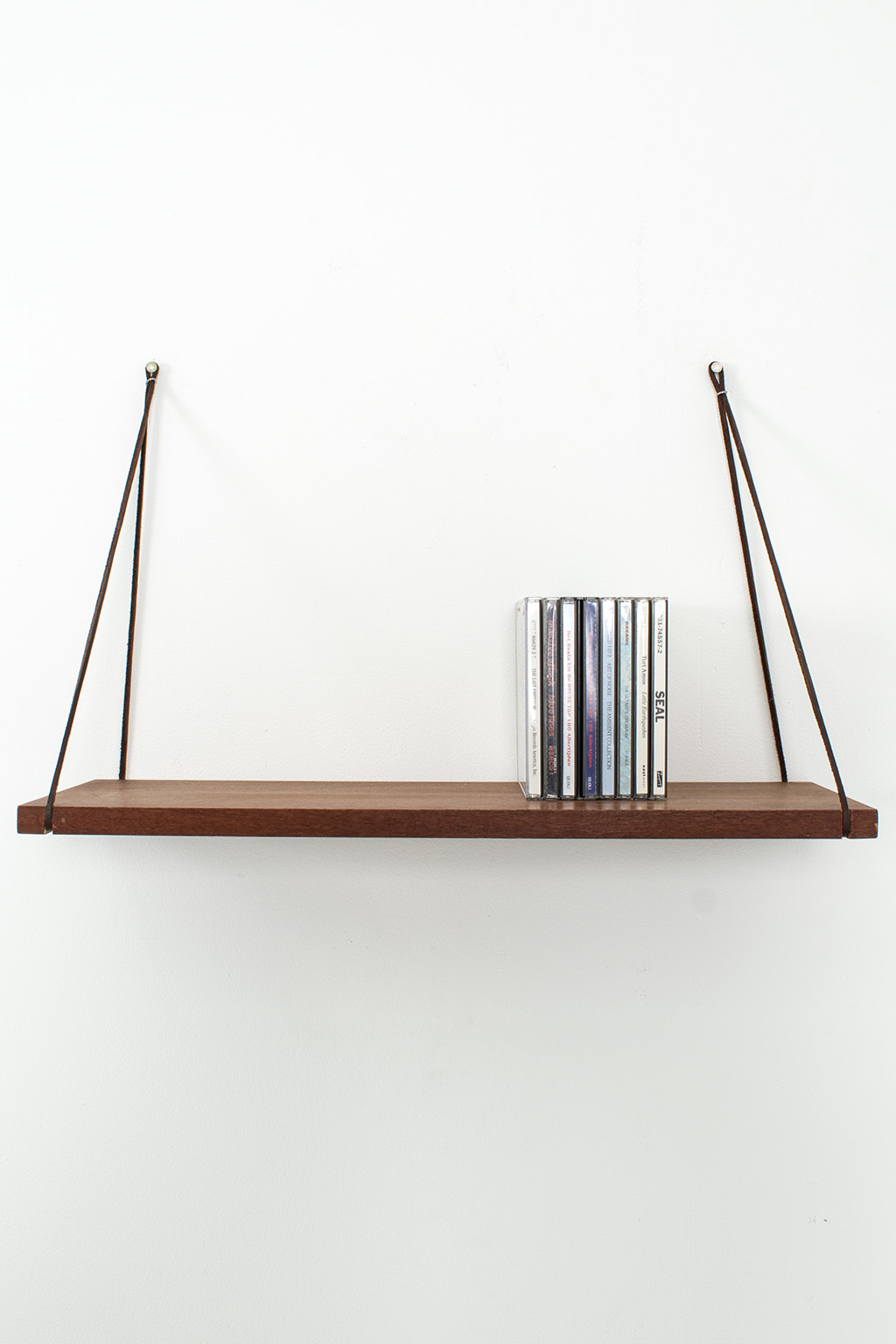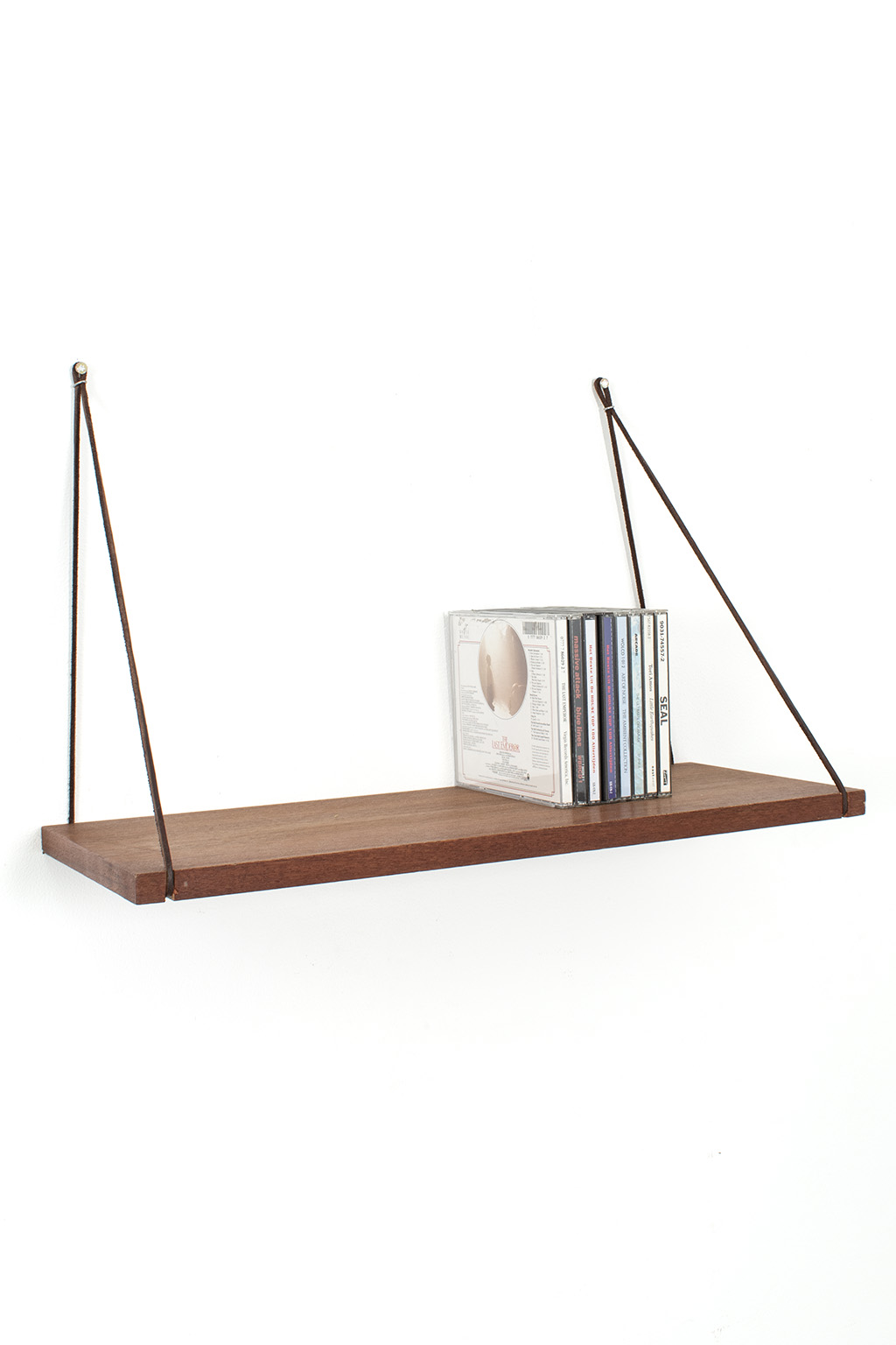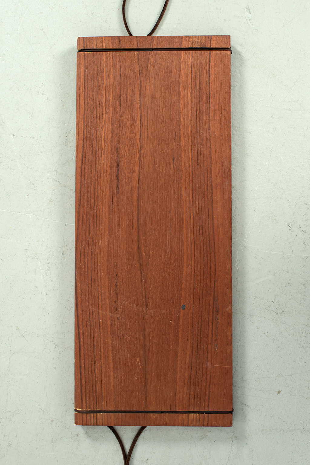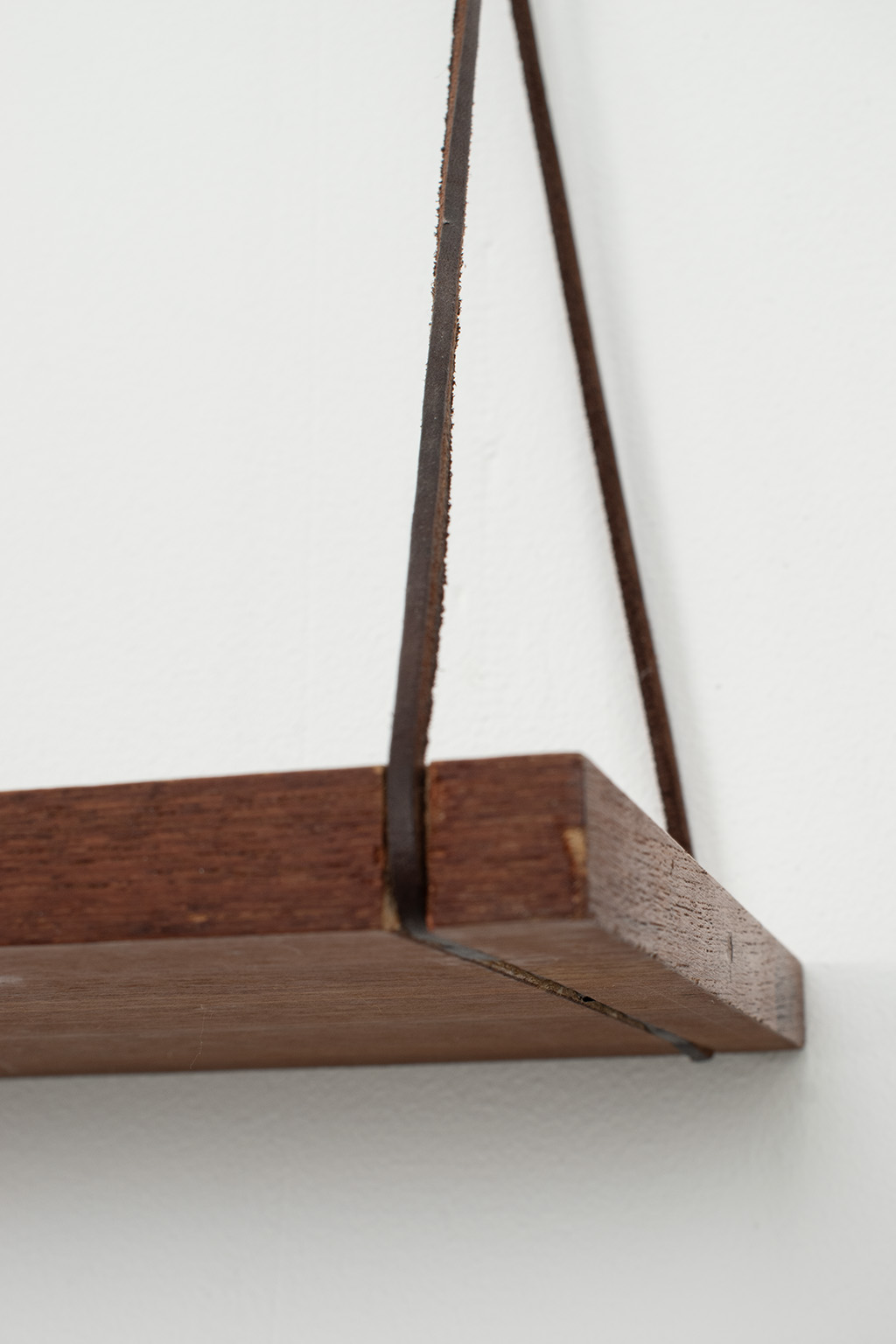 Wandplankje met lederen koordjes. Het plankje is gemaakt van teak fineer. Het heeft wel een kras maar verder is dit plankje in een goede vintage staat.