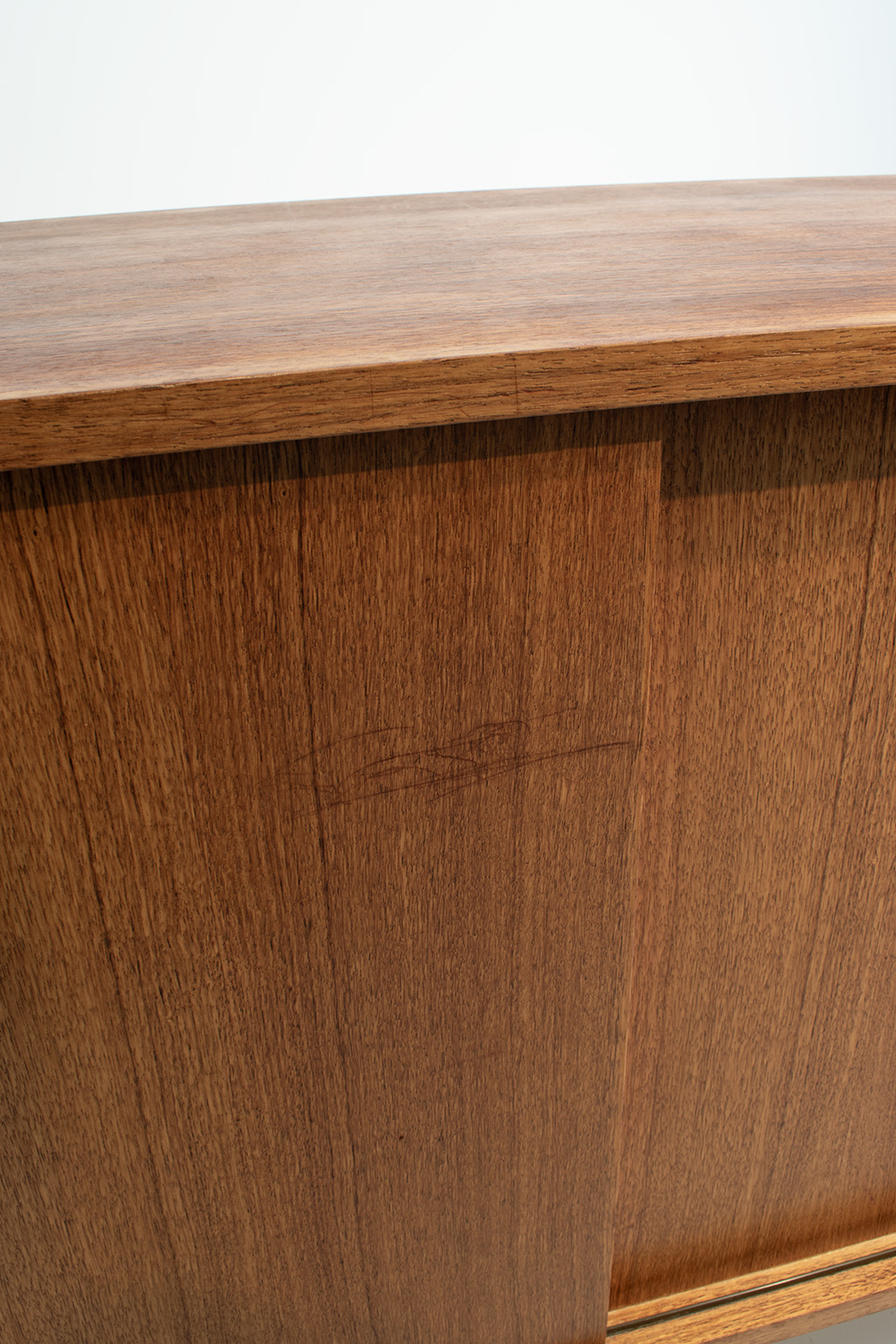 Wilhelm Renz dressoir voor Walter Wirz. Een EXTRA LANG dressoir in teak fineer en met stalen poten. Een strak model zoals we van Wilhelm Renz gewend zijn en met alle functionaliteit die je wilt. De planken in de kast staan op de foto in de laagste stand maar kunnen nog 2 stappen hoger. De bovenzijde is wat vlekkerig maar verder is deze kast in een prima vintage staat.
